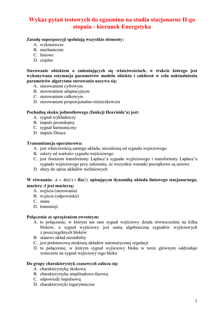 Wykaz pytań testowych do egzaminu na studia stacjonarne II-go stopnia - kierunek Energetyka Zasadę superpozycji spełniają wszystkie elementy: A. wykonawcze B. mechaniczne C. liniowe D. cieplne Sterowanie obiektem o zmieniających się właściwościach, w trakcie którego jest wykonywana estymacja parametrów modelu obiektu i zakłóceń w celu uaktualnienia parametrów algorytmu sterowania nazywa się: A. sterowaniem cyfrowym B. sterowaniem adaptacyjnym C. sterowaniem całkowym D. sterowaniem proporcjonalno-różniczkowym Pochodną skoku jednostkowego (funkcji Heaviside’a) jest: A. sygnał wykładniczy B. impuls prostokątny C. sygnał harmoniczny D. impuls Diraca Transmitancja operatorowa: A. jest właściwością samego układu, niezależną od sygnału wejściowego B. zależy od wartości sygnału wejściowego C. jest ilorazem transformaty Laplace’a sygnału wyjściowego i transformaty Laplace’a sygnału wejściowego przy założeniu, że wszystkie warunki początkowe są zerowe D. służy do opisu układów nieliniowych W równaniu: x& = Ax (t ) + Bu(t ) opisującym dynamikę układu liniowego stacjonarnego, macierz A jest macierzą: A. wejścia (sterowania) B. wyjścia (odpowiedzi) C. stanu D. transmisji Połączenie ze sprzężeniem zwrotnym: A. to połączenie, w którym ten sam sygnał wejściowy działa równocześnie na kilka bloków, a sygnał wyjściowy jest sumą algebraiczną sygnałów wyjściowych z poszczególnych bloków B. stanowi układ niestabilny C. jest podstawową strukturą układów automatycznej regulacji D. to połączenie, w którym sygnał wyjściowy bloku w torze głównym oddziałuje wstecznie na sygnał wejściowy tego bloku Do grupy charakterystyk czasowych zalicza się: A. charakterystykę skokową B. charakterystykę amplitudowo-fazową C. odpowiedź impulsową D. charakterystyki logarytmiczne 1 Transmitancja operatorowa w postaci: G ( s ) = A. B. C. D. 2 jest transmitancją: 3s + 1 elementu różniczkującego rzeczywistego elementu oscylacyjnego elementu inercyjnego pierwszego rzędu regulatora proporcjonalnego Zakładając, że L, M są wektorami współczynników występujących przy kolejnych potęgach zmiennej s odpowiednio w liczniku i mianowniku transmitancji operatorowej elementu automatyki, do wykreślenia charakterystyki amplitudowo-fazowej tego elementu w pakiecie MATLAB należy użyć instrukcji: A. nyquist(L,M) B. step(L,M) C. bode(L,M) D. printsys(L,M,’s’) Logarytmiczna charakterystyka amplitudowa L(ω ) elementu o transmitancji widmowej G ( jω ) jest wykreślana zgodnie z formułą: A. L(ω ) = ln G ( jω ) B. L(ω ) = ln 20G ( jω ) C. L(ω ) = log 20G ( jω ) D. L(ω ) = 20 log G ( jω ) Obiekty astatyczne: A. to obiekty bez działania całkującego B. to obiekty, których wartość odpowiedzi skokowej dąży do nieskończoności C. to obiekty z samowyrównaniem D. to obiekty, których wartość odpowiedzi skokowej dąży do wartości skończonej Poniższy przebieg stanowi: amplituda 15 10 5 0 0 A. B. C. D. 2 4 6 8 10 czas secs skokow ą odpowiedź elementu inercyjnego pierwszego rzędu odpowiedź impulsową elementu inercyjnego pierwszego rzędu odpowiedź impulsową elementu inercyjnego drugiego rzędu odpowiedź skokową elementu różniczkującego rzeczywistego (z inercją) 2 Układ stabilny asymptotycznie może posiadać: A. jeden pierwiastek równania charakterystycznego leżący w prawej półpłaszczyźnie zmiennej zespolonej B. jedną parę sprzężonych pierwiastków równania charakterystycznego leżących na osi urojonej C. dwukrotny pierwiastek rzeczywisty zerowy D. cztery pierwiastki równania charakterystycznego leżące w lewej półpłaszczyźnie zmiennej zespolonej Kryterium Nyquista służy do oceny stabilności układu zamkniętego: A. tylko w sytuacji, gdy układ otwarty (otrzymany poprzez przerwanie pętli sprzężenia zwrotnego) jest niestabilny B. tylko w sytuacji, gdy układ otwarty (otrzymany poprzez przerwanie pętli sprzężenia zwrotnego) jest stabilny C. na podstawie charakterystyki częstotliwościowej układu otwartego (otrzymanego poprzez przerwanie pętli sprzężenia zwrotnego) D. w sytuacji, gdy układ zamknięty nie spełnia kryterium Hurwitza Czas regulacji tr: A. jest związany z największą stałą czasową układu regulacji B. to czas potrzebny, aby odpowiedź układu regulacji osiągnęła połowę wartości ustalonej C. to czas potrzebny, aby odpowiedź układu regulacji osiągnęła i pozostała w otoczeniu wartości ustalonej D. to czas potrzebny, aby odpowiedź układu regulacji osiągnęła pierwszy szczyt przeregulowania Transmitancja regulatora proporcjonalno-całkowo-różniczkowego (idealnego) ma 1 postać: G ( s ) = K p 1 + + Td s . Stała czasowa Ti jest nazywana: Ti s A. czasem wyprzedzenia B. czasem opóźnienia C. czasem zdwojenia D. czasem całkującym Działanie całkowego algorytmu sterowania: A. jest proporcjonalne do wartości uchybu B. niweluje uchyb w stanie ustalonym C. jest proporcjonalne do szybkości zmian wartości uchybu D. redukuje czas regulacji Podstawowa metoda Zieglera-Nicholsa doboru nastaw regulatora PID w układzie automatycznej regulacji: A. polega na wyłączeniu działania algorytmu całkowego, a następnie wyznaczeniu takiego wzmocnienia regulatora, przy którym układ zamknięty znajduje się na granicy stabilności B. wymaga wyznaczenia okresu drgań krytycznych C. polega na wyłączeniu działania algorytmu całkowego i różniczkowego, a następnie wyznaczeniu wzmocnienia krytycznego regulatora D. umożliwia dobór nastaw regulatorów: P, PI, PID 3 Aby zamodelować w środowisku Simulink obiekt liniowy stacjonarny opisany macierzowym równaniem stanu i wyjścia, należy użyć bloku: A. Transfer Fcn B. State-Space C. Step D. Scope Automat, w którym stan wyjść zależy jedynie od stanu wewnętrznego to: A. układ autonomiczny B. automat Moore’a C. układ asynchroniczny D. automat Mealy’ego Nośnikami prądu w półprzewodnikach s