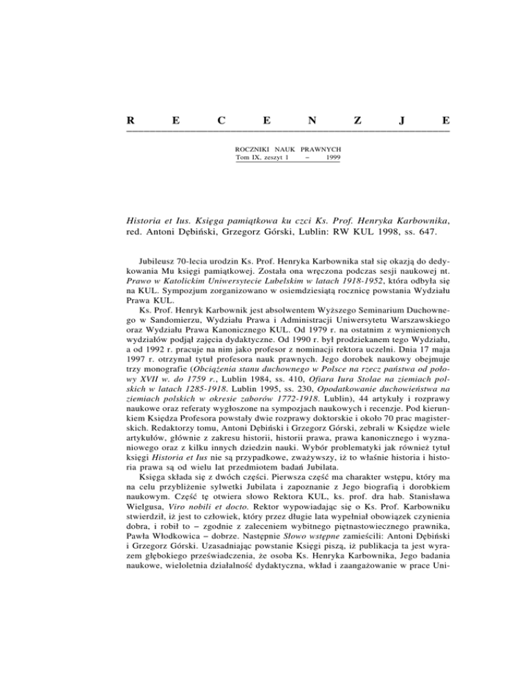 R E C E N Z J E ________________________________________________________ ROCZNIKI NAUK PRAWNYCH Tom IX, zeszyt 1 − 1999 Historia et Ius. Ksie˛ga pamiatkowa ˛ ku czci Ks. Prof. Henryka Karbownika, red. Antoni De˛biński, Grzegorz Górski, Lublin: RW KUL 1998, ss. 647. Jubileusz 70-lecia urodzin Ks. Prof. Henryka Karbownika stał sie˛ okazja˛ do dedykowania Mu ksie˛gi pamiatkowej. ˛ Została ona wre˛czona podczas sesji naukowej nt. Prawo w Katolickim Uniwersytecie Lubelskim w latach 1918-1952, która odbyła sie˛ na KUL. Sympozjum zorganizowano w osiemdziesiat ˛ a˛ rocznice˛ powstania Wydziału Prawa KUL. Ks. Prof. Henryk Karbownik jest absolwentem Wyższego Seminarium Duchownego w Sandomierzu, Wydziału Prawa i Administracji Uniwersytetu Warszawskiego oraz Wydziału Prawa Kanonicznego KUL. Od 1979 r. na ostatnim z wymienionych wydziałów podjał ˛ zaje˛cia dydaktyczne. Od 1990 r. był prodziekanem tego Wydziału, a od 1992 r. pracuje na nim jako profesor z nominacji rektora uczelni. Dnia 17 maja 1997 r. otrzymał tytuł profesora nauk prawnych. Jego dorobek naukowy obejmuje trzy monografie (Obciażenia ˛ stanu duchownego w Polsce na rzecz państwa od połowy XVII w. do 1759 r., Lublin 1984, ss. 410, Ofiara Iura Stolae na ziemiach polskich w latach 1285-1918. Lublin 1995, ss. 230, Opodatkowanie duchowieństwa na ziemiach polskich w okresie zaborów 1772-1918. Lublin), 44 artykuły i rozprawy naukowe oraz referaty wygłoszone na sympozjach naukowych i recenzje. Pod kierunkiem Ksie˛dza Profesora powstały dwie rozprawy doktorskie i około 70 prac magisterskich. Redaktorzy tomu, Antoni De˛biński i Grzegorz Górski, zebrali w Ksie˛dze wiele artykułów, głównie z zakresu historii, historii prawa, prawa kanonicznego i wyznaniowego oraz z kilku innych dziedzin nauki. Wybór problematyki jak również tytuł ksie˛gi Historia et Ius nie sa˛ przypadkowe, zważywszy, iż to właśnie historia i historia prawa sa˛ od wielu lat przedmiotem badań Jubilata. Ksie˛ga składa sie˛ z dwóch cze˛ści. Pierwsza cze˛ść ma charakter wste˛pu, który ma na celu przybliżenie sylwetki Jubilata i zapoznanie z Jego biografia˛ i dorobkiem naukowym. Cze˛ść te˛ otwiera słowo Rektora KUL, ks. prof. dra hab. Stanisława Wielgusa, Viro nobili et docto. Rektor wypowiadajac ˛ sie˛ o Ks. Prof. Karbowniku stwierdził, iż jest to człowiek, który przez długie lata wypełniał obowiazek ˛ czynienia dobra, i robił to − zgodnie z zaleceniem wybitnego pie˛tnastowiecznego prawnika, Pawła Włodkowica − dobrze. Naste˛pnie Słowo wste˛pne zamieścili: Antoni De˛biński i Grzegorz Górski. Uzasadniajac ˛ powstanie Ksie˛gi pisza, ˛ iż publikacja ta jest wyrazem głe˛bokiego przeświadczenia, że osoba Ks. Henryka Karbownika, Jego badania naukowe, wieloletnia działalność dydaktyczna, wkład i zaangażowanie w prace Uni- 280 RECENZJE wersytetu, a szczególnie Wydziału Prawa Kanonicznego i Świeckiego oraz Jego postawa moralna godne sa˛ uznania i głe˛bokiej wdzie˛czności. To przekonanie − zdaniem redaktorów − skłoniło liczne grono uczniów, przyjaciół i współpracowników Ksie˛dza Profesora − z Katolickiego Uniwersytetu Lubelskiego, z Uniwersytetu Marii Curie-Skłodowskiej w Lublinie, Akademii Teologii Katolickiej w Warszawie, Papieskiej Akademii Teologicznej w Krakowie, Papieskiego Wydziału Teologicznego we Wrocławiu i innych ośrodków naukowych − do wzie˛cia udziału w tworzeniu wspólnego dzieła dla upamie˛tnienia jubileuszu. We fragmencie zatytułowanym Wokół osoby Ksie˛dza Profesora postać Ks. Karbownika przedstawił długoletni współpracownik Jubilata, Henryk Misztal. Zaprezentował Jego sylwetke˛ jako naukowca, dydaktyka i człowieka. Jest On − jak podkreślił − badaczem ciagle ˛ niestrudzonym, dydaktykiem „dobrym i lubianym”, człowiekiem rozmiłowanym w pracy. Cze˛ść pierwsza˛ kończy bibliografia Ks. Prof. H. Karbownika, opracowana przez Stanisława Tymosza. W cze˛ści drugiej zawarto artykuły które zostały zgrupowane w pie˛ciu blokach tematycznych: „Z historii”, „Z historii prawa”, „Z prawa kanonicznego”, „Z prawa wyznaniowego”, „Varia”. Ksie˛ge˛ zamyka Nota biograficzna wszystkich autorów (s. 641-643). Zasadnicza˛ cze˛ść recenzowanej publikacji wypełniaja˛ prace nadesłane przez autorów. Blok pierwszy obejmuje opracowania dotyczace ˛ różnych zagadnień zwiazanych ˛ z historia˛ Kościoła w Polsce (s. 31-105 ). Stanisław Olczak w artykule pt. Świadczenia ludności na rzecz plebanów w diecezji poznańskiej w pierwszej połowie XVII stulecia, przedstawił realizacje˛ takich świadczeń jak dziesie˛cina, meszne, kole˛dy oraz czynsz. Badania swoje przeprowadził na podstawie materiału wizytacyjnego parafii należacych ˛ do 6 spośród 27 dekanatów, na które podzielona była w tym czasie diecezja poznańska. Poddał analizie realizacje˛ świadczeń w dekanatach należacych ˛ zarówno do mazowieckiej, jak i do wielkopolskiej cze˛ści diecezji, co umożliwiło porównanie uposażenia duchowieństwa w dwóch odmiennych regionach Polski. Problemem Uposażenia duchowieństwa w mie˛dzywojennej diecezji chełmińskiej w Polsce zajał ˛ sie˛ Jan Walkusz. Autor wyróżnił naste˛pujace ˛ źródła dochodów osób duchownych: gospodarstwa beneficjalne, dotacje państwowe, opłaty z tytułu spełnianych czynności liturgiczno-kościelnych oraz stypendia mszalne. Znaczeniu stolicy prymasowskiej w Gnieźnie poświe˛cił swe opracowanie Daniel Olszewski (Stolica prymasowska w Gnieźnie i jej rola w dziejach narodu polskiego). Wyjaśnił m.in. okoliczności powstania godności prymasa Polski. Omówił także szerokie prerogatywy, jakie w Polsce przedrozbiorowej miał prymas w zakresie władzy świeckiej i duchownej. W czasie zaborów − jak zauważa autor − tytuł prymasa przysługiwał dwóm metropolitom: warszawskiemu oraz gnieźnieńsko-poznańskiemu. Dopiero w 1964 r. Kong