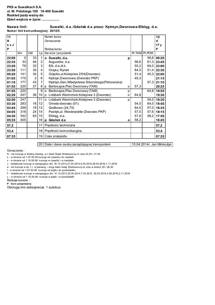 PKS w Suwałkach S.A. ul. W. Polskiego 100 16-400 Suwałki Rozkład jazdy ważny do: Dzień wejścia w życie: ..................... Nazwa linii: Suwałki, d.a.-Gdańsk d.a przez: Kętrzyn,Dworcowa-Elbląg, d.a. Numer linii komunikacyjnej: 20/12/5 Numer kursu Oznaczenia 11 N sxJ P Km 22:00 22:35 23:20 23:50 00:20 01:05 01:10 01:55 01:55 02:20 02:50 03:30 03:45 04:05 04:30 05:35 d ł Fy P Rodzaj kursu Lp Dw orce i przystanki Odl 0 33 79 111 141 175 177 220 220 247 247 283 299 318 342 405 12 33 46 32 30 34 2 43 27 36 16 19 24 63 1 2 3 4 5 6 7 8 9 10 11 12 13 14 15 16 o Suwałki, d.a. Augustów, d.a. Ełk, d.a./d.k. Orzysz, Rynek Giżycko,ul.Kolejowa 2/04(Dworzec) Kętrzyn,Dworcowa (Dworzec PKP) Kętrzyn,Gen.Władysława Sikorskiego(Pelcowizna) p Bartoszyce,Plac Dworcowy (TAXI) o Bartoszyce,Plac Dworcowy (TAXI) p Lidzbark Warmiński,Kolejowa 3 (Dworzec) o Lidzbark Warmiński,Kolejowa 3 (Dworzec) Orneta-dworzec (01) Godkowo (24,75) Pasłęk,ul. Westerplatte (Dworzec PKP) Elbląg, d.a. p Gdańsk d.a Pr.TAM Pr.POW p 56,6 55,2 64,0 51,4 45,3 56,6 61,3 64,0 51,4 45,3 57,3 o p o p o 57,3 64,8 64,8 54,0 64,0 57,0 57,6 58,2 54,0 64,0 57,0 57,6 58,2 00:20 23:45 23:00 22:30 22:00 21:15 21:10 20:25 19:55 19:30 19:30 18:50 18:35 18:15 17:50 16:45 57,2 17 Prędkość techniczna 57,2 53,4 18 Prędkość komunikacyjna 53,4 07:35 19 Czas przejazdu 07:35 20 Data i dane osoby zarządzającej transportem Oznaczenia : N - nie kursuje w Wielką Sobotę, w I dzień Świąt Wielkanocny ch oraz 24,25 i 31.XII s - w okresie od 1.07-30.09.kursuje od czwartku do niedzieli x - w okresie od 1.10-30.06. kursuje w czwartki i w niedziele J - dodatkowo kursuje w następujace dni: 30.10.2013,21.04.2014,6.04.2015,28.03.2016,1.11.2016 d - nie kursuje w dn.1.I, w pierwszy i drugi dzień świąt Wielkanocny ch oraz w dniach 25 i 26.XII ł - w okresie od 1.07-30.09. kursuje od piątku do poniedziałku F - dodatkowo kursuje w następujące dni: 31.10.2013,22.04.2014,7.04.2015, 29.03.2015,4.05.2016,2.11.2016 y - w okresie od 1.10-30.06. kursuje w piątki i w poniedziałki Rodzaje kursów : P - kurs pospieszny Obsługę linii zabezpiecza 1 autobus 10.04.2014r. Jan Minksztyn