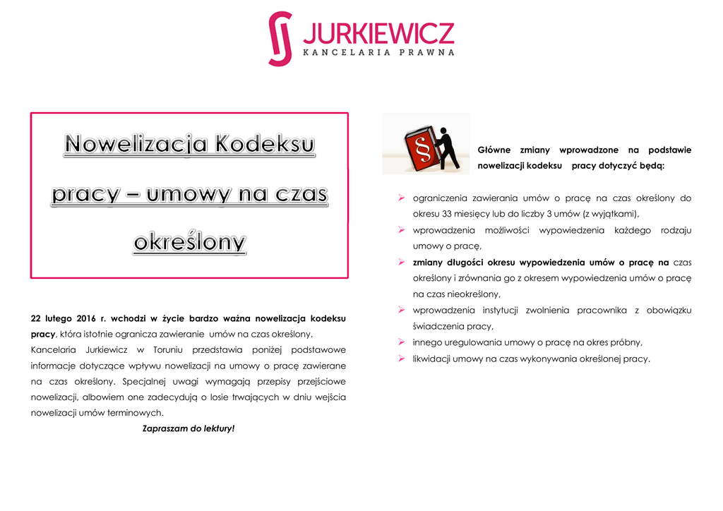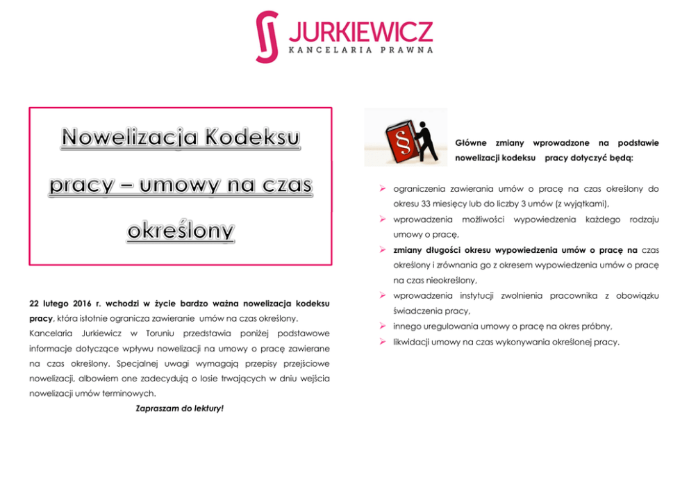 Główne zmiany wprowadzone nowelizacji kodeksu na podstawie pracy dotyczyć będą: ograniczenia zawierania umów o pracę na czas określony do okresu 33 miesięcy lub do liczby 3 umów (z wyjątkami), wprowadzenia możliwości wypowiedzenia każdego rodzaju umowy o pracę, zmiany długości okresu wypowiedzenia umów o pracę na czas określony i zrównania go z okresem wypowiedzenia umów o pracę na czas nieokreślony, 22 lutego 2016 r. wchodzi w życie bardzo ważna nowelizacja kodeksu pracy, która istotnie ogranicza zawieranie umów na czas określony. Kancelaria Jurkiewicz w Toruniu przedstawia poniżej podstawowe informacje dotyczące wpływu nowelizacji na umowy o pracę zawierane na czas określony. Specjalnej uwagi wymagają przepisy przejściowe nowelizacji, albowiem one zadecydują o losie trwających w dniu wejścia nowelizacji umów terminowych. Zapraszam do lektury! wprowadzenia instytucji zwolnienia pracownika z obowiązku świadczenia pracy, innego uregulowania umowy o pracę na okres próbny, likwidacji umowy na czas wykonywania określonej pracy. Najważniejsza, zmiana dotyczy ograniczenia zawierania umów terminowych na okres dłuższy niż 33 miesiące lub zawierania więcej niż Aneksowanie umów trzech umów. Przekroczenie tego okresu zatrudnienia lub przekroczenie tej Podobnie jak ma to miejsce w dotychczasowym stanie prawnym liczby umów będzie powodować przekształcenie umowy okresowej w bezskuteczne jest aneksowanie umów polegające na przedłużeniu czasu umowę na czas nieokreślony i to z mocy prawa. Ograniczenie to dotyczy ich trwania. Aneksowanie umów zmierza do ominięcia ograniczenia ich bowiem łącznego zatrudnienia, a więc zarówno jednej, jak i kilku umów na liczby, jest ono równoznaczne z zawarciem nowej umowy o pracę (od dnia, czas określony. Przyjęty w nowelizacji okres pozwoli na zatrudnianie w którym pierwotna umowa miała ulec rozwiązaniu). Ze względu na nową terminowe pracownika przez okres 3 lat - 3 miesiące na umowę o pracę na regulację umów na czas określony, a w szczególności limitowanie czasu ich okres próbny i 33 miesiące na umowę o pracę na czas określony. Nie ma trwania znaczenia czy w toku tych 33 miesięcy występować będzie jakakolwiek wypowiadania, mechanizm bezskuteczności aneksowania traci obecnie przerwa – czy to miesiąc czy nawet kilka lat. Znaczenie ma to, by stosunek na znaczeniu. oraz możliwość swobodnego pracy łączył te same strony. Dodatkowo dopiero czwarta, a nie tak jak dotychczas – trzecia - umowa o pracę na czas określony stawałaby się Wyjątki od zasady ograniczającej zatrudnienie umową bezterminową. Jednocześnie znowu sporządzenie aneksu do Te dość rygorystyczne zasady w niektórych sytuacjach nie będą umowy, który przedłuża czas jej trwania jest równoznaczne w skutkach z obowiązywały, a mianowicie w razie zawarcia umowy na czas określony: zawarciem nowej umowy. w celu zastępstwa innego pracownika lub Limit czasowy oraz ilościowy funkcjonują obok siebie niezależnie i do wykonywania prac dorywczych czy sezonowych, przekroczenie któregokolwiek z nich skutkować będzie przekształceniem w na okres kadencji, umowę bezterminową. Poza tym doprecyzowano moment, od którego w przypadku, gdy pracodawca wskaże obiektywne przyczyny umowa zmienia swój charakter – będzie to dzień po przekroczeniu 33miesięcznego limitu, bądź dzień zawarcia czwartej umowy na czas określony. leżące po jego stronie. Z treści tej regulacji wynika, że należy obecnie wyróżniać dwa rodzaje umów o pracę na czas określony - umowy „zwykłe” podlegające Obowiązki notyfikacji ograniczeniom związanym z czasem ich liczbą i czasem trwania oraz W przypadku zaistnienia wyjątku określonego jako obiektywne przyczyny umowy „szczególne”, niepodlegające tym ograniczeniom. Jednak umowy leżące po stronie pracodawcy konieczne jest zgłoszenie faktu zawarcia szczególne mogą być zawierane tylko wtedy, kiedy jest to uzasadnione umowy – w formie pisemnej bądź elektronicznej – do okręgowego okolicznościami wskazanymi w kodeksie pracy. Jeśli w umowie terminowej inspektora pracy właściwego dla danego pracodawcy, w ciągu 5 dni nie wskazano jednego z celów określonych powyżej wówczas przyjąć roboczych od dnia zawarcia umowy, wskazując na przyczynę jej zawarcia. należy, że zawarta została „zwykła” umowa na czas określony. Najbardziej problematyczny i niedookreślony z powyższych sytuacji jest ostatni z czterech ww. przypadków. Jest to wyjątek, zatem należy go Zapamiętaj ! interpretować wąsko. Dla oceny prawidłowości takiego zatrudnienia Obowiązek ten dotyczyć będzie również do umów trwających już przydatne sądowe w momencie wejścia ustawy w życie. Strony będą miały 3 miesiące dotyczące długoletnich umów o pracę na czas określony. Chodzi więc o na uzupełnienie umów o wskazanie obiektywnej przyczyny. przypadki, kiedy mamy do czynienia z różnego rodzaju zadaniami o Informacje. charakterze terminowym (np. realizacja jakiegoś zamówienia). A zatem w informacji do okręgowego inspektora pracy w ciągu 5 dni od dnia pewnym sensie omawiana przesłanka umożliwia uzupełnienia umowy. może się okazać dotychczasowe orzecznictwo zawieranie umów zastępujących usuniętą z kodeksu umowę o prace na czas wykonania określonej pracy. Pracodawca będzie zobowiązany do przekazania pracownika z obowiązku świadczenia pracy. Dotychczas instytucja ta była Nowe zasady wypowiadania umów Po wejściu w życie nowych przepisów możliwe będzie wypowiedzenie każdego rodzaju umowy. Nie będzie obowiązku zastrzegania dodatkowych klauzul, ponieważ art. 33 kp zostanie uchylony, a to on właśnie obecnie nakazuje: Art. 33. Przy zawieraniu umowy o pracę na czas określony, dłuższy niż 6 miesięcy, strony mogą przewidzieć dopuszczalność wcześniejszego rozwiązania tej umowy za dwutygodniowym wypowiedzeniem. oczywiśc