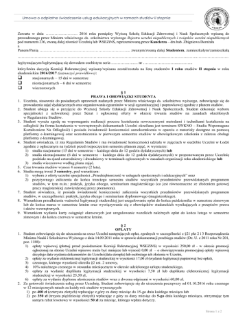 Umowa o odpłatne świadczenie usług edukacyjnych w ramach studiów II stopnia Zawarta w dniu ……………………. 2016 roku pomiędzy Wyższą Szkołą Edukacji Zdrowotnej i Nauk Społecznych wpisaną do prowadzonego przez Ministra właściwego ds. szkolnictwa wyższego Rejestru uczelni niepublicznych i związków uczelni niepublicznych pod numerem 236, zwaną dalej również Uczelnią lub WSEZiNS, reprezentowaną przez Kanclerza – dra hab. Zbigniewa Domżała a Panem/Panią ………………………………………………………….... zwanym/zwaną dalej Studentem, zamieszkałym/zamieszkałą ………………………………………………………..………………………………………....…………….……..……………………. legitymującym/legitymującą się dowodem osobistym seria ………….…..… nr ……………………....……….. który/która decyzją Komisji Rekrutacyjnej wpisany/wpisana został/została na listę studentów I roku studiów II stopnia w roku akademickim 2016/2017 (zaznaczyć prawidłowe): stacjonarnych – 15 dni w semestrze niestacjonarnych – 6 dni w semestrze wieczorowych §1 PRAWA I OBOWIĄZKI STUDENTA 1. Uczelnia, stosownie do posiadanych uprawnień nadanych przez Ministra właściwego ds. szkolnictwa wyższego, zobowiązuje się do prowadzenia zajęć dydaktycznych oraz organizowania egzaminów w sesji egzaminacyjnej i poprawkowej zgodnie z planem studiów. 2. Student ubiega się o przyjęcie do Wyższej Szkoły Edukacji Zdrowotnej i Nauk Społecznych. Student dokonuje wyboru specjalności z uchwalonej przez Senat i ogłoszonej oferty w okresie trwania studiów na zasadach określonych w Regulaminie Studiów. 3. Student wyraża zgodę na wspomaganie realizacji procesu kształcenia nowoczesnymi metodami i technikami kształcenia na odległość (ta forma kształcenia w wewnętrznych dokumentach Uczelni określana jest terminem SWKNO – Studia Wspomagane Kształceniem Na Odległość) i posiada świadomość konieczności samokształcenia w oparciu o materiały dostępne za pomocą platformy e-learningowej oraz uczestniczenia w pierwszym semestrze studiów w obowiązkowym szkoleniu z zakresu obsługi platformy e-learningowej. 4. Student oświadcza, iż zna Regulamin Studiów i ma świadomość konieczności udziału w zajęciach w siedzibie Uczelni w Łodzi zgodnie z ogłaszanym na tydzień przed rozpoczęciem semestru planem zajęć, w wymiarze: 1) studia stacjonarne (15 dni w semestrze – każdego dnia do 12 godzin dydaktycznych) lub 2) studia niestacjonarne (6 dni w semestrze – każdego dnia do 12 godzin dydaktycznych) w proponowanym przez Uczelnię podziale na zjazd czterodniowy i dwudniowy w terminach ogłoszonych w zasadach organizacji roku akademickiego lub 3) studia wieczorowe według planu zajęć. 5. Czas trwania studiów wynosi 4 semestry (2 lata). 6. Studia mogą trwać 3 semestry, pod warunkiem: 1) wyboru z oferty uczelni specjalności „Przedsiębiorczość w usługach społecznych i edukacyjnych” oraz 2) pozytywnego zaliczenia do końca trzeciego semestru studiów wszystkich przedmiotów przewidzianych programem studiów, w tym m.in.: praktyk, języka obcego, seminarium magisterskiego (co jest równoznaczne ze złożeniem gotowej pracy magisterskiej zatwierdzonej przez promotora). 7. Student oświadcza, iż posiada świadomość konieczności zaliczenia wszystkich przedmiotów przewidzianych programem studiów, w szczególności: praktyk, języka obcego i seminarium dyplomowego (magisterskiego). 8. Warunkiem przedłużenia ważności legitymacji studenckiej jest uregulowanie opłat do końca października w semestrze zimowym lub do końca marca w semestrze letnim oraz wywiązywanie się z obowiązków studenckich wynikających z przepisów prawa i aktów wewnętrznych. 9. Warunkiem wydania karty osiągnięć okresowych jest uregulowanie wszelkich należnych opłat do końca lutego w semestrze zimowym i do końca czerwca w semestrze letnim. §2 OPŁATY 1. Student zobowiązuje się do uiszczenia na rzecz Uczelni następujących opłat, zgodnych w szczególności z §21 pkt 2 i 3 Rozporządzenia Ministra Nauki i Szkolnictwa Wyższego z dnia 14.09.2011 roku w sprawie dokumentacji przebiegu studiów (Dz. U. z 2011 roku Nr 201, poz. 1188): 1) opłaty wpisowej (płatnej przed posiedzeniem Komisji Rekrutacyjnej WSEZiNS) w wysokości 250,00 zł - w okresie promocji ogłoszonej na stronie Uczelni wpisowe może być mniejsze lub wynosić 0,00 zł – o obowiązywaniu promocyjnej opłaty wpisowej decyduje data wysłania dokumentów do Uczelni (data stempla) lub osobistego ich złożenia w Uczelni, 2) opłaty za wydanie elektronicznej legitymacji studenckiej w wysokości 17,00 zł (wydanie legitymacji papierowej bez opłat), 3) czesnego, którego wysokość określa §2 ust. 2 umowy, 4) 10% należnego czesnego w stosunku miesięcznym w okresie udzielonego urlopu studenckiego, 5) opłaty za wydanie duplikatu legitymacji studenckiej w wysokości 7,50 zł lub duplikatu elektronicznej legitymacji studenckiej w wysokości 25,50 zł, 6) opłaty za wydanie dyplomu ukończenia studiów wraz z dwoma odpisami w wysokości 60,00 zł. 2. Za gotowość świadczenia usług przez Uczelnię, Student zobowiązuje się do uiszczenia począwszy od 01.10.2016 roku czesnego w 12 miesięcznych ratach za każdy rok studiów wynoszących: 1) po 400 zł (czterysta złotych) wpłacając z góry za dany miesiąc do 15-go dnia każdego miesiąca lub 2) po 350 zł (trzysta pięćdziesiąt złotych) wpłacając z góry za dany miesiąc do 5-go dnia każdego miesiąca, otrzymując tym samym rabat kwotowy w wysokości 50 zł za miesiąc, którego wpłata dotyczy. Strona 1 z 2 3. O terminie wywiązania się ze zobowiązania wskazanego w §2 ust. 2 decyduje termin wpływu należności na rachunek bankowy Uczelni, tj. przed upływem ostatniego dnia terminu płatności (art.111 §1 Kodeksu Cywilnego). 4. W przypadku wpłaty po