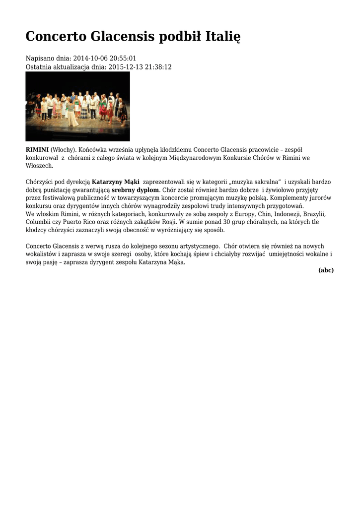 Concerto Glacensis podbił Italię Napisano dnia: 2014-10-06 20:55:01 Ostatnia aktualizacja dnia: 2015-12-13 21:38:12 RIMINI (Włochy). Końcówka września upłynęła kłodzkiemu Concerto Glacensis pracowicie – zespół konkurował z chórami z całego świata w kolejnym Międzynarodowym Konkursie Chórów w Rimini we Włoszech. Chórzyści pod dyrekcją Katarzyny Mąki zaprezentowali się w kategorii „muzyka sakralna” i uzyskali bardzo dobrą punktację gwarantującą srebrny dyplom. Chór został również bardzo dobrze i żywiołowo przyjęty przez festiwalową publiczność w towarzyszącym koncercie promującym muzykę polską. Komplementy jurorów konkursu oraz dyrygentów innych chórów wynagrodziły zespołowi trudy intensywnych przygotowań. We włoskim Rimini, w różnych kategoriach, konkurowały ze sobą zespoły z Europy, Chin, Indonezji, Brazylii, Columbii czy Puerto Rico oraz różnych zakątków Rosji. W sumie ponad 30 grup chóralnych, na których tle kłodzcy chórzyści zaznaczyli swoją obecność w wyróżniający się sposób. Concerto Glacensis z werwą rusza do kolejnego sezonu artystycznego. Chór otwiera się również na nowych wokalistów i zaprasza w swoje szeregi osoby, które kochają śpiew i chciałyby rozwijać umiejętności wokalne i swoją pasję – zaprasza dyrygent zespołu Katarzyna Mąka. (abc)