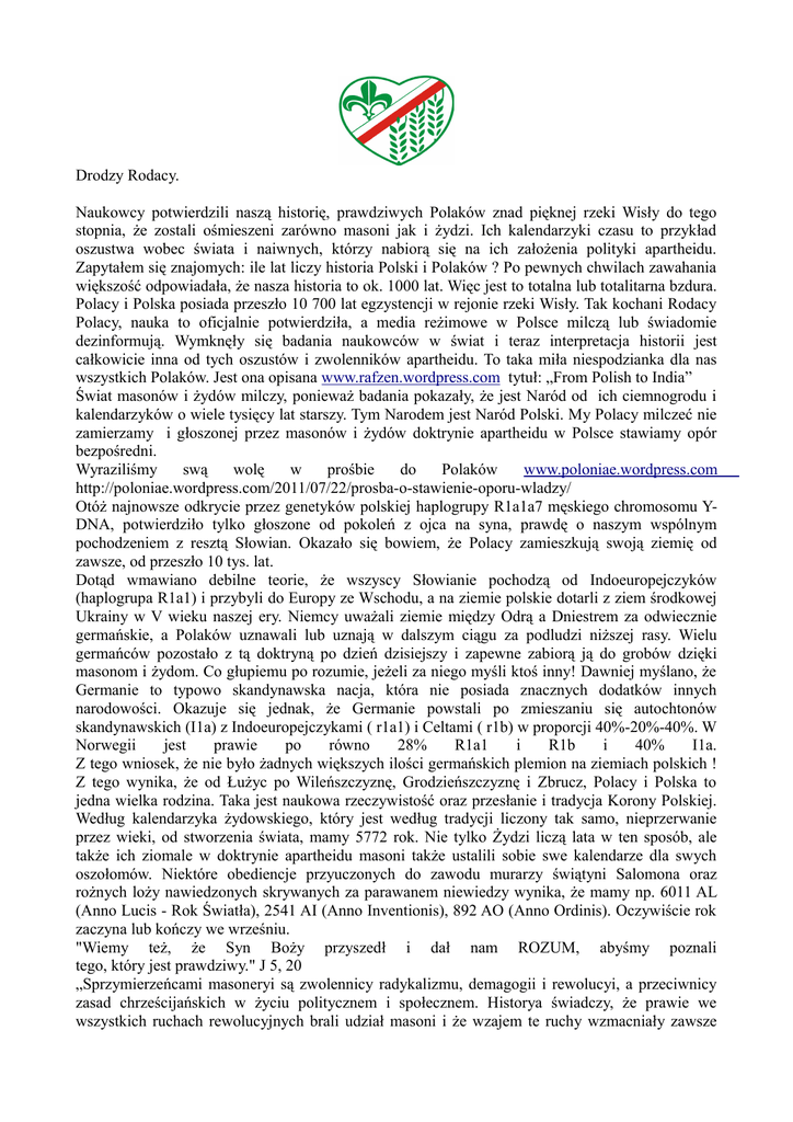 Drodzy Rodacy. Naukowcy potwierdzili naszą historię, prawdziwych Polaków znad pięknej rzeki Wisły do tego stopnia, że zostali ośmieszeni zarówno masoni jak i żydzi. Ich kalendarzyki czasu to przykład oszustwa wobec świata i naiwnych, którzy nabiorą się na ich założenia polityki apartheidu. Zapytałem się znajomych: ile lat liczy historia Polski i Polaków ? Po pewnych chwilach zawahania większość odpowiadała, że nasza historia to ok. 1000 lat. Więc jest to totalna lub totalitarna bzdura. Polacy i Polska posiada przeszło 10 700 lat egzystencji w rejonie rzeki Wisły. Tak kochani Rodacy Polacy, nauka to oficjalnie potwierdziła, a media reżimowe w Polsce milczą lub świadomie dezinformują. Wymknęły się badania naukowców w świat i teraz interpretacja historii jest całkowicie inna od tych oszustów i zwolenników apartheidu. To taka miła niespodzianka dla nas wszystkich Polaków. Jest ona opisana www.rafzen.wordpress.com tytuł: „From Polish to India” Świat masonów i żydów milczy, ponieważ badania pokazały, że jest Naród od ich ciemnogrodu i kalendarzyków o wiele tysięcy lat starszy. Tym Narodem jest Naród Polski. My Polacy milczeć nie zamierzamy i głoszonej przez masonów i żydów doktrynie apartheidu w Polsce stawiamy opór bezpośredni. Wyraziliśmy swą wolę w prośbie do Polaków www.poloniae.wordpress.com http://poloniae.wordpress.com/2011/07/22/prosba-o-stawienie-oporu-wladzy/ Otóż najnowsze odkrycie przez genetyków polskiej haplogrupy R1a1a7 męskiego chromosomu YDNA, potwierdziło tylko głoszone od pokoleń z ojca na syna, prawdę o naszym wspólnym pochodzeniem z resztą Słowian. Okazało się bowiem, że Polacy zamieszkują swoją ziemię od zawsze, od przeszło 10 tys. lat. Dotąd wmawiano debilne teorie, że wszyscy Słowianie pochodzą od Indoeuropejczyków (haplogrupa R1a1) i przybyli do Europy ze Wschodu, a na ziemie polskie dotarli z ziem środkowej Ukrainy w V wieku naszej ery. Niemcy uważali ziemie między Odrą a Dniestrem za odwiecznie germańskie, a Polaków uznawali lub uznają w dalszym ciągu za podludzi niższej rasy. Wielu germańców pozostało z tą doktryną po dzień dzisiejszy i zapewne zabiorą ją do grobów dzięki masonom i żydom. Co głupiemu po rozumie, jeżeli za niego myśli ktoś inny! Dawniej myślano, że Germanie to typowo skandynawska nacja, która nie posiada znacznych dodatków innych narodowości. Okazuje się jednak, że Germanie powstali po zmieszaniu się autochtonów skandynawskich (I1a) z Indoeuropejczykami ( r1a1) i Celtami ( r1b) w proporcji 40%-20%-40%. W Norwegii jest prawie po równo 28% R1a1 i R1b i 40% I1a. Z tego wniosek, że nie było żadnych większych ilości germańskich plemion na ziemiach polskich ! Z tego wynika, że od Łużyc po Wileńszczyznę, Grodzieńszczyznę i Zbrucz, Polacy i Polska to jedna wielka rodzina. Taka jest naukowa rzeczywistość oraz przesłanie i tradycja Korony Polskiej. Według kalendarzyka żydowskiego, który jest według tradycji liczony tak samo, nieprzerwanie przez wieki, od stworzenia świata, mamy 5772 rok. Nie tylko Żydzi liczą lata w ten sposób, ale także ich ziomale w doktrynie apartheidu masoni także ustalili sobie swe kalendarze dla swych oszołomów. Niektóre obediencje przyuczonych do zawodu murarzy świątyni Salomona oraz rożnych loży nawiedzonych skrywanych za parawanem niewiedzy wynika, że mamy np. 6011 AL (Anno Lucis - Rok Światła), 2541 AI (Anno Inventionis), 892 AO (Anno Ordinis). Oczywiście rok zaczyna lub kończy we wrześniu. "Wiemy też, że Syn Boży przyszedł i dał nam ROZUM, abyśmy poznali tego, który jest prawdziwy." J 5, 20 „Sprzymierzeńcami masoneryi są zwolennicy radykalizmu, demagogii i rewolucyi, a przeciwnicy zasad chrześcijańskich w życiu politycznem i społecznem. Historya świadczy, że prawie we wszystkich ruchach rewolucyjnych brali udział masoni i że wzajem te ruchy wzmacniały zawsze ich siłę. Sprzymierzeńcami masonów są socyaliści, bo jedni i drudzy mają wiele punktów stycznych, jak nienawiść do religii katolickiej, dążność do "odchrześcijanienia" społeczeństwa i hasła rewolucyi francuskiej: wolność, równość i braterstwo. Sprzymierzeńcami i kierownikami masoneryi są wreszcie żydzi. Sojusz ten jest rzeczą pewną, a nie brak nawet pisarzy i to poważnych, którzy twierdzą, że masonerya zawdzięcza żydom swój początek. Cóż za tem zdaniem przemawia ? Oto przedewszystkiem ta okoliczność, że żydzi nienawidzą z zasady i bez chęci pojednania się religii Chrystusowej, która ich opór przeciw Zbawicielowi świata potępia, jako też społeczeństwa chrześcijańskiego, od którego doznawali nieraz poniżenia i prześladowania, w zamian za krzywdy, jakie temu społeczeństwu przez lichwę, wyzysk i demoralizacyę zadawali i zadają. Konsekwentnie żydzi dążą do tego, by podkopać byt religii Chrystusowej, której Kościół katolicki jest strażnicą i ogniskiem, a społeczeństwo chrześcijańskie poniżyć i osłabić, używając do tego wszelakich środków, ponieważ zaś masonerya zwraca, jak widzieliśmy, nienawiść swoją przeciw Kościołowi i stara się zedrzeć ze społeczeństwa cechę chrześcijańską, przeto łatwo wysnuć stąd wniosek, że żydzi utworzyli masoneryę, jako jeden z pierwszorzędnych hufców w walce z chrystyanizmem. Powtóre, żydzi dążą wytrwale do panowania nad światem, do czego jako środek mają służyć nie tylko kapitały, giełdy, dzienniki itp. ale także walki, rewolucye i rozprzężenia pośród narodów chrześcijańskich, ponieważ jednak sama roztropność im radzi, by działali w ukryciu, przeto jako swoich pionierów wysuwają masonów, by chrześcijanie gubili chrześcijan. W tym też celu stają żydzi na czele partyi socyalistycznej, spodziewając się, że w ten sposób odwrócą od siebie burzę rewolucyi społecznej, a jeżeli po wielkich przewrotach przyjdzie do utworzenia międzyna