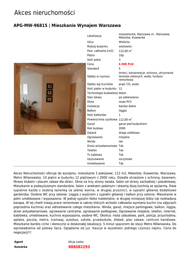 Akces nieruchomości APG-MW-96815 | Mieszkanie Wynajem Warszawa Lokalizacja mazowieckie, Warszawa m., Warszawa, Mokotów, Ksawerów Ulica Wielicka Rodzaj budynku wieżowiec Pow. całkowita [m2] 112,00 m2 Piętro 10p Ilość pokoi 3 Cena 6 000 PLN Standard 5 Opłaty w czynszu śmieci, konserwacje, ochrona, utrzymanie terenów zielonych, woda, fundusz remontowy Opłaty wg liczników prąd, CO, woda Ilość pięter w budynku 12 Technologia budowlana beton Stan lokalu po odświeżeniu Okna nowe PCV Instalacje bardzo dobre Balkon loggia Ilość balkonów 1 Powierzchnia użytkowa 112,00 m2 Garaż garaż pod budynkiem Rok budowy 2000 Dojazd droga asfaltowa Ogrzewanie miejskie Winda tak Drzwi antywłamaniowe Tak Telefon Tak Tv kablowa Tak Usytuowanie szczytowe Umeblowanie Tak Akces Nieruchomości oferuje do wynajmu, mieszkanie 3 pokojowe, 112 m2, Mokotów, Ksawerów, Warszawa, Metro Wilanowska. 10 piętro w budynku 12 piętrowym z 2000 roku, Osiedle strzeżone z ochroną, basenem, fitness klubem i placem zabaw dla dzieci. Okna na trzy strony świata. Salon od strony zachodniej i południowej. Mieszkanie w podwyższonym standardzie. Salon z aneksem jadalnym i otwartą dużą kuchnią ze spiżarnią. Dwie sypialnie każda z osobną łazienką (w jednej wanna, w drugiej prysznic), w sypialni głównej dodatkowo garderoba. Osobne WC przy salonie. Loggia z wyjściem z sypialni głównej i balkon przy salonie. Mieszkanie w pełni umeblowane i wyposażone. W jednej sypialni łóżko małżeńskie, w drugiej mniejszej łóżko lub rozkładana kanapa. W tej chwili trwają prace remontowe w zakres których wchodzi całkowita wymiana kuchni (na zdjęciach poprzednia kuchnia) oraz odmalowanie całego mieszkania. Winda, garaż, miejsce parkingowe, balkon, loggia, drzwi antywłamaniowe, ogrzewanie centralne, ogrzewanie podłogowe, Ogrzewanie miejskie, telefon, internet, kablówka, umeblowane, kuchnia wyposażona, osobne WC. Okolica: niska zabudowa, park, policja, przychodnia, apteka, poczta, metro, tramwaj, autobus, szkoła, przedszkole, żłobek, plac zabaw, centrum handlowe. Mieszkanie bardzo ciche i słoneczne w doskonałej lokalizacji, 5 minut spacerem do stacji Metro Wilanowska. Do wprowadzenia od połowy lipca. Oglądanie od już. Kaucja w wysokości jednego czynszu najmu. Cena do negocjacji!!! Agent Alicja Leska Komórka 888082293 Akces nieruchomości E-mail [email protected]