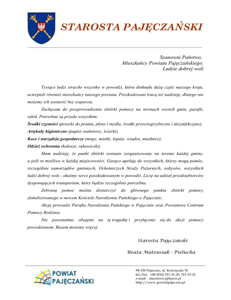 STAROSTA PAJĘCZAŃSKI Szanowni Państwo, Mieszkańcy Powiatu Pajęczańskiego, Ludzie dobrej woli Tysiące ludzi straciło wszystko w powodzi, która dotknęła dużą część naszego kraju, ucierpieli również mieszkańcy naszego powiatu. Poszkodowani tracą też nadzieję, dlatego nie możemy ich zostawić bez wsparcia. Zachęcam do przeprowadzenia zbiórki pomocy na terenach swoich gmin, parafii, szkół. Potrzebne są przede wszystkim: Środki czystości (proszki do prania, płyny i mydła, środki przeciwgrzybiczne i dezynfekcyjne), Artykuły higieniczne (papier toaletowy, ścierki), Koce i narzędzia gospodarcze (mopy, miotły, łopaty, wiadra, miednice), Odzież ochronna (kalosze, rękawiczki). Mam nadzieję, że punkt zbiórki zostanie zorganizowany na terenie każdej gminy, a jeśli to możliwe w każdej miejscowości. Gorąco apeluję do wszystkich, którzy mogą pomóc, szczególnie samorządów gminnych, Ochotniczych Straży Pożarnych, sołtysów, wszystkich ludzi dobrej woli - okażmy serce poszkodowanym w powodzi. Liczę na udział przedsiębiorców dysponujących transportem, który będzie szczególnie potrzebny. Zebraną pomoc można dostarczyć do głównego punktu zbiórki pomocy zlokalizowanego w nowym Kościele Narodzenia Pańskiego w Pajęcznie. Akcję prowadzi Parafia Narodzenia Pańskiego w Pajęcznie oraz Powiatowe Centrum Pomocy Rodzinie. Nie pozostańmy obojętni na tę tragedię i przyłączmy się do akcji pomocy powodzianom. Razem możemy więcej. Starosta Pajęczański Beata Mateusiak - Pielucha 98-330 Pajęczno, ul. Kościuszki 76 tel./fax. +48 (034) 311-31-20, 311-31-21 e-mail: [email protected] http://www.powiatpajeczno.pl
