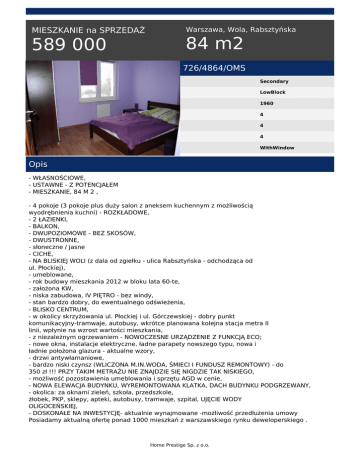 MIESZKANIE na SPRZEDAŻ 589 000 Warszawa, Wola, Rabsztyńska 84 m2 726/4864/OMS Secondary LowBlock 1960 4 4 4 WithWindow Opis - WŁASNOŚCIOWE, - USTAWNE - Z POTENCJAŁEM - MIESZKANIE, 84 M 2 , - 4 pokoje (3 pokoje plus duży salon z aneksem kuchennym z możliwością wyodrębnienia kuchni) - ROZKŁADOWE, - 2 ŁAZIENKI, - BALKON, - DWUPOZIOMOWE - BEZ SKOSÓW, - DWUSTRONNE, - słoneczne / jasne - CICHE, - NA BLISKIEJ WOLI (z dala od zgiełku - ulica Rabsztyńska - odchodząca od ul. Płockiej), - umeblowane, - rok budowy mieszkania 2012 w bloku lata 60-te, - założona KW, - niska zabudowa, IV PIĘTRO - bez windy, - stan bardzo dobry, do ewentualnego odświeżenia, - BLISKO CENTRUM, - w okolicy skrzyżowania ul. Płockiej i ul. Górczewskiej - dobry punkt komunikacyjny-tramwaje, autobusy, wkrótce planowana kolejna stacja metra II linii, wpłynie na wzrost wartości mieszkania, - z niezależnym ogrzewaniem - NOWOCZESNE URZĄDZENIE Z FUNKCJĄ ECO; - nowe okna, instalacje elektryczne, ładne parapety nowszego typu, nowa i ładnie położona glazura - aktualne wzory, - drzwi antywłamaniowe, - bardzo niski czynsz (WLICZONA M.IN.WODA, ŚMIECI I FUNDUSZ REMONTOWY) - do 350 zł !!! PRZY TAKIM METRAŻU NIE ZNAJDZIE SIĘ NIGDZIE TAK NISKIEGO, - możliwość pozostawienia umeblowania i sprzętu AGD w cenie, - NOWA ELEWACJA BUDYNKU, WYREMONTOWANA KLATKA, DACH BUDYNKU PODGRZEWANY, - okolica: za oknami zieleń, szkoła, przedszkole, żłobek, PKP, sklepy, apteki, autobusy, tramwaje, szpital, UJĘCIE WODY OLIGOCEŃSKIEJ, - DOSKONAŁE NA INWESTYCJĘ- aktualnie wynajmowane -możliwość przedłużenia umowy Posiadamy aktualną ofertę ponad 1000 mieszkań z warszawskiego rynku deweloperskiego . Home Prestige Sp. z o.o. Bezpłatnie sprawdzimy Twoją zdolność kredytową . Oferujemy wykończenie zakupionego mieszkania ,, pod klucz '' Serdecznie zapraszamy do kontaktu pod numerem telefonu 22 633 0 400 oraz do odwiedzenia naszej strony internetowej www.homeprestige.com.pl Home Prestige Sp. z o.o. tel. 226330400 email: [email protected] Home Prestige Sp. z o.o. Powered by TCPDF (www.tcpdf.org)