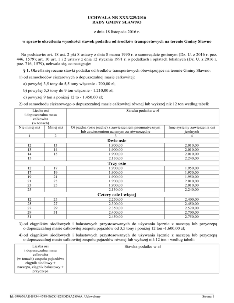 UCHWAŁA NR XXX/229/2016 RADY GMINY SŁAWNO z dnia 18 listopada 2016 r. w sprawie określenia wysokości stawek podatku od środków transportowych na terenie Gminy Sławno Na podstawie: art. 18 ust. 2 pkt 8 ustawy z dnia 8 marca 1990 r. o samorządzie gminnym (Dz. U. z 2016 r. poz. 446, 1579); art. 10 ust. 1 i 2 ustawy z dnia 12 stycznia 1991 r. o podatkach i opłatach lokalnych (Dz. U. z 2016 r. poz. 716, 1579), uchwala się, co następuje: § 1. Określa się roczne stawki podatku od środków transportowych obowiązujące na terenie Gminy Sławno: 1) od samochodów ciężarowych o dopuszczalnej masie całkowitej: a) powyżej 3,5 tony do 5,5 tony włącznie - 700,00 zł, b) powyżej 5,5 tony do 9 ton włącznie - 1.210,00 zł, c) powyżej 9 ton a poniżej 12 to - 1.450,00 zł; 2) od samochodu ciężarowego o dopuszczalnej masie całkowitej równej lub wyższej niż 12 ton według tabeli: Liczba osi i dopuszczalna masa całkowita (w tonach) Nie mniej niż Mniej niż 1 2 12 13 14 15 13 14 15 12 17 19 21 23 25 17 19 21 23 25 12 25 27 29 31 25 27 29 31 Stawka podatku w zł Oś jezdna (osie jezdne) z zawieszeniem pneumatycznym lub zawieszeniem uznanym za równorzędne 3 Inne systemy zawieszenia osi jezdnych 4 Dwie osie 1.900,00 1.900,00 1.900,00 2.130,00 2.010,00 2.010,00 2.010,00 2.240,00 Trzy osie 1.900,00 1.900,00 1.900,00 1.900,00 1.900,00 2.130,00 1.950,00 1.950,00 1.950,00 2.010,00 2.010,00 2.240,00 Cztery osie i więcej 2.250,00 2.300,00 2.350,00 2.400,00 2.450,00 2.400,00 2.450,00 2.520,00 2.700,00 2.750,00 3) od ciągników siodłowych i balastowych przystosowanych do używania łącznie z naczepą lub przyczepą o dopuszczalnej masie całkowitej zespołu pojazdów od 3,5 tony i poniżej 12 ton -1.600,00 zł; 4) od ciągników siodłowych i balastowych przystosowanych do używania łącznie z naczepą lub przyczepą o dopuszczalnej masie całkowitej zespołu pojazdów równej lub wyższej niż 12 ton - według tabeli: Liczba osi i dopuszczalna masa całkowita (w tonach) zespołu pojazdów: ciągnik siodłowy + naczepa, ciągnik balastowy + przyczepa Id: 699676AE-B934-4748-86CC-E29DD8A28F6A. Uchwalony Stawka podatku w zł Strona 1 Nie mniej niż Mniej niż Oś jezdna (osie jezdne) z zawieszeniem pneumatycznym lub zawieszeniem uznanym za równorzędne Inne systemy zawieszenia osi jezdnych 1 2 3 4 12 18 25 31 18 25 31 12 40 40 Dwie osie 1.950,00 1.950,00 1.950,00 2.300,00 1.950,00 1.950,00 1.950,00 2.330,00 Trzy osie i więcej 2.000,00 2.060,00 2.000,00 2.700,00 5) od przyczepy i naczepy, które łącznie z pojazdem silnikowym posiadają dopuszczalną masę całkowitą od 7 ton i poniżej 12 ton, z wyjątkiem związanych wyłącznie z działalnością rolniczą prowadzoną przez podatnika podatku rolnego - 900,00 zł; 6) od przyczepy i naczepy, które łącznie z pojazdem silnikowym posiadają dopuszczalną masę całkowitą równą lub wyższą niż 12 ton, z wyjątkiem związanych wyłącznie z działalnością rolniczą prowadzoną przez podatnika podatku rolnego - według tabeli: Liczba osi i dopuszczalna masa całkowita (w tonach) zespołu pojazdów: ciągnik siodłowy + naczepa, ciągnik balastowy + przyczepa Nie mniej niż Mniej niż Stawka podatku w zł Oś jezdna (osie jezdne) z zawieszeniem pneumatycznym lub zawieszeniem uznanym za równorzędne 3 1 2 12 18 25 18 25 1.200,00 1.250,00 1.400,00 12 28 33 38 28 33 38 1.540,00 1.640,00 1.660,00 2.000,00 12 38 38 Inne systemy zawieszenia osi jezdnych 4 Jedna oś 1.200,00 1.250,00 1.400,00 Dwie osie 1.540,00 1.640,00 1.660,00 2.000,00 Trzy osie i więcej 1.510,00 1.890,00 1.510,00 1.890,00 7) od autobusów, w zależności od liczby miejsc do siedzenia: a) mniej niż 22 miejsca – 1.100,00 zł b) równej lub większej niż 22 miejsca - 1.800,00 zł § 2. Traci moc uchwała Nr XIV/119/2015 Rady Gminy Sławno z dnia 13 listopada 2015 r. w sprawie określenia wysokości stawek podatku od środków transportowych (Dz. Urz. Woj. Zachodniopomorskiego z 2015 r. poz. 4758). § 3. Wykonanie uchwały powierza się Wójtowi Gminy Sławno. Id: 699676AE-B934-4748-86CC-E29DD8A28F6A. Uchwalony Strona 2 § 4. Uchwała podlega ogłoszeniu w Dzienniku Urzędowym Województwa Zachodniopomorskiego i wchodzi w życie z dniem 1 stycznia 2017 r. Przewodnicząca Rady Gminy Sławno Marta Hołowata Id: 699676AE-B934-4748-86CC-E29DD8A28F6A. Uchwalony Strona 3 Uzasadnienie w sprawie określenia stawek rocznych podatku od środków transportowych na 2017 rok. Zgodnie z art. 10 ustawy z dnia 12 stycznia 1991r. o podatkach i opłatach lokalnych (Dz. U. z 2016 r., poz. 716 z późn. zm.) Rada Gminy określa, w drodze uchwały, wysokość stawek podatku od środków transportowych, z tym, że roczna stawka podatku od jednego środka transportowego nie może przekroczyć górnej granicy stawki określonej w tej ustawie. Górne granice stawek kwotowych określone w art. 10 ust. 1 ww. ustawy obowiązujące w danym roku podatkowym ulegają corocznie zmianie na następny rok podatkowy w stopniu odpowiadającym wskaźnikowi cen towarów i usług konsumpcyjnych w okresie pierwszego półrocza roku, w którym stawki ulegają zmianie, w stosunku do analogicznego okresu roku poprzedniego. Górne granice stawek kwotowych zostały ogłoszone w Obwieszczeniu Ministra Finansów w dniu 28 lipca 2016 r. Stawki określone w projekcie uchwały mieszczą się w granicach kwot maksymalnych określonych w ww. obwieszczeniu Ministra Finansów z dnia 28 lipca 2016 roku. Mając powyższe na uwadze podjęcie uchwały w przedmiotowej sprawie jest uzasadnione. Id: 699676AE-B934-4748-86CC-E29DD8A28F6A. Uchwalony Strona 1