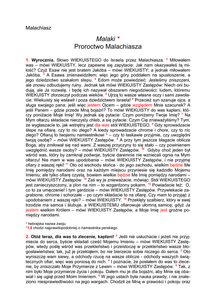 Malachiasz Malaki * Proroctwo Malachiasza 1. Wyrocznia. Słowo WIEKUISTEGO do Israela przez Malachiasza. 2 Miłowałem was – mówi WIEKUISTY, lecz zapewne się zapytacie: Jak nam okazywałeś tą miłość? Czyż Esaw nie jest bratem Jakóba – mówi WIEKUISTY; a jednak miłowałem Jakóba. 3 A Esawa znienawidziłem; więc jego góry poddałem na spustoszenie, a jego dziedzictwo szakalom stepu. 4 Edom może powiedzieć: Jesteśmy zniszczeni, ale znowu odbudujemy ruiny. Jednak tak mówi WIEKUISTY Zastępów: Niech oni budują, ale Ja rozwalę, i będę ich nazywał obszarem niegodziwości; ludem, któremu WIEKUISTY złorzeczył podczas wieków. 5 Ujrzą to wasze własne oczy i sami zawołacie: Wiekuisty się wsławił i poza dziedzictwem Israela! 6 Przecież syn szanuje ojca, a sługa swojego pana; jeśli więc jestem Ojcem – gdzie względem Mnie szacunek? A jeśli Panem – gdzie przede Mną bojaźń? To mówi WIEKUISTY do was kapłani, którzy poniżacie Moje Imię! Wy jednak się pytacie: Czym poniżamy Twoje Imię? 7 Na Mym ołtarzu składacie nieczysty chleb, a się pytacie: Czym Cię znieważyliśmy? Tym, że wygłaszacie to, jak wstrętny jest dla was stół WIEKUISTEGO. 8 Gdy sprowadzacie ślepe na ofiarę, czy to nic złego? A kiedy sprowadzacie chrome i chore, czy to nic złego? Ofiaruj to twojemu namiestnikowi * – czy to łaskawie przyjmie, czy uwzględni twoją osobę? – mówi WIEKUISTY Zastępów. 9 A przy tym jeszcze błagacie oblicze Boga, aby zmiłował się nad wami. Z waszej przyczyny to się stało – czy powinienem uwzględnić wasze osoby? – mówi WIEKUISTY Zastępów. 10 Gdyby choć jeden był wśród was, który by zamknął podwoje, byście daremnie nie wzniecali ognia na Mym ołtarzu! Nie mam w was upodobania – mówi WIEKUISTY Zastępów, i nie przyjmę ofiary z waszej ręki! 11 Oto od wschodu słońca - do jego zachodu, wielkim będzie Me Imię pomiędzy narodami oraz na każdym miejscu przyniesie się kadzidło Mojemu Imieniu; ale tylko ofiarę czystą, bowiem wielkie będzie Me Imię pomiędzy narodami – mówi WIEKUISTY Zastępów. 12 Zaś wy je znieważacie, mówiąc: Stół WIEKUISTEGO jest zanieczyszczony, a plon na nim – to wzgardzony pokarm. 13 Powiadacie też: O, co to za umęczenie! I tym gardzicie – mówi WIEKUISTY Zastępów. Przywlekacie zagrabione, chrome i schorzałe – po czym składacie to na ofiarę. Czy mam to przyjąć z upodobaniem z waszej ręki? – mówi WIEKUISTY. 14 Przeklęty szalbierz, który w swej trzodzie ma samca i ślubuje, a WIEKUISTEMU ofiarowuje ułomną samicę; gdyż Ja jestem wielkim Królem – mówi WIEKUISTY Zastępów, a Moje Imię jest groźne pomiędzy narodami. * hebrajska nazwa zwoju *1,8 chodzi najprawdopodobniej o namiestnika perskiego 2. Otóż teraz, dla was to zlecenie, kapłani! 2 Jeśli nie usłuchacie i jeżeli nie przyjmiecie do serca, byście składali cześć Mojemu Imieniu – mówi WIEKUISTY Zastępów, wtedy poślę wśród was przekleństwo i przeistoczę w przekleństwo wasze błogosławieństwa; tak, już je przekląłem, bo nie bierzecie sobie niczego do serca. 3 Oto wyniszczę wam siewy, a odchody rzucę na wasze oblicze - odchody waszych świątecznych ofiar, więc was poniosą do nich. 4 I poznacie, że posłałem do was to zlecenie, by zniszczało Moje Przymierze z Lewim – mówi WIEKUISTY Zastępów. 5 Tak, z nim było Moje przymierze życia i pokoju. Dałem mu je dla bojaźni, aby Mnie się obawiał i się ugiął przed Moim Imieniem. 6 W jego ustach była nauka prawdy; i nie znaleziono niesprawiedliwości na jego wargach. Chodził ze Mną w prawości i pokoju oraz wielu odwrócił od winy. 7 Tak powinny zawsze strzec wiedzy wargi kapłańskie, a wtedy będą szukać Prawa z jego ust, gdyż on jest wysłannikiem WIEKUISTEGO Zastępów. 8 Jednak wy zeszliście z drogi oraz w Prawie byliście dla wielu zgorszeniem, zerwaliście Przymierze z Lewim – mówi WIEKUISTY Zastępów. 9 Dlatego i Ja was uczyniłem poniżonymi i wzgardzonymi u całego ludu; bowiem nie przestrzegacie Moich dróg, a w Prawie * uwzględniacie osobę. 10 Czy nie wszyscy mamy jednego Ojca? Czy nie stworzył nas jeden Bóg? Czemu brat sprzeniewierza się bratu, znieważając przymierze naszych przodków? 11 Sprzeniewierzył się Juda, a w Israelu i Jeruszalaim spełniły się ohydy; bowiem Juda znieważył to, co było święte dla WIEKUISTEGO, miłując i kojarząc się z córkami obcego bóstwa. 12 Mężowi, który to czyni, WIEKUISTY zgładzi z namiotów Jakóba dziecię i wnuka * oraz tego, co składa dar WIEKUISTEMU Zastępów. 13 A oto co następnie czynicie: Okrywacie łzami ofiarnicę WIEKUISTEGO, płaczem i jękiem, tak, że nie zwraca się już do daru, aby go przyjąć z upodobaniem z waszej ręki. 14 Zapewne się pytacie: Dlaczego? A dlatego, że WIEKUISTY był świadkiem pomiędzy tobą, a żoną twojej młodości, której się teraz sprzeniewierzyłeś, choć ona była twą towarzyszką i żoną twojego przymierza. 15 Czyż was nie jednym stworzył, cząstką Swojego Ducha? A w jakim celu jednym? By pragnęli Bożego wysiewu *. Toteż strzeżcie swojego ducha, a żonie swojej młodości niechaj nikt się nie sprzeniewierza. 16 Bo nienawidzę rozwodu – mówi WIEKUISTY, Bóg Israela, i tego, co krzywdę zakrywa * swoim płaszczem – mówi WIEKUISTY Zastępów. Dlatego strzeżcie się w waszym duchu oraz się nie sprzeniewierzajcie. 17 Waszymi mowami znużyliście WIEKUISTEGO oraz zapewne się pytacie: Czym Go znużyliśmy? Tym, że powiadacie: Każdy, kto czyni źle jest dobrym w oczach WIEKUISTEGO i w takim znajduje On upodobanie; albo: Gdzie jest prawdziwy Bóg sądu? *2,9 także: Nauce *2,12 inni: czuwającego i odpowiadającego – prawdopodobnie wyrażenie przysłowiowe, oznaczające wszystkich we wspólnym domu, lub czuwających w nocy Lewitów, z których jeden nawoływał, a drugi odpowiadał. *2,15 także: nasienia, potomstwa, obcowania *2,16 od hebrajskiego słowa: dopełniać 3. 