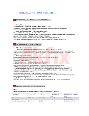SILIKON AKFIX 100AQ AKWARIUM 01 IDENTYFIKACJA MIESZANINY I FIRMY 1.1. Identyfikator produktu: Nazwa handlowa produktu: 100S SILIKON SANITARNY 1.2. Istotne zidentyfikowane zastosowania mieszaniny oraz zastosowania odradzane: Zastosowanie produktu: uszczelniacz 1.3. Dane dotyczące dostawcy karty charakterystyki: Firma: Akkim Yapı Kimyasalları San. Tic. ve A.Ş. Adres: Yeşilbayır Mah. Şimşir Sk. No: 22 34555 Hadımköy İstanbul - TÜRKİYE Numer telefonu / faksu: Tel .: +90 212 771 13 71 / faks: +90 212 771 38 88 mail / www: wsparcie @ akfix.com / info @ akfix.com / www.akfix.com 1.4. Numer telefonu alarmowego: +90 212 771 13 71-w dni powszednie 08:00 -17:00 02 IDENTYFIKACJA ZAGROŻENIA 2.1. Klasyfikacja mieszaniny 2.1.1. Klasyfikacja zgodnie z rozporządzeniem (WE) nr 1272/2008 (CLP / GHS) Ocena bezpieczeństwa chemicznego nie jest potrzebna, ponieważ mieszanka nie zawiera substancji niebezpiecznych. Brak klasyfikacji zagrożenia zgodnie z rozporządzeniem (WE) nr 1272/2008 (CLP / GHS). 2.2. Elementy oznakowania Oznakowanie zgodnie z rozporządzeniem (WE) nr 1272/2008 (CLP / GHS) Nie jest to niebezpieczna mieszanka. Dodatkowe oznakowania: P102-Przechowywać w miejscu niedostępnym dla dzieci. P262-Nie wprowadzać do oczu, na skórę lub na odzież. P271-Stosować wyłącznie na zewnątrz lub w dobrze wentylowanym pomieszczeniu. P280-Stosować rękawice ochronne / odzież / Ochrona ochronną oczu / twarzy. 2.3. Inne zagrożenia: Substancja / mieszanina nie zawiera składników uważanych za trwałe, wykazujących zdolność do biokumulacji i toksycznych (PBT) lub bardzo trwałych i bardzo dużej zdolności do biokumulacji (vPvB). 2.4. Szczególne wskazówki o zagrożeniu dla człowieka i środowiska Produkt nie podlega obowiązkowi oznakowania na podstawie metody obliczania "Ogólnej wytycznej klasyfikowania preparatów w UE" w jej ostatnio ważnej wersji. 2.5. Dodatkowe Informacje Patrz pkt 11 dla informacji toksykologicznej. Pełny tekst zwrotów H- i EUH-: Patrz punkt 16. 03 SKŁAD/INFORMACJA O SKŁADNIKACH Opis: Skład mieszanki zawierający bezpieczne domieszkami opisany poniżej. składniki Tris (acetyloksy) ethylsilane Metylotriacetoksysilan nr CAS nr EC 17689-77-9 241-677-4 4253-34-3 224-221-9 stężenie (% w/w) ‹1 ‹1 Klasyfikacja prawna CLP H302, H314, H318,EUH014 H302,H314,EUH014 04 PIERWSZA POMOC 4.1. Opis środków pierwszej pomocy: Zalecenia ogólne: Zdjąć zanieczyszczoną odzież roboczą i obuwie. W razie złego samopoczucia zasięgnąć porady lekarza. W przypadku wdychania: Usunąć poszkodowanego na świeże powietrze i zapewnić swobodne oddychanie. Jeśli oddychanie jest utrudnione, podać tlen. Uzyskać pomoc medyczną w przypadku pojawienia się objawów. W przypadku kontaktu ze skórą: Natychmiast zdjąć całą zanieczyszczoną odzież. Zmyć skórę dużą ilością wody. Uzyskać pomoc medyczną w przypadku pojawienia się objawów podrażnienia skóry. W przypadku kontaktu z oczami: Zabezpieczyć nieuszkodzone oko. Jeżeli to możliwe, usunąć szkła kontaktowe, jeżeli są stosowane. W przypadku kontaktu z oczami natychmiast przemyć dużą ilością wody i zasięgnąć porady lekarza. W przypadku połknięcia: Nie wywoływać wymiotów. Nigdy nie podawać niczego doustnie osobie nieprzytomnej. Dokładnie wypłukać usta wodą. Jeśli objawy nie ustępują, należy zasięgnąć porady lekarza i pokazać opakowanie lub etykietę. 4.2. Ważne objawy,skutki opóźnione: Brak danych. 4.3. Wskazania dotyczące wszelkiej natychmiastowej pomocy lekarskiej i szczególnego postępowania z poszkodowanym: Brak danych. 05 POSTĘPOWANIE W PRZYPADKU POŻARU 5.1. Środki gaśnicze: Nadające się środki gaśnicze: CO2, proszek. Większy pożar zwalczać strumieniem wody lub pianą odporną na alkohol. Nie wskazane środki gaśnicze: Silny strumień wody. 5.2. Szczególne zagrożenia związane z mieszaniny: Kontakt z produktami spalania może być niebezpieczny dla zdrowia. Niebezpieczne produkty spalania: Tlenki węgla, opary kwasu octowego. 5.3. Informacje dla strażaków: Nosić aparaty oddechowe w razie potrzeby. Stosować środki ochrony indywidualnej. Specyficzne metody gaśnicze: Użycie środków odpowiednich dla lokalnych warunków i dla środowiska gaśniczego. Stosować zraszanie wodą do chłodzenia nieotwartych pojemników. Usuń nieuszkodzone pojemniki z miejsca pożaru, jeżeli jest to możliwe. Ewakuować teren. 06 POSTĘPOWANIE W RAZIE NIEZAMIERZONEGO UWOLNIENIA 6.1. Indywidualne środki ostrożności, wyposażenie ochronne i procedury w sytuacjach awaryjnych: Używać osobisty sprzęt ochronny. Stosować produkt zgodnie z instrukcją. Osoby postronne trzymać z dala. 6.2. Środki ostrożności w zakresie ochrony środowiska: Nie dopuścić do przedostania się do wód gruntowych, ścieków lub gleby. Należy powiadomić lokalne służby jeżeli nastapił wyciek. 6.3. Metody czyszczenia i materiały zapobiegające rozprzestrzenianiu się skażeniu: Zanurzyć w obojętnym materiale sorpcyjnym, takim jak piasek, żel krzemionkowy, pochłaniacz kwasów, pochłaniacz uniwersalny, trociny. W przypadku dużych wycieków, zapewnić odpowiednie pojemniki do przechowywania materiału zapobiegające rozprzestrzenianiu się. Oczyścić skażone powierzchnie. Przepisy lokalne lub krajowe mogą regulować procedury usuwania tego materiału. 6.4. Odniesienia do innych sekcji: Patrz rozdział: 7, 8, 11, 12 i 13. 07 OBSŁUGA I PRZECHOWYWANIE 7.1. Środki ostrożności dotyczące bezpiecznego postępowania: Patrz na środki techniczne w rozdziale Kontrola narażenia / środki sekcji ochrony. Używać tylko przy odpowiednio dobrej wentylacji. Unikać wdychania oparów i par. Nie wprowadzać do oczu, na skórę lub na odzież. Stosować zgodnie z zasadami dobrej praktyki higieny i bezpieczeństwa. Po pracy umyć ręce wodą z mydłem. Skażone ubranie robocze nie powinno opuszczać miejsca pracy. Zdjąć zanieczyszczoną odzież i umyć ją przed ponownym użycie