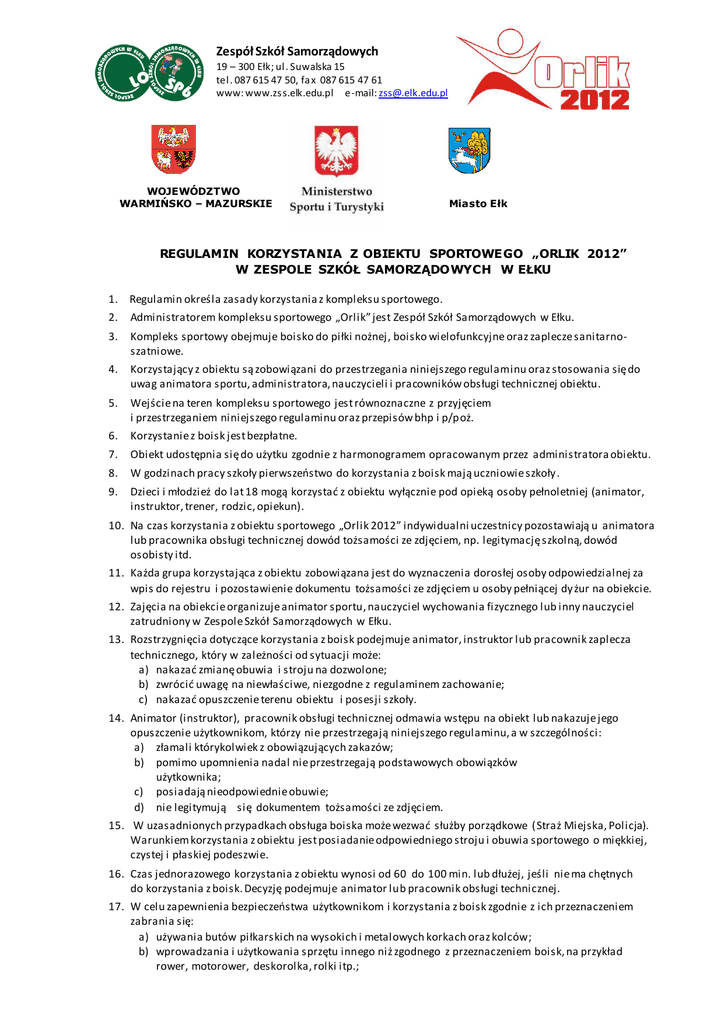 Zespół Szkół Samorządowych 19 – 300 Ełk; ul . Suwalska 15 tel . 087 615 47 50, fa x 087 615 47 61 www: www.zs s.elk.edu.pl e-mail: [email protected] WOJEWÓDZTWO WARMIŃSKO – MAZURSKIE Miasto Ełk REGULAMIN KORZYSTANIA Z OBIEKTU SPORTOWEGO „ORLIK 2012” W ZESPOLE SZKÓŁ SAMORZĄDOWYCH W EŁKU 1. Regulamin określa zasady korzystania z kompleksu sportowego. 2. Administratorem kompleksu sportowego „Orlik” jest Zespół Szkół Samorządowych w Ełku. 3. Kompleks sportowy obejmuje boisko do piłki nożnej, boisko wielofunkcyjne oraz zaplecze sanitarnoszatniowe. 4. Korzystający z obiektu są zobowiązani do przestrzegania niniejszego regulaminu oraz stosowania się do uwag animatora sportu, administratora, nauczycieli i pracowników obsługi technicznej obiektu. 5. Wejście na teren kompleksu sportowego jest równoznaczne z przyjęciem i przestrzeganiem niniejszego regulaminu oraz przepisów bhp i p/poż. 6. Korzystanie z boisk jest bezpłatne. 7. Obiekt udostępnia się do użytku zgodnie z harmonogramem opracowanym przez administratora obiektu. 8. W godzinach pracy szkoły pierwszeństwo do korzystania z boisk mają uczniowie szkoły . 9. Dzieci i młodzież do lat 18 mogą korzystać z obiektu wyłącznie pod opieką osoby pełnoletniej (animator, instruktor, trener, rodzic, opiekun). 10. Na czas korzystania z obiektu sportowego „Orlik 2012” indywidualni uczestnicy pozostawiają u animatora lub pracownika obsługi technicznej dowód tożsamości ze zdjęciem, np. legitymację szkolną, dowód osobisty itd. 11. Każda grupa korzystająca z obiektu zobowiązana jest do wyznaczenia dorosłej osoby odpowiedzialnej za wpis do rejestru i pozostawienie dokumentu tożsamości ze zdjęciem u osoby pełniącej dy żur na obiekcie. 12. Zajęcia na obiekcie organizuje animator sportu, nauczyciel wychowania fizycznego lub inny nauczyciel zatrudniony w Zespole Szkół Samorządowych w Ełku. 13. Rozstrzygnięcia dotyczące korzystania z boisk podejmuje animator, instruktor lub pracownik zaplecza technicznego, który w zależności od sytuacji może: a) nakazać zmianę obuwia i stroju na dozwolone; b) zwrócić uwagę na niewłaściwe, niezgodne z regulaminem zachowanie; c) nakazać opuszczenie terenu obiektu i posesji szkoły. 14. Animator (instruktor), pracownik obsługi technicznej odmawia wstępu na obiekt lub nakazuje jego opuszczenie użytkownikom, którzy nie przestrzegają niniejszego regulaminu, a w szczególności: a) złamali którykolwiek z obowiązujących zakazów; b) pomimo upomnienia nadal nie przestrzegają podstawowych obowiązków użytkownika; c) posiadają nieodpowiednie obuwie; d) nie legitymują się dokumentem tożsamości ze zdjęciem. 15. W uzasadnionych przypadkach obsługa boiska może wezwać służby porządkowe (Straż Miejska, Policja). Warunkiem korzystania z obiektu jest posiadanie odpowiedniego stroju i obuwia sportowego o miękkiej, czystej i płaskiej podeszwie. 16. Czas jednorazowego korzystania z obiektu wynosi od 60 do 100 min. lub dłużej, jeśli nie ma chętnych do korzystania z boisk. Decyzję podejmuje animator lub pracownik obsługi technicznej. 17. W celu zapewnienia bezpieczeństwa użytkownikom i korzystania z boisk zgodnie z ich przeznaczeniem zabrania się: a) używania butów piłkarskich na wysokich i metalowych korkach oraz kolców; b) wprowadzania i użytkowania sprzętu innego niż zgodnego z przeznaczeniem boisk, na przykład rower, motorower, deskorolka, rolki itp.; Zespół Szkół Samorządowych 19 – 300 Ełk; ul . Suwalska 15 tel . 087 615 47 50, fa x 087 615 47 61 www: www.zs s.elk.edu.pl e-mail: [email protected] c) przebywania na terenie obiektu osobom, których stan wskazuje na spożycie alkoholu lub innych środków odurzających; d) wnoszenia przedmiotów pirotechnicznych, broni, kijów, pałek, kamieni, substancji żrących, farb, pojemników pod ciśnieniem, opakowań szklanych i metalowych; e) niszczenia urządzeń sportowych i płyty boiska ; f) wchodzenia na ogrodzenie i urządzenia sportowe; g) palenia tytoniu i spożywania alkoholu, wszelkiego rodzaju środków odurzających, wnoszenia jedzenia oraz żucia gumy; h) zaśmiecania; i) przeszkadzania w zajęciach lub grze; j) zakłócania porządku i używania słów wulgarnych; k) wprowadzania zwierząt; l) korzystania z boisk bez zgody instruktora sportu lub pracownika obsługi technicznej obiektu; m) przebywania i korzystania z obiektów poza godzinami otwarcia ; n) parkowania rowerów na boiskach sportowych i niszczenia trawy wokół ogrodzenia; o) przebywania na terenie boisk osobom poniżej 15 roku życia po zmroku, z wyjątkiem zorganizowanych grup sportowych. 18. Osoby korzystające z obiektu mogą korzystać z pomieszczeń szatni w uzgodnieniu z animatorem lub pracownikiem obsługi technicznej obiektu. 19. Korzystający z obiektu, poza godzinami pracy szkoły, używają swoich piłek, dopuszczonych przez animatorów i pracowników obsługi technicznej . 20. Za zniszczenia powstałe w czasie korzystania z boisk całkowitą odpowiedzialność materialną ponoszą osoby, które zniszczeń dokonały, a w przypadku osób niepełnoletnich rodzice/opiekunowie prawni tych osób. 21. Wyposażenie i sprzęt sportowy, znajdujący się na obiekcie należy użytkować zgodnie z przeznaczeniem. 22. W sytuacji niekorzystnych warunków atmosferycznych o korzystaniu z boi sk decyduje animator sportu lub pracownik obsługi technicznej obiektu. 23. Dopuszcza się możliwość rezerwacji boiska dla grup powyżej 10 osób, nie wcześniej niż 7 dni , przed planowanym terminem zajęć u animatora, który ustala harmonogram imprez oraz rozkład treningów i rozgrywek przeprowadzanych na terenie obiektów sportowych. 24. Nie będzie prowadzona rezerwacja stała. 25. Uwagi dotyczące funkcjonowania obiektów sportowych można zgłaszać do administratora, animatorów lub pracownika obsługi technicznej obiektu. 26. Kompleks objęty jest ciągłym monitorowaniem. 27. Niezasto