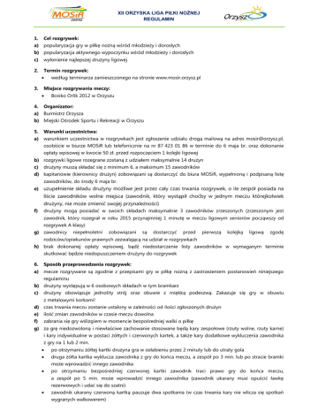 XII ORZYSKA LIGA PIŁKI NOŻNEJ REGULAMIN 1. Cel rozgrywek: a) popularyzacja gry w piłkę nożną wśród młodzieży i dorosłych b) popularyzacja aktywnego wypoczynku wśród młodzieży i dorosłych c) wyłonienie najlepszej drużyny ligowej 2. Termin rozgrywek: 3. Miejsce rozgrywania meczy: 4. według terminarza zamieszczonego na stronie www.mosir.orzysz.pl Boisko Orlik 2012 w Orzyszu Organizator: a) Burmistrz Orzysza b) Miejski Ośrodek Sportu i Rekreacji w Orzyszu 5. Warunki uczestnictwa: a) warunkiem uczestnictwa w rozgrywkach jest zgłoszenie udziału drogą mailową na adres [email protected], osobiście w biurze MOSiR lub telefonicznie na nr 87 423 01 86 w terminie do 6 maja br. oraz dokonanie opłaty wpisowej w kwocie 50 zł. przed rozpoczęciem 1 kolejki ligowej b) rozgrywki ligowe rozegrane zostaną z udziałem maksymalnie 14 drużyn c) drużyny muszą składać się z minimum 6, a maksimum 15 zawodników d) kapitanowie (kierownicy drużyn) zobowiązani są dostarczyć do biura MOSiR, wypełnioną i podpisaną listę zawodników, do środy 6 maja br. e) uzupełnienie składu drużyny możliwe jest przez cały czas trwania rozgrywek, o ile zespół posiada na liście zawodników wolne miejsca (zawodnik, który wystąpił choćby w jednym meczu którejkolwiek drużyny, nie może zmienić swojej przynależności) f) drużyny mogą posiadać w swoich składach maksymalnie 3 zawodników zrzeszonych (zrzeszonym jest zawodnik, który rozegrał w roku 2015 przynajmniej 1 minutę w meczu ligowym seniorów począwszy od rozgrywek A klasy) g) zawodnicy niepełnoletni zobowiązani są dostarczyć przed pierwszą kolejką ligową zgodę rodziców/opiekunów prawnych zezwalającą na udział w rozgrywkach h) brak dokonanej opłaty wpisowej, bądź niedostarczenie listy zawodników w wymaganym terminie skutkować będzie niedopuszczeniem drużyny do rozgrywek 6. Sposób przeprowadzenia rozgrywek: a) mecze rozgrywane są zgodnie z przepisami gry w piłkę nożną z zastrzeżeniem postanowień niniejszego regulaminu b) drużyny występują w 6 osobowych składach w tym bramkarz c) drużyny obowiązuje jednolity strój oraz obuwie z miękką podeszwą. Zakazuje się gry w obuwiu z metalowymi korkami! d) czas trwania meczu zostanie ustalony w zależności od ilości zgłoszonych drużyn e) ilość zmian zawodników w czasie meczu dowolna f) zabrania się gry wślizgiem w momencie bezpośredniej walki o piłkę g) za grę niedozwoloną i niewłaściwe zachowanie stosowane będą kary zespołowe (rzuty wolne, rzuty karne) i kary indywidualne w postaci żółtych i czerwonych kartek, a także kary dodatkowe wykluczenia zawodnika z gry na 1 lub 2 min. po otrzymaniu żółtej kartki drużyna gra w osłabieniu przez 2 minuty lub do utraty gola druga żółta kartka wyklucza zawodnika z gry do końca meczu, a zespół po 3 min. lub po stracie bramki może wprowadzić innego zawodnika po otrzymaniu bezpośredniej czerwonej kartki zawodnik traci prawo gry do końca meczu, a zespół po 5 min. może wprowadzić innego zawodnika (zawodnik ukarany musi opuścić ławkę rezerwowych i udać się do szatni) zawodnik ukarany czerwoną kartką pauzuje dwa spotkania (w czas trwania kary nie wlicza się spotkań wygranych walkowerem) XII ORZYSKA LIGA PIŁKI NOŻNEJ REGULAMIN Komisja Ligi, w przypadku nagannego zachowania zawodnika, ma prawo wydłużyć karę zawieszenia żółte kartki są kumulowane - po 2 zawodnik pauzuje 1 mecz, po 4 pauzuje 2 mecze, a po każdej kolejnej 1 mecz h) drużyna wygrywa mecz walkowerem wynikiem 3:0 jeżeli: drużyna przeciwna nie stawi się na wyznaczone spotkanie w przeciągu 10 minut od terminu rozpoczęcia meczu i) zawodnik drużyny przeciwnej swoim zachowaniem uniemożliwia kontynuowanie gry drużyna przeciwna ma do dyspozycji mniej niż 5 zawodników w drużynie przeciwnej w trakcie gry na boisku przebywał nieuprawniony zawodnik drużyna, która w trakcie rozgrywek zostanie ukarana dwoma walkowerami, zostanie wykluczona z rozgrywek i automatycznie przesunięta na ostatnie miejsce w tabeli j) kolejność zespołów w tabeli ustala się według zdobytych punktów k) w przypadku uzyskania równej ilości punktów przy dwóch zespołach o kolejności decyduje: l) wynik bezpośredniego spotkania korzystniejsza różnica bramek większa liczba zdobytych bramek w przypadku uzyskania równej ilości punktów przez więcej niż dwa zespoły, przeprowadza się dodatkową punktację pomocniczą między zainteresowanymi drużynami i na tej podstawie ustala się kolejność m) mecze muszą być rozgrywane w terminie wyznaczonym przez Organizatora. Istnieje jedynie możliwość zmiany godziny rozgrywania meczu po uzyskaniu zgody kapitana drużyny przeciwnej oraz Organizatora n) przedstawiciel drużyn, przedstawiciel Organizatora oraz sędzia utworzą Komisję Ligi, która rozstrzygać będzie wszelkie sprawy sporne 7. Nagrody: a) zespoły uczestniczące w rozgrywkach otrzymają puchary i dyplomy b) najlepszy bramkarz, strzelec i zawodnik otrzymają nagrody indywidualne c) zespoły, które zajmą miejsca I, II i III otrzymają nagrody rzeczowe w postaci sprzętu sportowego 8. Zasady finansowania: a) drużyny przed startem rozgrywek zobowiązane są uiścić opłatę wpisową w wysokości 50 zł. płatną przelewem na konto Miejskiego Ośrodka Sportu i Rekreacji w Orzyszu (ul. Osiedle Robotnicze 11a, 12250 Orzysz) o nr 40 9364 0000 2003 0012 1516 0003 tytułem: Wpisowe do Orzyskiej Ligi Piłki Nożnej b) wpisowe drużyn sołeckich pokrywa MOSiR w ramach funduszu sołeckiego c) środki pieniężne uzyskane z opłaty wpisowej przeznaczone zostaną na zakup nagród rzeczowych d) o dyspozycji środkami pieniężnymi z tytułu opłaty wpisowej decydują Organizator e) pozostałe koszty organizacyjne pokrywa MOSiR 9. Informacje dodatkowe: a) zawodnicy zostaną ubezpieczeni od następstw nieszczęśliwych wypadków na koszt Organizatora b) zawodnicy zobowiązani są do przestrzegania regulaminu 