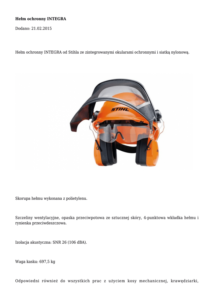 Hełm ochronny INTEGRA Dodano: 21.02.2015 Hełm ochronny INTEGRA od Stihla ze zintegrowanymi okularami ochronnymi i siatką nylonową. Skorupa hełmu wykonana z polietylenu. Szczeliny wentylacyjne, opaska przeciwpotowa ze sztucznej skóry, 4-punktowa wkładka hełmu i rynienka przeciwdeszczowa. Izolacja akustyczna: SNR 26 (106 dBA). Waga kasku: 697,5 kg Odpowiedni również do wszystkich prac z użyciem kosy mechanicznej, krawędziarki, dmuchawy/opryskiwacza i przecinarki. Źródło: Stihl Tekst: KG Komentarze (0) Nie dodano jeszcze żadnego komentarza.