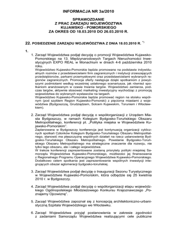 INFORMACJA NR 3a/2010 SPRAWOZDANIE Z PRAC ZARZĄDU WOJEWÓDZTWA KUJAWSKO - POMORSKIEGO ZA OKRES OD 18.03.2010 DO 26.03.2010 R. 22. POSIEDZENIE ZARZĄDU WOJEWÓDZTWA Z DNIA 18.03.2010 R. *) 1. 1. Zarząd Województwa podjął decyzję o promocji Województwa KujawskoPomorskiego na 13. Międzynarodowych Targach Nieruchomości Inwestycyjnych EXPO REAL w Monachium w dniach 4-6 października 2010 roku. Województwo Kujawsko-Pomorskie będzie promowane na podstawie indywidualnych rozmów z przedstawicielami firm zagranicznych i instytucji zrzeszających przedsiębiorców, parkami przemysłowymi oraz przedstawicielami wybranych regionów zagranicznych. Promocja oferty następuje dzięki spotkaniom z powyŜszymi podmiotami według wcześniej ustalonego scenariusza, jak równieŜ spotkaniom aranŜowanym w czasie trwania targów. Województwo zamierza, podczas targów, aktywnie stosować marketing inwestycyjny wychodząc z promocją województwa do wybranych wystawców na targach. Województwo Kujawsko-Pomorskie będzie promować region na stoisku wspólnym (pod szyldem Region Kujawsko-Pomorski) z pięcioma miastami z województwa (Bydgoszczą, Grudziądzem, Solcem Kujawskim, Toruniem i Włocławkiem). 2. Zarząd Województwa podjął decyzję o współorganizacji z Urzędem Miasta Bydgoszczy, w ramach Kolegium Bydgosko-Toruńskiego Obszaru Metropolitalnego, konferencji pt. „Polityka miejska w Województwie Kujawsko-Pomorskim”. Zaplanowana w Bydgoszczy konferencja jest kontynuacją organizacji cyklicznych spotkań Członków Kolegium Bydgosko-Toruńskiego Obszaru Metropolitalnego, stanowić ma płaszczyznę wspólnych działań na rzecz ustanowienia Bydgosko-Toruńskiego Obszaru Metropolitalnego. Powstanie Bydgosko-Toruńskiego Obszaru Metropolitalnego ma strategiczne znaczenie dla rozwoju, nie tylko tego obszaru, ale i całego województwa. W trakcie konferencji zaprezentowane zostaną priorytety polityki miejskiej Samorządu Województwa Kujawsko-Pomorskiego, moŜliwości jej finansowania z Regionalnego Programu Operacyjnego Województwa Kujawsko-Pomorskiego. Dodatkowo celem spotkania jest zaprezentowanie wspólnych inwestycji integrujących obszar aglomeracji bydgosko-toruńskiej. 3. Zarząd Województwa podjął decyzję o Inauguracji Sezonu Turystycznego w Województwie Kujawsko-Pomorskim, która odbędzie się 25 kwietnia 2010 r. w Bydgoszczy. 4. Zarząd Województwa podjął decyzję o współorganizacji etapu wojewódzkiego Ogólnopolskiego MłodzieŜowego Konkursu Krajoznawczego „Poznajemy Ojcowiznę”. 5. Zarząd Województwa zapoznał się z koncepcją architektoniczno-urbanistyczną Szpitala Wojewódzkiego we Włocławku. 6. Zarząd Województwa przyjął postanowienia w zakresie zgodności z zadaniami Samorządu Województwa realizującymi cele publiczne 2 uwzględnione w planie zagospodarowania przestrzennego Województwa Kujawsko-Pomorskiego: - nr 74/10 - w sprawie ponownego uzgodnienia projektu miejscowego planu zagospodarowania przestrzennego obszaru ul. Sądowej w Brodnicy, - nr 75/10 - w sprawie uzgodnienia projektu miejscowego planu zagospodarowania przestrzennego obszaru połoŜonego we wsi RóŜankowo, gmina Łysomice, - nr 76/10 - w sprawie zaopiniowania realizacji inwestycji drogowej polegającej na rozbudowie drogi gminnej od drogi powiatowej nr 1031C Cekcyn-Błądzim w miejscowości Bieszewo, gmina Cekcyn, - nr 77/10 - w sprawie ponownego uzgodnienia projektu miejscowego planu zagospodarowania przestrzennego dla terenów połoŜonych w rejonie wsi Dźwierzno i Kiełbasin, gmina ChełmŜa. 2. Przyjęcie projektów uchwał Sejmiku Województwa - Druk nr 127/10 - w sprawie odwołania przedstawiciela Województwa Kujawsko-Pomorskiego ze składu Rady Społecznej Wojewódzkiego Szpitala dla Nerwowo i Psychicznie Chorych im. dr J. Bednarza w Świeciu. - Druk nr 128/10 - w sprawie wyboru i powołania przedstawiciela Województwa Kujawsko-Pomorskiego do składu Rady Społecznej Wojewódzkiego Szpitala dla Nerwowo i Psychicznie Chorych im. dr J. Bednarza w Świeciu. - Druk nr 129/10 - w sprawie odwołania przedstawiciela Województwa Kujawsko-Pomorskiego ze składu Rady Społecznej Sanatorium Uzdrowiskowego „Przy TęŜni” im. dr Józefa Krzymińskiego w Inowrocławiu s.p.z.o.z. - Druk nr 130/10 - w sprawie wyboru i powołania przedstawiciela Województwa Kujawsko-Pomorskiego do składu Rady Społecznej Sanatorium Uzdrowiskowego „Przy TęŜni” im. dr Józefa Krzymińskiego w Inowrocławiu s.p.z.o.z. - Druk nr 131/10 - w sprawie rozszerzenia działalności Bydgoskiego Centrum Diabetologii i Endokrynologii w Bydgoszczy poprzez utworzenie nowej komórki organizacyjnej. - Druk nr 133/10 - w sprawie wyraŜenia zgody Kujawsko-Pomorskiemu Ośrodkowi Doradztwa Rolniczego w Minikowie na zrzeczenie się prawa uŜytkowania wieczystego gruntu i prawa własności budynków i budowli. - Druk nr 134/10 - w sprawie zatwierdzenia regulaminu organizacyjnego Kujawsko-Pomorskiego Ośrodka Doradztwa Rolniczego w Minikowie. - Druk nr 135/10 - w sprawie wyraŜenia zgody na nieodpłatne przekazanie środków trwałych ruchomych oraz wyposaŜenia będącego w dyspozycji Centrum Konferencyjnego DAGLEZJA w Przysieku. - Druk nr 137/10 - w sprawie wyboru przedstawiciela Sejmiku Województwa Kujawsko-Pomorskiego do Regionalnej Rady Ochrony Przy- 3 rody. - Druk nr 138/10 - w sprawie określenia nakładów finansowych na zorganizowanie usług publicznych w zakresie organizowania i dotowania kolejowych przewozów pasaŜerskich w województwie kujawskopomorskim w okresie od 12 grudnia 2010 roku do 12 grudnia 2020 roku. 3. Uchwały Zarządu Województwa 1. Nr 22/287/10 - wprowadzono zmiany w Uchwale Nr 95/1681/09 z dnia 29 grudnia 2009 r. Zarządu Województwa Kujawsko-Pomorskiego w sprawie przyjęcia harmonogramu konkursów na lata 2008-2013 dla projektów współfinansowanych w ramach Regionalnego Programu Operacyjnego Województwa Kujawsko-Pomorskiego na lata 2007-2013 oraz harmonogramu konkursów n