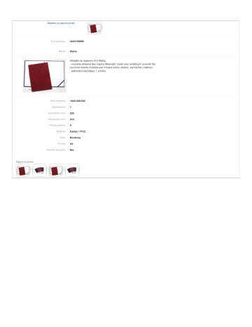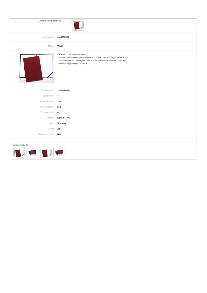 Okładka na dyplom bordo Kod produktu: Marka: okk5100088 Warta Okładka do dyplomu A-4 Warta, - sztywna,oklejana bez napisu Wewnątrz rożek oraz ozdobnym sznurek Na życzenie klienta możliwa jest zmiana koloru okleiny, wymiarów i nadruku - jednostka sprzedazy 1 sztuka Kod dostawcy: Opakowanie: 1 Szerokość (mm): 220 Wysokość (mm): 310 Przeznaczenie: Materiał: Kolor: Format: Okienko do opisu: Zdjęcia produktu 1824-339-030 0 Karton i PVC Bordowy A4 Nie