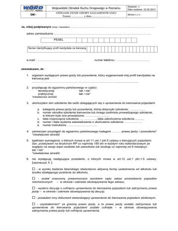 Wojewódzki Ośrodek Ruchu Drogowego w Poznaniu OŚWIADCZENIE OSOBY EGZAMINOWANEJ Numer ………… z dnia ……………… OK- Wydanie: 1 Data wydania: 22.03.2013 Strona 1 z 1 Ja, niżej podpisany/a (imię i nazwisko) …………………………………………………………………………. adres zamieszkania :……………………………………………………………………………………. PESEL Numer identyfikujący profil kandydata na kierowcę e-mail : ……………………………………… numer telefonu : …………………………… oświadczam, że : 1. organem wydającym prawo jazdy lub pozwolenie, który wygenerował mój profil kandydata na kierowcę jest ……………………………………………………………………………........................ 2. przystępuję do egzaminu państwowego w części: teoretycznej tak / nie* praktycznej tak / nie* *niewłaściwe skreślić 3. ukończyłam /em szkolenie dla osób ubiegających się o uprawnienia do kierowania pojazdami a. kategoria prawa jazdy lub pozwolenia, której dotyczyło szkolenie: ……………. b. numer ośrodka szkolenia kierowców lub innego podmiotu prowadzącego szkolenie, w którym było one prowadzone: …………………… c. data rozpoczęcia szkolenia …. …………..data zakończenia szkolenia………. d. numer i data wydania zaświadczenia o ukończeniu szkolenia: ………..……. e. numer instruktora: ………………………… 4. zamierzam przystąpić do egzaminu państwowego kategorii ……… prawa jazdy / pozwolenia* *niewłaściwe skreślić 5. spełniam wymagania, o których mowa w art.11 ust.1 pkt.5 ustawy o kierujących pojazdami (tzn. przebywam na terytorium RP co najmniej 185 dni w każdym roku kalendarzowym ze względu na swoje więzi osobiste lub zawodowe lub studiuję co najmniej od 6 miesięcy): tak / nie* *niewłaściwe skreślić 6. nie występują następujące przesłanki, o których mowa w art.12 ust.1 pkt.1-5 ustawy: (zaznaczyć X ) - w wyniku badania lekarskiego stwierdzono aktywną formę uzależnienia od alkoholu lub środka działającego podobnie do alkoholu, - został orzeczony prawomocnym wyrokiem sądu zakaz prowadzenia pojazdów mechanicznych – w okresie i zakresie obowiązywania tego zakazu, - wydano decyzję o cofnięciu uprawnienia do kierowania pojazdami lub zatrzymaniu prawa jazdy – w okresie i zakresie obowiązywania tej decyzji, - posiadam inny dokument stwierdzający uprawnienie do kierowania pojazdem silnikowym, - uzyskałem/am* za granicą prawo jazdy, a to prawo jazdy zostało zatrzymane lub uprawnienie do kierowania pojazdami zostało cofnięte – w okresie obowiązywania zatrzymania prawa jazdy lub cofnięcia uprawnienia. Wydanie: 1 Data wydania: 22.03.2013 Wojewódzki Ośrodek Ruchu Drogowego w Poznaniu OŚWIADCZENIE OSOBY EGZAMINOWANEJ Numer ………… z dnia ……………… OK- Strona 2 z 1 7. ze względu na brak wymaganego wieku 18 lat posiadam pisemną zgodę rodzica lub opiekuna na przystąpienie do egzaminu na kat. AM,A1,B1,T * (zgodnie z art.11 ust.2 ustawy o kierujących pojazdami): tak / nie dotyczy *. *niewłaściwe skreślić 8. posiadam uprawnienia do kierowania pojazdami (zaznaczyć właściwe) : AM A1 A2 A B1 B B+E B1+E C1 C C+E C1+E D1 D D+E D1+E T Pozwol. 9. posiadam orzeczenie lekarskie o braku przeciwwskazań zdrowotnych do kierowania pojazdem a. b. c. d. w zakresie ……………… , z datą wydania……………………, terminem ważności …………….., ograniczeniami …………….……….., (wpisać lub skreślić jeśli nie dotyczy) 10. posiadam orzeczenie psychologiczne o braku przeciwwskazań psychologicznych do kierowania pojazdem (wpisać lub skreślić jeśli nie dotyczy) a. w zakresie ……………… , b. z datą wydania……………………, c. terminem ważności ……………… Informuję ponadto, że zostałem/am skierowany/a na kontrolne sprawdzenie kwalifikacji w trybie art. (wpisać należy podstawę prawną lub „nie dotyczy”): ……………………………….................................................... Załączam: o Dowód uiszczenia opłaty za egzamin : tak / nie* o Wniosek, o którym mowa w art.54 ust.6 ustawy o kierujących pojazdami, dot. uczestniczenia dodatkowo egzaminatora, który nadzoruje dany egzamin, wyznaczonego przez Dyrektora WORD w Poznaniu : tak / nie* o Wniosek, o którym mowa w art.55 ust.1 ustawy o kierujących pojazdami, dot. uczestniczenia dodatkowo w części praktycznej egzaminu instruktora, który szkolił daną osobę : tak / nie*. (Imię i nazwisko oraz numer instruktora jeśli dotyczy : ……………………………………………….) *niewłaściwe skreślić Wyrażam zgodę na przetwarzanie moich danych osobowych dla potrzeb niezbędnych do przeprowadzenia egzaminu państwowego na prawo jazdy i wydania uprawnień w zakresie, o jaki się ubiegam. Świadomy/a odpowiedzialności karnej wynikającej z art.233 kodeksu karnego za składanie fałszywych zeznań oświadczam, że w/w dane są prawdziwe. …………………… …………………………………... /data/ /czytelny podpis/ Podstawa prawna : rozporządzenie MTBiGM z dnia 5 marca 2013r. zmieniające rozporządzenie w sprawie egzaminowania osób ubiegających się o uprawnienia do kierowania pojazdami, szkolenia, egzaminowania i uzyskiwania uprawnień przez egzaminatorów oraz wzorów dokumentów stosowanych w tych sprawach (Dz. U. z 2013r. poz.319). WORD w Poznaniu nie ponosi odpowiedzialności za skutki wywołane podaniem niezgodnych danych ze stanem faktycznym. --------------------------------------------------------------------------------------------------------------------------- -----------Potwierdzam odbiór oświadczenia od osoby egzaminowanej i prawidłowość wypełnienia dokumentów po ich weryfikacji z dokumentem tożsamości. ………………………………….. /czytelny podpis pracownika