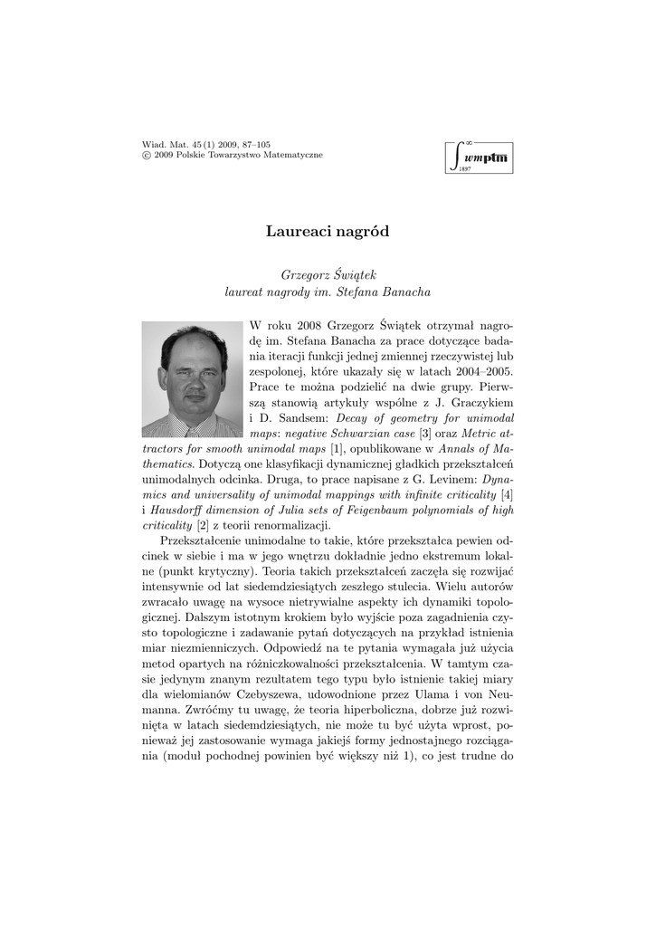 Wiad. Mat. 45 (1) 2009, 87–105 c 2009 Polskie Towarzystwo Matematyczne Laureaci nagród Grzegorz Świątek laureat nagrody im. Stefana Banacha W roku 2008 Grzegorz Świątek otrzymał nagrodę im. Stefana Banacha za prace dotyczące badania iteracji funkcji jednej zmiennej rzeczywistej lub zespolonej, które ukazały się w latach 2004–2005. Prace te można podzielić na dwie grupy. Pierwszą stanowią artykuły wspólne z J. Graczykiem i D. Sandsem: Decay of geometry for unimodal maps: negative Schwarzian case [3] oraz Metric attractors for smooth unimodal maps [1], opublikowane w Annals of Mathematics. Dotyczą one klasyfikacji dynamicznej gładkich przekształceń unimodalnych odcinka. Druga, to prace napisane z G. Levinem: Dynamics and universality of unimodal mappings with infinite criticality [4] i Hausdorff dimension of Julia sets of Feigenbaum polynomials of high criticality [2] z teorii renormalizacji. Przekształcenie unimodalne to takie, które przekształca pewien odcinek w siebie i ma w jego wnętrzu dokładnie jedno ekstremum lokalne (punkt krytyczny). Teoria takich przekształceń zaczęła się rozwijać intensywnie od lat siedemdziesiątych zeszłego stulecia. Wielu autorów zwracało uwagę na wysoce nietrywialne aspekty ich dynamiki topologicznej. Dalszym istotnym krokiem było wyjście poza zagadnienia czysto topologiczne i zadawanie pytań dotyczących na przykład istnienia miar niezmienniczych. Odpowiedź na te pytania wymagała już użycia metod opartych na różniczkowalności przekształcenia. W tamtym czasie jedynym znanym rezultatem tego typu było istnienie takiej miary dla wielomianów Czebyszewa, udowodnione przez Ulama i von Neumanna. Zwróćmy tu uwagę, że teoria hiperboliczna, dobrze już rozwinięta w latach siedemdziesiątych, nie może tu być użyta wprost, ponieważ jej zastosowanie wymaga jakiejś formy jednostajnego rozciągania (moduł pochodnej powinien być większy niż 1), co jest trudne do 88 Laureaci nagród uzyskania w obliczu istnienia punktu krytycznego, w którym pochodna jest 0. Z tego względu dynamika gładka przekształceń unimodalnych dla dalszego rozwoju wymagała nowych metod, o czym jeszcze wspomnimy. W latach osiemdziesiątych nastąpił burzliwy rozwój powyższej teorii i rozwiązanie wielu problemów. W szczególności, udało się sklasyfikować i zrozumieć możliwe typy dynamiki, pozostało jednak pytanie o „dziwne atraktory”. Jeden z przypadków dynamiki, określany jako topologicznie tranzytywny, polega na tym, że orbita punktu typowego w sensie topologicznym jest gęsta w całej przestrzeni fazowej (w naszym przypadku chodzi o odcinek pomiędzy drugim i pierwszym obrazem punktu krytycznego). Typowy w sensie topologicznym oznacza tu każdy punkt z pewnego zbioru gęstego będącego przecięciem przeliczalnie wielu zbiorów otwartych, zgodnie z teorią kategorii Baire’a. Pytanie polega na tym, czy to samo można powiedzieć o trajektorii prawie każdego punktu w sensie metrycznym, tj. każdego spoza pewnego zbioru miary Lebesgue’a zero. Odpowiedź na to pytanie poznano w latach dziewięćdziesiątych. Okazuje się, że dla przekształceń będących wielomianami kwadratowymi typowe zachowanie metryczne i topologiczne jest takie samo [16], ale z drugiej strony, dla wielomianu dostatecznie wysokiego stopnia, nadal będącego przekształceniem unimodalnym, tranzytywność topologiczna może współistnieć z sytuacją, w której orbity ze zbioru pełnej miary Lebesgue’a dążą do pewnego zbioru Cantora, a więc nie mogą być gęste w jakimkolwiek odcinku [5]. Subtelny charakter tej odpowiedzi od razu wyjaśnia, dlaczego pytanie było tak trudne, nie jest bowiem łatwo o metody, które rozróżniają rząd punktu krytycznego. Użyte narzędzia sprowadzały problem do dynamiki wielomianu w płaszczyźnie zespolonej. Z tego względu uogólnienie rezultatu z pracy [16] na przypadek przekształceń gładkich z punktem krytycznym rzędu 2 okazało się trudne techniczne i pracom z lat dziewięćdziesiątych podejmującym się tego zadania wytknięto później istotne nieścisłości. Graczyk, Sands i Świątek w swoich pracach w Annals of Mathematics powrócili do tego problemu oraz do problemów pokrewnych, zamykając, jak się wydaje, problem klasyfikacji dynamicznej przekształceń unimodalnych klasy C 3 . Prace te opierają się częściowo na dość zaawansowanym aparacie analitycznym, pozwalającym przybliżać przekształcenia gładkie przez analityczne, częściowo zaś na pomyśle uzyskania ważnej technicznie własności ujemnej pochodnej Schwarza poprzez analityczną zmianę układu współrzędnych. Laureaci nagród 89 Przejdziemy teraz do zarysowania problemów z teorii renormalizacji, których dotyczyły pozostałe prace Świątka przedstawione do nagrody. Dla jednoparametrowych rodzin przekształceń unimodalnych, takich jak fa (x) = ax(1 − x), gdy zwiększamy parametr a, obserwujemy tak zwaną kaskadę podwojenia okresu; pojawiają się mianowicie orbity okresowe przyciągające okresu 1, 2, 4, 8, itd. Zjawisko to znane już było z prac Metropolisa i Steinów [18, 19]. W roku 1978, M. Feigenbaum [7] w USA, a Ch. Tresser i P. Coullet [21] we Francji, postanowili zbadać je z punktu widzenia ilościowego, za pomocą komputerów. Okazało się, że odległości w przestrzeni parametrów między kolejnymi podwojeniami okresu tworzą ciąg praktycznie geometryczny. Podobnie, dla odpowiednich wartości parametru odległości orbity okresowej od punktu krytycznego również zachowywały się jak ciąg geometryczny. Co więcej, dalsze badania wykazały, że ilorazy dla tych ciągów geometrycznych wydają się być w zasadzie niezależne od wyjściowej rodziny przekształceń, a zależą jedynie od rzędu punktu krytycznego. Zjawisko to nazwano uniwersalnością Feigenbauma. Na zrozumienie tego zjawiska został skierowany ogromny wysiłek wielu znakomitych matematyków. We wczesnych latach osiemdzi