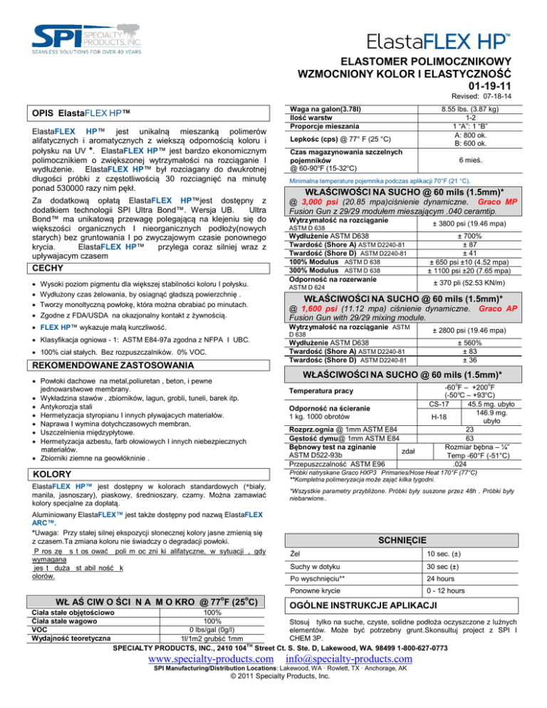 ELASTOMER POLIMOCZNIKOWY WZMOCNIONY KOLOR I ELASTYCZNOŚĆ 01-19-11 Revised: 07-18-14 OPIS ElastaFLEX HP™ ElastaFLEX HP™ jest unikalną mieszanką polimerów alifatycznych i aromatycznych z wiekszą odpornością koloru i połysku na UV *. ElastaFLEX HP™ jest bardzo ekonomicznym polimocznikiem o zwiększonej wytrzymałości na rozciąganie I wydłużenie. ElastaFLEX HP™ był rozciagany do dwukrotnej długości próbki z częstotliwością 30 rozciagnięć na minutę ponad 530000 razy nim pękł. Za dodatkową opłatą ElastaFLEX HP™jest dostępny z dodatkiem technologii SPI Ultra Bond™. Wersja UB. Ultra Bond™ ma unikatową przewagę polegającą na klejeniu się do większości organicznych I nieorganicznych podłoży(nowych starych) bez gruntowania I po zwyczajowym czasie ponownego krycia. ElastaFLEX HP™ przylega coraz silniej wraz z upływajacym czasem CECHY Wysoki poziom pigmentu dla większej stabilności koloru I połysku. Wydłużony czas żelowania, by osiagnąć gładszą powierzchnię . Tworzy monoltyczną powłokę, która można obrabiać po minutach. Zgodne z FDA/USDA na okazjonalny kontakt z żywnością. FLEX HP™ wykazuje małą kurczliwość. 100% ciał stałych. Bez rozpuszczalników. 0% VOC. REKOMENDOWANE ZASTOSOWANIA Powłoki dachowe na metal,poliuretan , beton, i pewne jednowarstwowe membrany. Wykładzina stawów , zbiorników, lagun, grobli, tuneli, barek itp. Antykorozja stali Hermetyzacja styropianu I innych pływajacych materiałów. Naprawa I wymina dotychczasowych membran. Uszczelnienia międzypłytowe. Hermetyzacja azbestu, farb ołowiowych I innych niebezpiecznych materiałów. Zbiorniki ziemne na geowłókninie . KOLORY ElastaFLEX HP™ jest dostępny w kolorach standardowych (*biały, manila, jasnoszary), piaskowy, średnioszary, czarny. Można zamawiać kolory specjalne za dopłatą. Aluminiowany ElastaFLEX™ jest także dostępny pod nazwą ElastaFLEX ARC™. *Uwaga: Przy stałej silnej ekspozycji słonecznej kolory jasne zmienią się z czasem.Ta zmiana koloru nie świadczy o degradacji powłoki. P ros zę s t os ować poli m oc zni ki alifatyczne, w sytuacji , gdy wymagana jes t duża st abil ność k olorów. Lepkośc (cps) @ 77° F (25 °C) Czas magazynowania szczelnych pojemników @ 60-90oF (15-32oC) 8.55 lbs. (3.87 kg) 1-2 1 “A”: 1 “B” A: 800 ok. B: 600 ok. WŁ AŚ CIW O ŚCI N A M O KRO @ 77oF (25oC) 6 mieś. Minimalna temperature pojemnika podczas aplikacji 70°F (21 °C). WŁAŚCIWOŚCI NA SUCHO @ 60 mils (1.5mm)* @ 3,000 psi (20.85 mpa)ciśnienie dynamiczne. Graco MP Fusion Gun z 29/29 modułem mieszającym .040 ceramtip. Wytrzymałość na rozciąganie ASTM D 638 Wydłużenie ASTM D638 Twardość (Shore A) ASTM D2240-81 Twardość (Shore D) ASTM D2240-81 100% Modulus ASTM D 638 300% Modulus ASTM D 638 Odporność na rozerwanie ASTM D 624 ± 3800 psi (19.46 mpa) ± 700% ± 87 ± 41 ± 650 psi ±10 (4.52 mpa) ± 1100 psi ±20 (7.65 mpa) ± 370 pli (52.53 KN/m) WŁAŚCIWOŚCI NA SUCHO @ 60 mils (1.5mm)* @ 1,600 psi (11.12 mpa) ciśnienie dynamiczne. Fusion Gun with 29/29 mixing module. Wytrzymałość na rozciąganie ASTM Klasyfikacja ogniowa - 1: ASTM E84-97a zgodna z NFPA I UBC. Waga na galon(3.78l) Ilość warstw Proporcje mieszania D 638 Graco AP ± 2800 psi (19.46 mpa) Wydłużenie ASTM D638 Twardość (Shore A) ASTM D2240-81 Twardośc (Shore D) ASTM D2240-81 ± 560% ± 83 ± 36 WŁAŚCIWOŚCI NA SUCHO @ 60 mils (1.5mm)* o Temperatura pracy Odporność na ścieranie 1 kg. 1000 obrotów Rozprz.ognia @ 1mm ASTM E84 Gęstość dymu@ 1mm ASTM E84 Bębnowy test na zginanie zdał ASTM D522-93b Przepuszczalność ASTM E96 o -60 F – +200 F (-50 oC – +93oC) CS-17 45.5 mg. ubyło 146.9 mg. H-18 ubyło 23 63 Rozmiar bębna – ¼” Temp -60°F (-51°C) .024 Próbki natryskane Graco HXP3 Primaries/Hose Heat 170°F (77°C) **Kompletna polimeryzacja może zająć kilka tygodni. *Wszystkie parametry przybliżone. Próbki były suszone przez 48h . Próbki były niebarwione.. SCHNIĘCIE Żel 10 sec. (±) Suchy w dotyku 30 sec (±) Po wyschnięciu** 24 hours Ponowne krycie 0 - 12 hours OGÓLNE INSTRUKCJE APLIKACJI Ciała stałe objętościowo 100% Ćiała stałe wagowo 100% Stosuj tylko na suche, czyste, solidne podłoża oczyszczone z luźnych VOC 0 lbs/gal (0g/l) elementów. Może być potrzebny grunt.Skonsultuj project z SPI I CHEM 3P. Wydajność teoretyczna 1l/1m2 grubść 1mm TH SPECIALTY PRODUCTS, INC., 2410 104 Street Ct. S. Ste. D, Lakewood, WA. 98499 1-800-627-0773 www.specialty-products.com [email protected] SPI Manufacturing/Distribution Locations: Lakewood, WA · Rowlett, TX · Anchorage, AK © 2011 Specialty Products, Inc. ELASTAFLEX HP™ Page Two ELASTAFLEX HP można używać w szerokim zakresie temperature powietrza I podłoża. Zapytaj SPI o specyficzne wytyczne projektu. Rekomenduje się natryskiwanie wielokierunkowo południe/wschód-zachód by uzyskać równe pokrycie. (północ- Komponent B musi być starannie ,maszynowo wymieszany codziennie przed każdym użyciem .Zapytaj SPI o właściwe mieszalniki. Stosuj się do instrukcji na zbiornikach “A” i “B” . REKOMENDOWANE WYPOSAŻENIE I USTAWIENIA Standardardowe 1:1 ratio, podgrzewane, dwukomponentowe wyposażenie minimum 1800 psi (17.4 mpa)ciśnienia dynamicznego zdolne podgrzać do 175° F (79 °C) będzie właściwie natryskiwać K5™. Graco 20/35, 20/35 Pro, H-3500, HV 20/35, Reactor E-XP1, EXP2, H-XP2, H-XP3, and SPI Gusmer 25/25. Pistolety Graco Fusion MP, Gap Pro, GX7-DI, and GX-8 Progun. Podgrzewanie wstępne 160-170°F (71-76 °C). Temperatura węża 160 -170° F (71-76°C). Termometr wsuniety pod izolację koło pistoletu powinien wskazywać minimum 145-155°F (6368°C). Właściwości fizyczne będą wzmocnione przy natrysku o wyższym ciśnieniu (3000 psi lub więcej) (20.8mpa), przy użyciu pistoletu Gusmer MP Fusion lub GX7-DI. MIESZANIE I ROZCIEŃCZANIE Komponent B mieszać codziennie. Nie rozcieńczać. OGÓLNE INFORMACJE O TOKSYCZNOŚCI