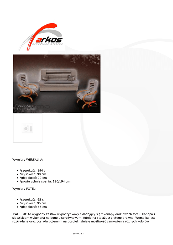 Wymiary WERSALKA: *szerokość: 194 cm *wysokość: 90 cm *głębokość: 90 cm *powierzchnia spania: 120/194 cm Wymiary FOTEL: *szerokość: 65 cm *wysokość: 95 cm *głębokość: 65 cm PALERMO to wygodny zestaw wypoczynkowy składający się z kanapy oraz dwóch foteli. Kanapa z siedziskiem wykonana na bonelu sprężynowym, fotele na stelażu z giętego drewna. Wersalka jest rozkładana oraz posiada pojemnik na pościel. Istnieje możliwość zamówienia różnych kolorów Strona 1 z 2 drewna. Dostępne kolory to: buk, olcha, calvados, orzech. Mebel dostępny w czterech wariantach kolorystycznych: BIB 1 / BIB 2 DOT 22 / PRESTON 94 BONN 95 / BONN 90 MELANGE BRĄZ / BEŻ Przy zamówieniu w innym wybarwieniu kolorystycznym dopłata 10% do mebla. Strona 2 z 2