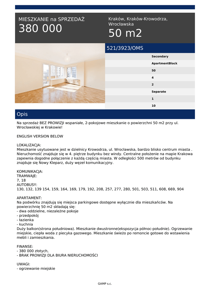 Kraków, Kraków-Krowodrza, Wrocławska MIESZKANIE na SPRZEDAŻ 380 000 50 m2 521/3923/OMS Secondary ApartmentBlock 50 4 2 Separate 1 10 Opis Na sprzedaż BEZ PROWIZJI wspaniałe, 2-pokojowe mieszkanie o powierzchni 50 m2 przy ul. Wrocławskiej w Krakowie! ENGLISH VERSION BELOW LOKALIZACJA: Mieszkanie usytuowane jest w dzielnicy Krowodrza, ul. Wrocławska, bardzo blisko centrum miasta . Nieruchomość znajduje się w 4. piętrze budynku bez windy. Centralne położenie na mapie Krakowa zapewnia dogodne połączenie z każdą częścią miasta. W odległości 500 metrów od budynku znajduje się Nowy Kleparz, duży węzeł komunikacyjny. KOMUNIKACJA: TRAMWAJE: 7, 18 AUTOBUSY: 130, 132, 139 154, 159, 164, 169, 179, 192, 208, 257, 277, 280, 501, 503, 511, 608, 669, 904 APARTAMENT: Na podwórku znajdują się miejsca parkingowe dostępne wyłącznie dla mieszkańców. Na powierzchnię 50 m2 składają się: - dwa oddzielne, niezależne pokoje - przedpokój - łazienka - kuchnia Duży balkon(strona południowa). Mieszkanie dwustronne(ekspozycja północ-południe). Ogrzewanie miejskie, ciepła woda z piecyka gazowego. Mieszkanie świeżo po remoncie gotowe do wstawienia mebli i zamieszkania. FINANSE: - 380 000 złotych, - BRAK PROWIZJI DLA BIURA NIERUCHOMOŚCI UWAGI: - ogrzewanie miejskie GAMP s.c. - centralna lokalizacja - świeżo po remoncie - parking dla mieszkańców Serdecznie polecam! Bardzo proszę o kontakt lub o wypełnienie formularza na stronie: http://www.gamp-krakow.pl/zglos-poszukiwanie/ na pewno znajdziemy idealne mieszkanie, spełniające Państwa preferencje. Zachęcamy również do odwiedzenia naszej strony internetowej: www.gamp-krakow.pl For sale wonderful 2 bedroom apartment, 50 sqm at Wrocławska street in Cracow. ENGLISH VERSION BELOW LOCATION: The apartament is located at Wrocławska street - Krowodrza district. The property is located on the 4th floor. Central location on the map of Krakow with good connection to every part of the city. COMMUNICATION - NOWY KLEPARZ STOP: TRAMS: 7, 18 COACHES: 130, 132, 139 154, 159, 164, 169, 179, 192, 208, 257, 277, 280, 501, 503, 511, 608, 669, 904 APARTMENT: The apartment has 50 sqm and consist of: - Two separate bedrooms, - Hall - bathroom - kitchen Large balcony (south side). District heating, hot water from gas boiler. Apartment newly renovated. FINANCES: - 380 000 PLN COMMENTS: - District heating - Central location - Newly renovated - Parking for residents I would heartily recommend! Please contact us or fill out the form on the page: http://www.gamp-krakow.pl/zglos-poszukiwanie/ we will certainly find the ideal apartment to meet your preferences. We also encourage you to visit our website: www.gamp-krakow.pl KONTAKT DO AGENTA: Maciej Pacholec Tel.: +48 798 435 650 Email: [email protected] GAMP Nieruchomości. Nowa jakość. GAMP s.c. Maciej Pacholec tel. +48 798 435 650 email: [email protected] GAMP s.c. Powered by TCPDF (www.tcpdf.org)