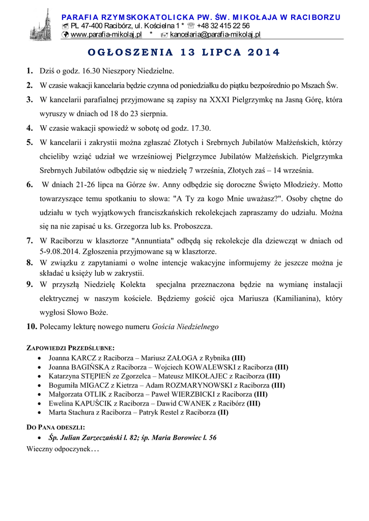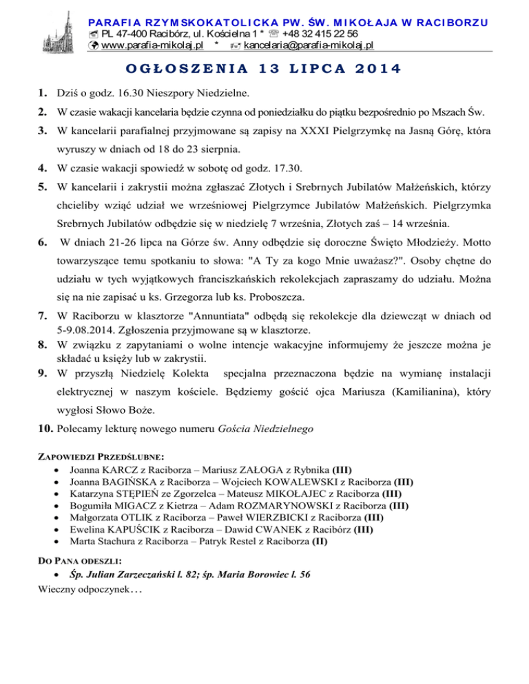 PARAFI A RZ Y M SK OK AT OL I CK A PW . ŚW . M I K OŁ AJA W RACI BORZ U PL 47-400 Racibórz, ul. Kościelna 1 * +48 32 415 22 56 www.parafia-mikolaj.pl * [email protected] OGŁOSZENIA 13 LIPCA 2014 1. Dziś o godz. 16.30 Nieszpory Niedzielne. 2. W czasie wakacji kancelaria będzie czynna od poniedziałku do piątku bezpośrednio po Mszach Św. 3. W kancelarii parafialnej przyjmowane są zapisy na XXXI Pielgrzymkę na Jasną Górę, która wyruszy w dniach od 18 do 23 sierpnia. 4. W czasie wakacji spowiedź w sobotę od godz. 17.30. 5. W kancelarii i zakrystii można zgłaszać Złotych i Srebrnych Jubilatów Małżeńskich, którzy chcieliby wziąć udział we wrześniowej Pielgrzymce Jubilatów Małżeńskich. Pielgrzymka Srebrnych Jubilatów odbędzie się w niedzielę 7 września, Złotych zaś – 14 września. 6. W dniach 21-26 lipca na Górze św. Anny odbędzie się doroczne Święto Młodzieży. Motto towarzyszące temu spotkaniu to słowa: "A Ty za kogo Mnie uważasz?". Osoby chętne do udziału w tych wyjątkowych franciszkańskich rekolekcjach zapraszamy do udziału. Można się na nie zapisać u ks. Grzegorza lub ks. Proboszcza. 7. W Raciborzu w klasztorze "Annuntiata" odbędą się rekolekcje dla dziewcząt w dniach od 5-9.08.2014. Zgłoszenia przyjmowane są w klasztorze. 8. W związku z zapytaniami o wolne intencje wakacyjne informujemy że jeszcze można je składać u księży lub w zakrystii. 9. W przyszłą Niedzielę Kolekta specjalna przeznaczona będzie na wymianę instalacji elektrycznej w naszym kościele. Będziemy gościć ojca Mariusza (Kamilianina), który wygłosi Słowo Boże. 10. Polecamy lekturę nowego numeru Gościa Niedzielnego ZAPOWIEDZI PRZEDŚLUBNE: Joanna KARCZ z Raciborza – Mariusz ZAŁOGA z Rybnika (III) Joanna BAGIŃSKA z Raciborza – Wojciech KOWALEWSKI z Raciborza (III) Katarzyna STĘPIEŃ ze Zgorzelca – Mateusz MIKOŁAJEC z Raciborza (III) Bogumiła MIGACZ z Kietrza – Adam ROZMARYNOWSKI z Raciborza (III) Małgorzata OTLIK z Raciborza – Paweł WIERZBICKI z Raciborza (III) Ewelina KAPUŚCIK z Raciborza – Dawid CWANEK z Racibórz (III) Marta Stachura z Raciborza – Patryk Restel z Raciborza (II) DO PANA ODESZLI: Śp. Julian Zarzeczański l. 82; śp. Maria Borowiec l. 56 Wieczny odpoczynek…