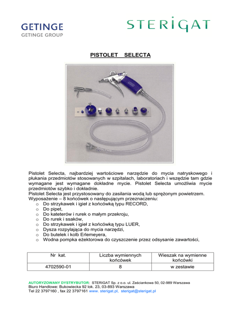 PISTOLET SELECTA Pistolet Selecta, najbardziej wartościowe narzędzie do mycia natryskowego i płukania przedmiotów stosowanych w szpitalach, laboratoriach i wszędzie tam gdzie wymagane jest wymagane dokładne mycie. Pistolet Selecta umożliwia mycie przedmiotów szybko i dokładnie. Pistolet Selecta jest przystosowany do zasilania wodą lub sprężonym powietrzem. Wyposażenie – 8 końcówek o następującym przeznaczeniu: o Do strzykawek i igieł z końcówką typu RECORD, o Do pipet, o Do kateterów i rurek o małym przekroju, o Do rurek i ssaków, o Do strzykawek i igieł z końcówką typu LUER, o Dysza rozpylająca do mycia narzędzi, o Do butelek i kolb Erlemeyera, o Wodna pompka eżektorowa do czyszczenie przez odsysanie zawartości, Nr kat. 4702590-01 Liczba wymiennych końcówek 8 Wieszak na wymienne końcówki w zestawie AUTORYZOWANY DYSTRYBUTOR: STERIGAT Sp. z o.o. ul. Zaściankowa 50, 02-989 Warszawa Biuro Handlowe: Bukowiecka 92 lok. 23, 03-893 Warszawa Tel 22 3797160 , fax 22 3797161 www. sterigat.pl, [email protected]
