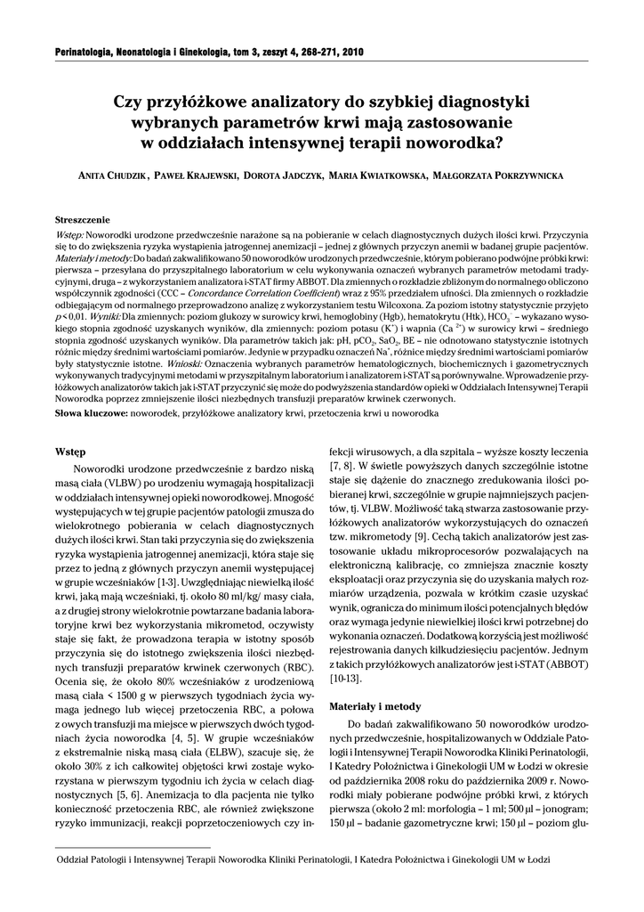Perinatologia, Neonatologia i Ginekologia, tom 3, zeszyt 4, 268-271, 2010 Czy przyłóżkowe analizatory do szybkiej diagnostyki wybranych parametrów krwi mają zastosowanie w oddziałach intensywnej terapii noworodka? ANITA CHUDZIK , PAWEŁ KRAJEWSKI, DOROTA JADCZYK, MARIA KWIATKOWSKA, MAŁGORZATA POKRZYWNICKA Streszczenie Wstęp: Noworodki urodzone przedwcześnie narażone są na pobieranie w celach diagnostycznych dużych ilości krwi. Przyczynia się to do zwiększenia ryzyka wystąpienia jatrogennej anemizacji – jednej z głównych przyczyn anemii w badanej grupie pacjentów. Materiały i metody: Do badań zakwalifikowano 50 noworodków urodzonych przedwcześnie, którym pobierano podwójne próbki krwi: pierwsza – przesyłana do przyszpitalnego laboratorium w celu wykonywania oznaczeń wybranych parametrów metodami tradycyjnymi, druga – z wykorzystaniem analizatora i-STAT firmy ABBOT. Dla zmiennych o rozkładzie zbliżonym do normalnego obliczono współczynnik zgodności (CCC – Concordance Correlation Coefficient) wraz z 95% przedziałem ufności. Dla zmiennych o rozkładzie odbiegającym od normalnego przeprowadzono analizę z wykorzystaniem testu Wilcoxona. Za poziom istotny statystycznie przyjęto p < 0,01. Wyniki: Dla zmiennych: poziom glukozy w surowicy krwi, hemoglobiny (Hgb), hematokrytu (Htk), HCO3! – wykazano wysokiego stopnia zgodność uzyskanych wyników, dla zmiennych: poziom potasu (K+) i wapnia (Ca 2+) w surowicy krwi – średniego stopnia zgodność uzyskanych wyników. Dla parametrów takich jak: pH, pCO2, SaO2, BE – nie odnotowano statystycznie istotnych różnic między średnimi wartościami pomiarów. Jedynie w przypadku oznaczeń Na+, różnice między średnimi wartościami pomiarów były statystycznie istotne. Wnioski: Oznaczenia wybranych parametrów hematologicznych, biochemicznych i gazometrycznych wykonywanych tradycyjnymi metodami w przyszpitalnym laboratorium i analizatorem i-STAT są porównywalne. Wprowadzenie przyłóżkowych analizatorów takich jak i-STAT przyczynić się może do podwyższenia standardów opieki w Oddziałach Intensywnej Terapii Noworodka poprzez zmniejszenie ilości niezbędnych transfuzji preparatów krwinek czerwonych. Słowa kluczowe: noworodek, przyłóżkowe analizatory krwi, przetoczenia krwi u noworodka Wstęp Noworodki urodzone przedwcześnie z bardzo niską masą ciała (VLBW) po urodzeniu wymagają hospitalizacji w oddziałach intensywnej opieki noworodkowej. Mnogość występujących w tej grupie pacjentów patologii zmusza do wielokrotnego pobierania w celach diagnostycznych dużych ilości krwi. Stan taki przyczynia się do zwiększenia ryzyka wystąpienia jatrogennej anemizacji, która staje się przez to jedną z głównych przyczyn anemii występującej w grupie wcześniaków [1-3]. Uwzględniając niewielką ilość krwi, jaką mają wcześniaki, tj. około 80 ml/kg/ masy ciała, a z drugiej strony wielokrotnie powtarzane badania laboratoryjne krwi bez wykorzystania mikrometod, oczywisty staje się fakt, że prowadzona terapia w istotny sposób przyczynia się do istotnego zwiększenia ilości niezbędnych transfuzji preparatów krwinek czerwonych (RBC). Ocenia się, że około 80% wcześniaków z urodzeniową masą ciała < 1500 g w pierwszych tygodniach życia wymaga jednego lub więcej przetoczenia RBC, a połowa z owych transfuzji ma miejsce w pierwszych dwóch tygodniach życia noworodka [4, 5]. W grupie wcześniaków z ekstremalnie niską masą ciała (ELBW), szacuje się, że około 30% z ich całkowitej objętości krwi zostaje wykorzystana w pierwszym tygodniu ich życia w celach diagnostycznych [5, 6]. Anemizacja to dla pacjenta nie tylko konieczność przetoczenia RBC, ale również zwiększone ryzyko immunizacji, reakcji poprzetoczeniowych czy in- fekcji wirusowych, a dla szpitala – wyższe koszty leczenia [7, 8]. W świetle powyższych danych szczególnie istotne staje się dążenie do znacznego zredukowania ilości pobieranej krwi, szczególnie w grupie najmniejszych pacjentów, tj. VLBW. Możliwość taką stwarza zastosowanie przyłóżkowych analizatorów wykorzystujących do oznaczeń tzw. mikrometody [9]. Cechą takich analizatorów jest zastosowanie układu mikroprocesorów pozwalających na elektroniczną kalibrację, co zmniejsza znacznie koszty eksploatacji oraz przyczynia się do uzyskania małych rozmiarów urządzenia, pozwala w krótkim czasie uzyskać wynik, ogranicza do minimum ilości potencjalnych błędów oraz wymaga jedynie niewielkiej ilości krwi potrzebnej do wykonania oznaczeń. Dodatkową korzyścią jest możliwość rejestrowania danych kilkudziesięciu pacjentów. Jednym z takich przyłóżkowych analizatorów jest i-STAT (ABBOT) [10-13]. Materiały i metody Do badań zakwalifikowano 50 noworodków urodzonych przedwcześnie, hospitalizowanych w Oddziale Patologii i Intensywnej Terapii Noworodka Kliniki Perinatologii, I Katedry Położnictwa i Ginekologii UM w Łodzi w okresie od października 2008 roku do października 2009 r. Noworodki miały pobierane podwójne próbki krwi, z których pierwsza (około 2 ml: morfologia – 1 ml; 500 μl – jonogram; 150 μl – badanie gazometryczne krwi; 150 μl – poziom glu- Oddział Patologii i Intensywnej Terapii Noworodka Kliniki Perinatologii, I Katedra Położnictwa i Ginekologii UM w Łodzi 269 Czy przyłóżkowe analizatory do szybkiej diagnostyki wybranych parametrów krwi... kozy w surowicy) była przesyłana do przyszpitalnego laboratorium, gdzie wykonywano oznaczenia z wykorzystaniem metod tradycyjnych (Adria 120 Hematology System, Blood Gas Analyzer Bayer 248, Roche Cobas), druga (około 150 μl) pobrana w tym samym czasie z tego samego naczynia i wkłucia oceniana była z wykorzystaniem analizatora i-STAT firmy ABBOT. Krew pobierana była z nakłucia tętnicy lub żyły lub włośniczki – w przypadku pary badań laboratorium/i-STAT zawsze z tego samego naczynia i nakrapiana bezpośrednio do okien