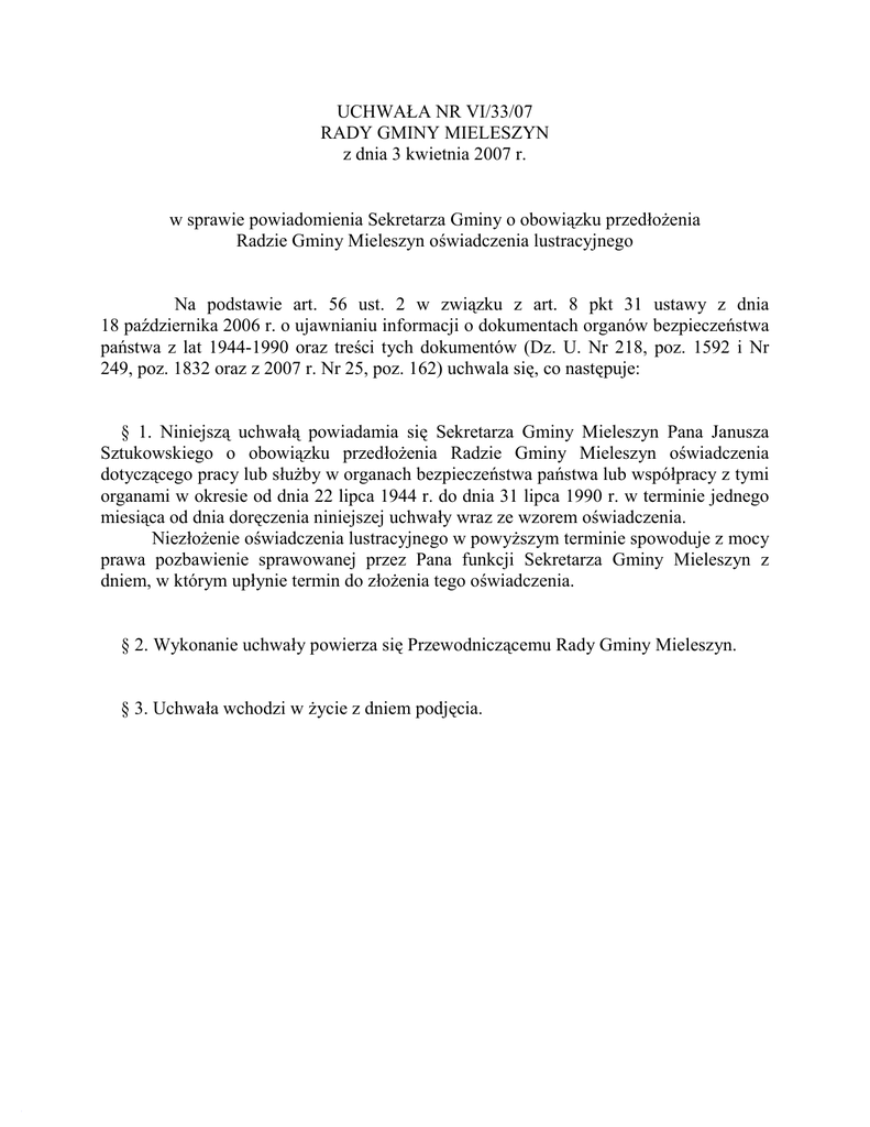 UCHWAŁA NR VI/33/07 RADY GMINY MIELESZYN z dnia 3 kwietnia 2007 r. w sprawie powiadomienia Sekretarza Gminy o obowiązku przedłożenia Radzie Gminy Mieleszyn oświadczenia lustracyjnego Na podstawie art. 56 ust. 2 w związku z art. 8 pkt 31 ustawy z dnia 18 października 2006 r. o ujawnianiu informacji o dokumentach organów bezpieczeństwa państwa z lat 1944-1990 oraz treści tych dokumentów (Dz. U. Nr 218, poz. 1592 i Nr 249, poz. 1832 oraz z 2007 r. Nr 25, poz. 162) uchwala się, co następuje: § 1. Niniejszą uchwałą powiadamia się Sekretarza Gminy Mieleszyn Pana Janusza Sztukowskiego o obowiązku przedłożenia Radzie Gminy Mieleszyn oświadczenia dotyczącego pracy lub służby w organach bezpieczeństwa państwa lub współpracy z tymi organami w okresie od dnia 22 lipca 1944 r. do dnia 31 lipca 1990 r. w terminie jednego miesiąca od dnia doręczenia niniejszej uchwały wraz ze wzorem oświadczenia. Niezłożenie oświadczenia lustracyjnego w powyższym terminie spowoduje z mocy prawa pozbawienie sprawowanej przez Pana funkcji Sekretarza Gminy Mieleszyn z dniem, w którym upłynie termin do złożenia tego oświadczenia. § 2. Wykonanie uchwały powierza się Przewodniczącemu Rady Gminy Mieleszyn. § 3. Uchwała wchodzi w życie z dniem podjęcia. UZASADNIENIE do uchwały Nr VI/33/07 Rady Gminy Mieleszyn z dnia 3 kwietnia 2007 r. W świetle zapisu art. 56 ust. 1 ustawy z dnia 18 października 2006 r. o ujawnianiu informacji o dokumentach organów bezpieczeństwa państwa z lat 1944-1990 oraz treści tych dokumentów (Dz. U. Nr 218, poz. 1592 z późn. zm.) osoby urodzone przed dniem 1 sierpnia 1972 r., które w dniu wejścia w życie tejże ustawy pełnią funkcje publiczne wymienione w art. 4, mają obowiązek złożenia oświadczeń lustracyjnych, wymienionych w art. 7 ust. 1 cytowanej wyżej ustawy w terminie jednego miesiąca od dnia doręczenia powiadomienia przez właściwy organ. Z treści art. 8 pkt 31 powołanej na wstępie ustawy wynika, że właściwym organem powiadamiającym Sekretarza Gminy o obowiązku złożenia oświadczenia lustracyjnego jest Rada Gminy Mieleszyn. W powyższym stanie rzeczy podjęcie niniejszej uchwały jest uzasadnione.