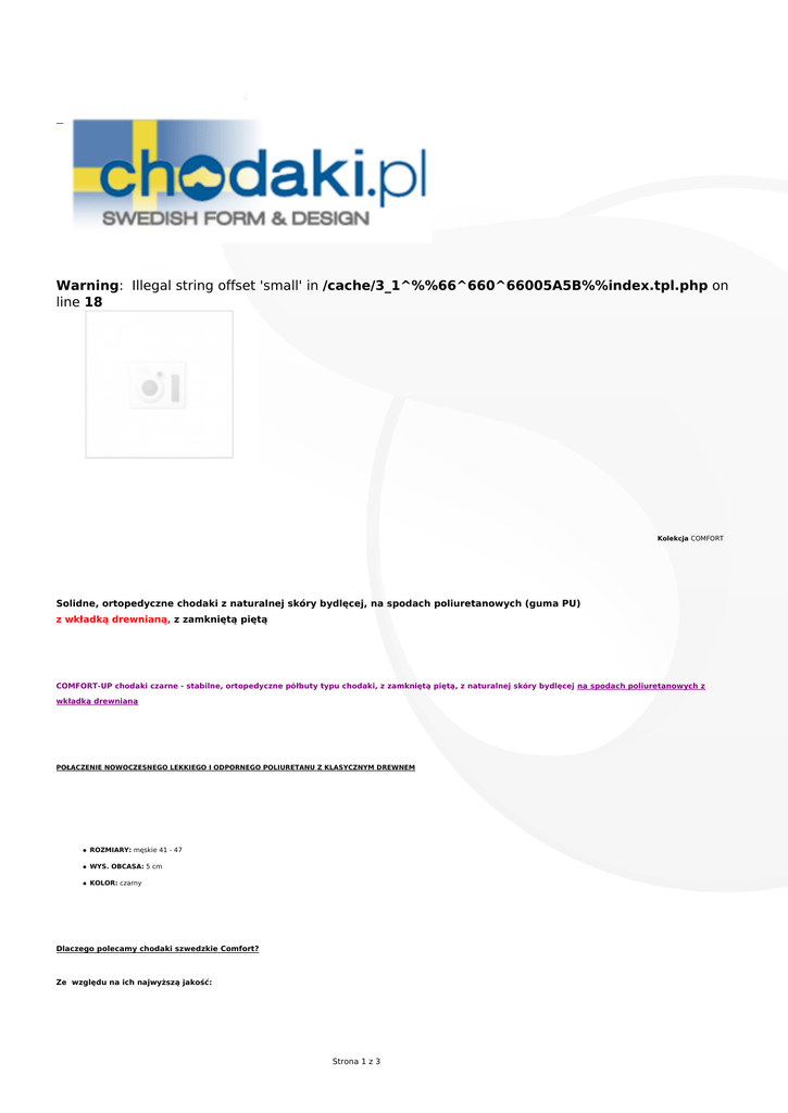 Warning: Illegal string offset 'small' in /cache/3_1^%%66^660^66005A5B%%index.tpl.php on line 18 Kolekcja COMFORT Solidne, ortopedyczne chodaki z naturalnej skóry bydlęcej, na spodach poliuretanowych (guma PU) z wkładką drewnianą, z zamkniętą piętą COMFORT-UP chodaki czarne - stabilne, ortopedyczne półbuty typu chodaki, z zamkniętą piętą, z naturalnej skóry bydlęcej na spodach poliuretanowych z wkładką drewnianą POŁĄCZENIE NOWOCZESNEGO LEKKIEGO I ODPORNEGO POLIURETANU Z KLASYCZNYM DREWNEM ROZMIARY: męskie 41 - 47 WYS. OBCASA: 5 cm KOLOR: czarny Dlaczego polecamy chodaki szwedzkie Comfort? Ze względu na ich najwyższą jakość: Strona 1 z 3 Naturalna, gruba skóra bydlęca Podeszwa gumowa (z poliuretanu) zapewnia trwałość i amortyzację Drewniana, ortopedyczna wkładka (ponad 1cm grubości) zapewnia wygodę i ma właściwości zdrowotne Chodaki są antypoślizgowe, odporne na oleje, kwasy i ścieranie Mocne, solidne zszywki Utwardzony przód, aby palce nie wypychały noska Podpiętek także ze skóry Chodaki wyprodukowano zgodnie z normą PN-EN 347 Szwedzkie wzornictwo Polecane również dla kierowców zawodowych, jako wygodne i bezpieczne obuwie Chodaki Comfort to doskonałe połączenie półbutów (podeszwa gumowa)z tradycyjnym drewniakiem (środek z drewna). Chodaki polecamy do pracy, zarówno stojącej, jak i siedzącej, a także na co dzień - świetnie sprawdzą się przy domu, w garażu, czy na działce. Model Comfort-UP z zamkniętą piętą to ulubione obuwie kierowców zawodowych! CHOLEWKA NATURALNA SKÓRA BYDLĘCA zabezpieczona warstwą tworzywa w kolorze czarnym ZMIĘKCZONE W PODBICIU SPECJALNĄ MIKROPIANKĄ dla maksymalnego komfortu noszenia plastikowy zapiętek usztywniony podnosek termoplastyczny PODESZWA I WKŁADKA POLIURETANOWE SPODY zapewniają sprężystość i stabilność DREWNIANA WKŁADKA została wyprofilowana ortopedycznie, co zapewnia doskonałe właściwości zdrowotne – utrzymuje suchą i czystą stopę Drewniana wkładka utrzymuje łuki poprzeczne i podłużne stopy, stanowiąc doskonałą podporę dla główek kości śródstopia, zachowując w ten sposób naturalną architekturę stopy PODESZWA ANTYPOŚLIZGOWA LEKKIE, CICHE I ANTYWSTRZĄSOWE z systemem absorpcji energii w części piętowej SHOCK ABSORBER OLEJOODPORNE, KWASOODPORNE, ODPORNE NA ŚCIERANIE Najnowsze opinie Klientów o chodakach Comfort z zamkniętą piętą: "1000% pozytyw!!! kontakt i błyskawiczna wysylka!! Towar rewelacyjny zgodny z opisem i bardzo wygodne buty Z czystym sumieniem polecam transakcje z tym allegrowiczem!!!!!" (09.05.2014) Strona 2 z 3 "bardzo profesjonalna i sprawnie dzialajaca firma.Naprawde polecam.Towar dobrej jakosci zgodny z opisem." (17.03.2014) "znakomity kontrahent,doskonały towar,świetny kontakt,błyskawiczna wysyłka,bardzo duży pozytyw,polecam wszystkim i gorąco pozdrawiam" (14.03.2014) "To nie mój pierwszy zakup w tym sklepie i jak zawsze wszystko przebiegło super.Błyskawiczna wysyłka,bardzo dobra informacja. Towar pierwszej klasy. Rzetelna firma. Polecam." (06.03.2014) "wszystko jak najbardziej w porzadku. polecam serdecznie. szybko, profesjonal pełen. zadowolony jestem... :-)))))))))" (10.12.2013) "DREWNIAKI zgodne z opisem !!!!!! ...:::P:::... ...:::O:::... ...:::L:::... ...:::E:::... ...:::C:::... ...:::A:::... ...:::M:::... Szybko,sprawnie i w bardzo dobrym kontakcie !!! Dziękuję i pozdrawiam :))) " "Bardzo udany zakup. Drewniaki rewelacyjne,bardzo dobrze wykonane. Kontakt ze sprzedajacym na szóstke..na pewno bede wracac do tego sprzedawcy Obuwie wykonane zgodnie z normą PN-EN 347 jako obuwie ortopedyczne i profilaktyczne do wielogodzinnego chodzenia. Strona 3 z 3