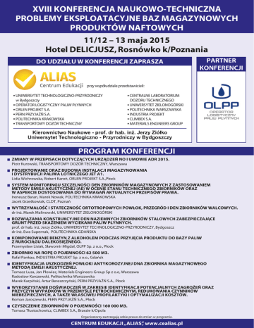 XVIII KONFERENCJA NAUKOWO-TECHNICZNA PROBLEMY EKSPLOATACYJNE BAZ MAGAZYNOWYCH PRODUKTÓW NAFTOWYCH 11/12 – 13 maja 2015 Hotel DELICJUSZ, Rosnówko k/Poznania PARTNER KONFERENCJI przy współudziale przedstawicieli: ▪ UNIWERSYTET TECHNOLOGICZNO-PRZYRODNICZY w Bydgoszczy ▪ OPERATOR LOGISTYCZNY PALIW PŁYNNYCH ▪ ORLEN PROJEKT S.A. ▪ PERN PRZYJAŹŃ S.A. ▪ POLITECHNIKA KRAKOWSKA ▪ TRANSPORTOWY DOZÓR TECHNICZNY ▪ CENTRALNE LABORATORIUM DOZORU TECHNICZNEGO ▪ UNIWERSYTET ZIELONOGÓRSKI ▪ POLITECHNIKA WARSZAWSKA ▪ INDUSTRIA PROJEKT ▪ CLIMBEX S.A. ▪ MATERIALS ENGINEERS GROUP Kierownictwo Naukowe - prof. dr hab. inż. Jerzy Ziółko Uniwersytet Technologiczno - Przyrodniczy w Bydgoszczy PROGRAM KONFERENCJI ZMIANY W PRZEPISACH DOTYCZĄCYCH URZĄDZEŃ NO I UMOWIE ADR 2015. Piotr Kurowski, TRANSPORTOWY DOZÓR TECHNICZNY, Warszawa PROJEKTOWANIE ORAZ BUDOWA INSTALACJI MAGAZYNOWANIA I DYSTRYBUCJI PALIWA LOTNICZEGO JET A1. Lidia Wichrowska, Robert Karoń, ORLEN PROJEKT S.A.,Płock SYSTEM MONITORINGU SZCZELNOŚCI DEN ZBIORNIKÓW MAGAZYNOWYCH Z ZASTOSOWANIEM METODY EMISJI AKUSTYCZNEJ (AE) W OCENIE STANU TECHNICZNEGO ZBIORNIKÓW ORAZ W ASPEKCIE DOSTOSOWANIA DO WYMAGAŃ AKTUALNYCH PRZEPISÓW PRAWA. Ireneusz Baran, Marek Nowak, POLITECHNIKA KRAKOWSKA Jacek Grześkowiak, CLDT, Poznań WYTRZYMAŁOŚĆ I STATECZNOŚĆ ORTOTROPOWYCH POWŁOK, PRZEGRÓD I DEN ZBIORNIKÓW WALCOWYCH. dr inż. Marek Malinowski, UNIWERSYTET ZIELONOGÓRSKI ROZWIĄZANIA KONSTRUKCYJNE DEN NAZIEMNYCH ZBIORNIKÓW STALOWYCH ZABEZPIECZAJĄCE GRUNT PRZED SKAŻENIEM WYCIEKAMI PALIW PŁYNNYCH. prof. dr hab. inż. Jerzy Ziółko, UNIWERSYTET TECHNOLOGICZNO-PRZYRODNICZY, Bydgoszcz dr inż. Ewa Supernak, POLITECHNIKA GDAŃSKA KOMPONOWANIE BENZYN Z ALKOHOLEM PODCZAS PRZYJĘCIA PRODUKTU DO BAZY PALIW Z RUROCIĄGU DALEKOSIĘŻNEGO. Przemysław Lisiak, Sławomir Migdał, OLPP Sp. z o.o., Płock ZBIORNIKI NA ROPĘ O POJEMNOŚCI 62 500 M3. Rafał Pankau, INDUSTRIA PROJEKT Sp. z o.o., Gdańsk IDENTYFIKACJA USZKODZEŃ POWŁOKI ANTYKOROZYJNEJ DNA ZBIORNIKA MAGAZYNOWEGO METODĄ EMISJI AKUSTYCZNEJ. Tomasz Lusa, Jan Płowiec, Materials Engineers Group Sp z o.o, Warszawa Radosław Karczewski, Politechnika Warszawska Marek Karpiński, Artur Bereszczyński, PERN PRZYJAŹŃ S.A., Płock WYKORZYSTANIE DOŚWIADCZEŃ W ZAKRESIE IDENTYFIKACJI POTENCJALNYCH ZAGROŻEŃ ORAZ PRZYCZYN WYPADKÓW W PRZEMYŚLE PETROCHEMICZNYM, REDUKOWANIA CZYNNIKÓW NIEBEZPIECZNYCH, A TAKŻE WŁAŚCIWEJ PROFILAKTYKI I OPTYMALIZACJI KOSZTÓW. Roman Jaroszewski, PERN PRZYJAŹŃ S.A., Płock CZYSZCZENIE ZBIORNIKÓW O POJEMNOŚCI 160 000 M3. Tomasz Tłustochowicz, CLIMBEX S.A., Brzezie k/Opola Organizatorzy zastrzegają sobie prawo do zmian w programie. CENTRUM EDUKACJI „ALIAS”, www.cealias.pl KARTA ZGŁOSZENIA UCZESTNICTWA Firma Adres Tel. Fax e-mail Uczestnik(cy) Należność za uczestnictwo w konferencji: ilość osób promocja firmy x 1400 zł + 23% VAT = zł + 23% VAT = prosimy przekazać na konto Centrum Edukacji "ALIAS": 89 1910 1048 2667 8360 2998 0001 Upoważniamy do wystawienia faktury VAT bez naszego podpisu. Nasz nr NIP Wyrażamy zgodę na przetwarzanie danych osobowych zawartych w karcie zgłoszenia w celach związanych z konferencją. Główny księgowy pieczęć firmy Prezes/Dyrektor INFORMACJE I WARUNKI UCZESTNICTWA Podstawę zgłoszenia stanowi wyłącznie zgłoszenie pisemne ( e-mail, fax, list ) wraz z potwierdzeniem dokonania przelewu na nasze konto. Potwierdzenia przyjęcia zgłoszenia dokonujemy na wyraźne życzenie zgłaszającego. Rezygnacja z uczestnictwa przyjmowana jest wyłącznie na piśmie, nie później jednak niż na 7 dni przed terminem imprezy. Niedopełnienie powyższej formalności spowoduje obciążenie osoby zgłoszonej pełnymi kosztami uczestnictwa. Miejsce konferencji: Hotel-Restauracja DELICJUSZ, Rosnówko, ul. Poznańska 1. Zgłoszenia prosimy kierować na adres: e-mail: [email protected], fax: 61 865 09 78, tel. 604 184 122, listownie: CENTRUM EDUKACJI „ALIAS”, 60-764 Poznań, ul. H. Siemiradzkiego 4/4 Koszt uczestnictwa 1400 zł + 23% VAT obejmuje: zakwaterowanie (pokój dwuosobowy, dwa noclegi), materiały konferencyjne i promocyjne, wyżywienie, bankiet. Zakwaterowanie w pokoju jednoosobowym wiąże się z dopłatą w wysokości 200 zł +23 % VAT. ROZKŁAD ZAJĘĆ PONIEDZIAŁEK 11 maja ŚRODA 13 maja 17.00 - 21.00 rejestracja uczestników, kolacja 7.00 - 9.00 śniadanie recepcja czynna całą dobę 9.00 - 12.00 obrady WTOREK 12 maja 12.00 - 13.00 obiad 8.00 - 9.00 rejestracja uczestników, śniadanie 13.30 wyjazd uczestników 9.30 - 12.30 obrady 12.30 - 13.30 przerwa obiadowa 13.30 - 15.00 obrady 15.30 wyjazd turystyczny - zwiedzanie zamku oraz arboretum w Kórniku 20.00 bankiet FORMY PROMOCJI FIRMY Organizatorzy przewidują możliwość odpłatnej prezentacji przedsiębiorstw. Zamieszczenie oferty firmy w materiałach konferencyjnych: Udostępnienie powierzchni wystawienniczej bez zabudowy: Referat firmowy ( 15 minut ) 800 zł + 23%VAT 1200 zł + 23%VAT 1400 zł + 23%VAT Zgłoszenia prosimy dokonać w karcie zgłoszenia uczestnictwa w konferencji.
