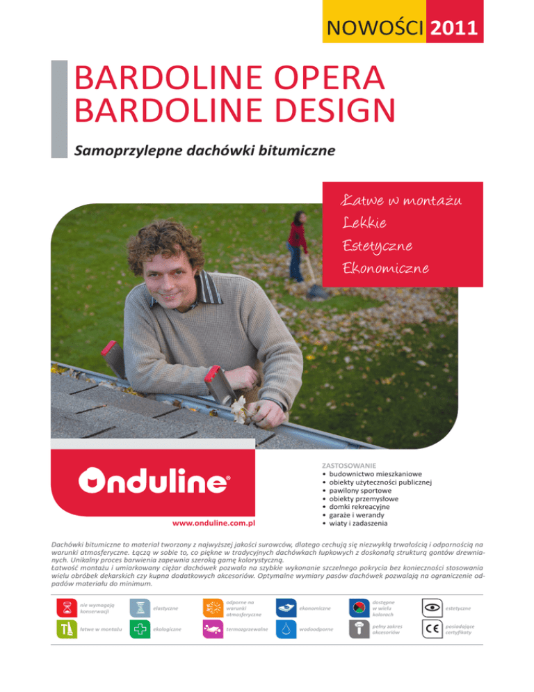 NOWOŚCI 2011 BARDOLINE OPERA BARDOLINE DESIGN Samoprzylepne dachówki bitumiczne . /Latwe w montazu Lekkie Estetyczne Ekonomiczne www.onduline.com.pl ZASTOSOWANIE • budownictwo mieszkaniowe • obiekty użyteczności publicznej • pawilony sportowe • obiekty przemysłowe • domki rekreacyjne • garaże i werandy • wiaty i zadaszenia Dachówki bitumiczne to materiał tworzony z najwyższej jakości surowców, dlatego cechują się niezwykłą trwałością i odpornością na warunki atmosferyczne. Łączą w sobie to, co piękne w tradycyjnych dachówkach łupkowych z doskonałą strukturą gontów drewnianych. Unikalny proces barwienia zapewnia szeroką gamę kolorystyczną. Łatwość montażu i umiarkowany ciężar dachówek pozwala na szybkie wykonanie szczelnego pokrycia bez konieczności stosowania wielu obróbek dekarskich czy kupna dodatkowych akcesoriów. Optymalne wymiary pasów dachówek pozwalają na ograniczenie odpadów materiału do minimum. nie wymagają konserwacji elastyczne odporne na warunki atmosferyczne ekonomiczne dostępne w wielu kolorach estetyczne łatwe w montażu ekologiczne termozgrzewalne wodoodporne pełny zakres akcesoriów posiadające certyfikaty BARDOLINE OPERA Długość: 998 mm; szerokość: 337 mm; wysokość części widocznej: 143 mm Opakowanie Paleta Waga jedn. neAo m2 11,0 Ilość pasów w opak. Efekt. pow. krycia w m2 Liczba opakowań Pow. użytk. w m2 Ciężar bruAo palety w kg 18 2,57 60 154,2 1 725 Mocowanie mechaniczne gontów bitumicznych Opera • Po ułożeniu w linii okapu warstwy papy podkładowej szerokości 250 mm rozpoczynamy układanie pierwszego rzędu dachówki bitumicznej Opera na pionowej linii AD. • Drugi rząd układa się po linii Z w odległości 166 mm w stosunku do AD. • Trzeci rząd układa się wzdłuż linii K w odległości 333 mm w stosunku do AD. • Czwarty rząd układa się wzdłuż linii Z w odległości 166 mm od AD. • Piąty rząd układa się wzdłuż linii pionowej AD. • Taki schemat należy powtarzać aż do całkowitego pokrycia połaci dachowych. Do zamocowania stosujemy gwoździe papowe ocynkowane z szerokim łbem o długości dopasowanej do grubości i typu podłoża. Stosujemy 4 gwoździe na każdy pas, przy czym należy je mocować wyłącznie jak na rysunku poniżej. Umieszczając gwoździe papowe we wskazanym miejscu, mocujemy dodatkowo górną krawędzi gontów znajdujących się na spodniej warstwie. W przypadku kąta nachylenia dachu powyżej 60o zwiększamy liczbę stosowanych gwoździ do 6 sztuk na każdy pas. ciemny szary terakota brąz BARDOLINE DESIGN Długość: 1000 mm; szerokość: 337 mm; wysokość części widocznej: 143 mm Opakowanie Paleta Waga jedn. neAo m2 8,3 2 Ilość pasów w opak. Efekt. pow. krycia w m Liczba opakowań Pow. użytk. w m2 Ciężar bruAo palety w kg 21 3,00 60 180,0 1 514 Mocowanie mechaniczne gontów bitumicznych Design Do zamocowania stosujemy gwoździe papowe ocynkowane z szerokim łbem o długości dopasowanej do grubości i typu podłoża. Stosujemy 4 gwoździe na każdy pas, przy czym należy je mocować wyłącznie jak na rysunku poniżej. W przypadku kąta nachylenia dachu powyżej 60o używamy 6 gwoździ papowych na każdy pas, podwajając drugi i czwarty gwóźdź licząc od lewego brzegu zgodnie z rysunkiem poniżej. czerwony brązowy Onduline Materiały Budowlane Sp. z o.o. 02 - 923 Warszawa, ul. Kołobrzeska 8; tel.: 22 651 85 08, 22 642 83 88; fax: 22 651 85 06, 22 651 85 07 e-mail: [email protected]; www.onduline.com.pl Schemat ułożenia dachówek