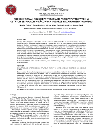 BIULETYN Wydziału Farmaceutycznego Warszawskiego Uniwersytetu Medycznego Biul. Wydz. Farm. WUM, 2016, 4, 25-33 http://biuletynfarmacji.wum.edu.pl/ PODOBIEŃSTWA I RÓŻNICE W TERAPIACH PRZECIWPŁYTKOWYCH W OSTRYCH ZESPOŁACH WIEŃCOWYCH I UDARZE NIEDOKRWIENNYM MÓZGU Natalia Cichoń*, Dominika Lach, Michał Bijak, Paulina Rzeźnicka, Joanna Saluk Katedra Biochemii Ogólnej, Uniwersytet Łódzki, ul. Pomorska 141/143, 90-236 Łódź * autorka korespondująca, tel: +48 42 635 4482, e-mail: [email protected] Otrzymany 12.04.2016, zaakceptowany 10.05.2016, zamieszczony 7.06.2016 STRESZCZENIE Choroby układu krążenia, w tym ostre zespoły wieńcowe (OZW) oraz udar niedokrwienny mózgu (UNM), stanowią najczęstszą przyczynę zgonów na świecie. Zarówno podczas OZW, jak i UNM dochodzi do niedokrwienia będącego skutkiem niedrożności naczynia krwionośnego, zatem istotą leczenia tych schorzeń jest działanie reperfuzyjne obejmujące terapie: antyagregacyjną, antykoagulacyjną oraz trombolityczną. Leczenie antyagregacyjne (przeciwpłytkowe) stanowi podstawę działania terapeutycznego u pacjentów z OZW i UNM, a jego skuteczność zależy od właściwego doboru odpowiedniego rodzaju farmakoterapii i szybkości rozpoczęcia leczenia. Najpowszechniej stosowanym lekiem jest kwas acetylosalicylowy, jednak poszukiwanie nowych form leczenia pozwoliło wprowadzić kilka alternatywnych lub wspomagających farmaceutyków, takich jak tienopirydyny, prasugrel, tikagrelor, dipirydamol oraz inhibitory glikoproteiny IIb/IIIa. Przedmiotem niniejszej pracy jest charakterystyka leków oraz przegląd nowoczesnych form terapii wykorzystywanych w leczeniu przeciwpłytkowym u pacjentów z OZW i/lub UNM. SŁOWA KLUCZOWE: ostre zespoły wieńcowe, udar niedokrwienny mózgu, leczenie antyagregacyjne, leki przeciwpłytkowe ABSTRACT SIMILARITIES AND DIFFERENCES IN ANTIPLATELET THERAPY IN ACUTE CORONARY SYNDROMES AND ISCHEMIC STROKE Cardiovascular disease, including acute coronary syndromes (ACS) and ischemic stroke (IS), is the most common cause of death in the world. In both ACS and IS, ischemia results from vascular occlusion. Therefore, the mainstay of treatment for these disorders is reperfusion therapy that includes antiplatelet, anticoagulant and thrombolytic interventions. Antithrombotic action (antiplatelet therapy) is the main therapeutic modality in patients with ACS and IS. Its effectiveness depends on the selection of an appropriate pharmacotherapy and on the timing of treatment initiation. The most commonly used drug is acetylsalicylic acid, but the search for new forms of treatment led to the introduction of alternative or supporting pharmaceuticals, including: thienopyridine, prasugrel, ticagrelor, dipyridamole, and glycoprotein IIb/IIIa inhibitors. The aim of this paper is to characterize available drugs and to review modern forms of antiplatelet therapy used in patients with ACS and/or IS. KEYWORDS: acute coronary syndromes, ischemic stroke, antithrombotic therapy, antiplatelet therapy 1. Wstęp czynności mózgu, które spowodowane są wyłącznie przyczynami naczyniowymi, związanymi z przepływem krwi w naczyniach mózgowych, które trwają powyżej 24 h. 80% wszystkich udarów stanowią udary niedokrwienne (UNM), inaczej zawały mózgu, wśród których największy odsetek stanowią udary kardiogenne będące powikłaniem migotania przedsionków [3]. Wspólną cechą OZW oraz UNM jest podłoże niedokrwienne, tym samym i postępowanie terapeutyczne obejmuje leki posiadające podobne mechanizmy działania reperfuzyjnego, mającego na celu jak najszybsze przywrócenie prawidłowego przepływu krwi w naczyniach. W przypadku chorych ze STEMI w większości przypadków niezbędne jest leczenie interwencyjne w postaci przezskórnej wewnątrznaczyniowej angioplastyki wieńcowej lub też zabiegu wszczepienia pomostów do tętnic wieńcowych. Natomiast w przypadku pacjentów z NSTE-ACE leczenie inter- Według najnowszych danych Światowej Organizacji Zdrowia (WHO) choroby układu krążenia, w tym ostry zespół wieńcowy oraz udar niedokrwienny mózgu, są najczęstszą przyczyną zgonów zarówno w Polsce, jak i na świecie, w szczególności w krajach średnio- i wysokorozwiniętych. Co więcej, w 2012 roku odnotowano wzrost o 20% liczby zgonów z tej przyczyny w stosunku do 2000 roku [1]. Ostry zespół wieńcowy (OZW), stanowi grupę objawów klinicznych charakteryzujących się niedokrwieniem mięśnia sercowego i obejmujących zawał serca z uniesieniem odcinka ST (STEMI) oraz ostry zespół wieńcowy bez uniesienia ST (NSTE-ACS), wśród którego rozróżnia się zawał serca bez uniesienia odcinka ST (NSTEMI), a także niestabilną dławicę piersiową (UA) [2]. Najnowsza definicja charakteryzuje udar mózgu jako nagłe wystąpienie ogniskowych lub globalnych zaburzeń 25 N. Cichoń et al./Biul. Wydz. Farm. WUM, 2016, 4, 25-33 wencyjne jest wskazane jedynie u pacjentów w grupie wysokiego ryzyka [2]. Jednakże pomimo przeprowadzenia terapii interwencyjnej, farmakologiczne leczenie zachowawcze jest niezbędne. W przypadku ostrych chorób naczyniowych w zakresie leczenia reperfuzyjnego wyróżnia się leczenie antyagregacyjne (przeciwpłytkowe), antykoagulacyjne (przeciwzakrzepowe) oraz trombolityczne. Leczenie antyagregacyjne jest standardowo włączane na początku terapii i prowadzone długoterminowo. Natomiast leczenie przeciwkrzepliwe i trombolityczne, niosące ze sobą ryzyko krwawień, ze względu na liczne przeciwwskazania nie jest rekomendowane dla wszystkich pacjentów. Kryteria prowadzenia terapii są szczegółowo określane w odniesieniu do każdej z wymienionych powyżej grup leków [2,4]. W niniejszej pracy przedstawiono aktualny stan wiedzy na temat leczenia antyagregacyjnego u pacjentów po ostrym zespole wieńcowym oraz udarze niedokrwiennym mózgu oraz podobieństwa i różnice w schemacie postępowania. oprócz czynników prozapalnych wydzielane są substancje wzmagają