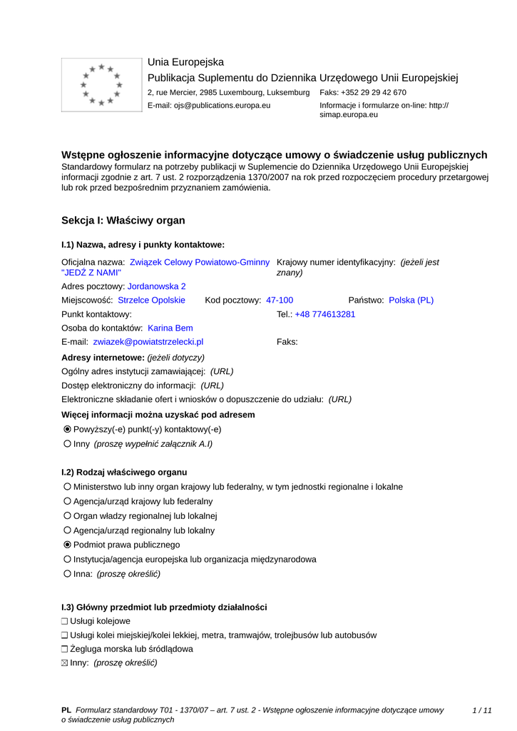 Unia Europejska Publikacja Suplementu do Dziennika Urzędowego Unii Europejskiej 2, rue Mercier, 2985 Luxembourg, Luksemburg Faks: +352 29 29 42 670 E-mail: [email protected] Informacje i formularze on-line: http:// simap.europa.eu Wstępne ogłoszenie informacyjne dotyczące umowy o świadczenie usług publicznych Standardowy formularz na potrzeby publikacji w Suplemencie do Dziennika Urzędowego Unii Europejskiej informacji zgodnie z art. 7 ust. 2 rozporządzenia 1370/2007 na rok przed rozpoczęciem procedury przetargowej lub rok przed bezpośrednim przyznaniem zamówienia. Sekcja I: Właściwy organ I.1) Nazwa, adresy i punkty kontaktowe: Oficjalna nazwa: Związek Celowy Powiatowo-Gminny Krajowy numer identyfikacyjny: (jeżeli jest "JEDŹ Z NAMI" znany) _____ Adres pocztowy: Jordanowska 2 Miejscowość: Strzelce Opolskie Kod pocztowy: 47-100 Punkt kontaktowy: _____ Państwo: Polska (PL) Tel.: +48 774613281 Osoba do kontaktów: Karina Bem E-mail: [email protected] Faks: _____ Adresy internetowe: (jeżeli dotyczy) Ogólny adres instytucji zamawiającej: (URL) _____ Dostęp elektroniczny do informacji: (URL) _____ Elektroniczne składanie ofert i wniosków o dopuszczenie do udziału: (URL) _____ Więcej informacji można uzyskać pod adresem Powyższy(-e) punkt(-y) kontaktowy(-e) Inny (proszę wypełnić załącznik A.I) I.2) Rodzaj właściwego organu Ministerstwo lub inny organ krajowy lub federalny, w tym jednostki regionalne i lokalne Agencja/urząd krajowy lub federalny Organ władzy regionalnej lub lokalnej Agencja/urząd regionalny lub lokalny Podmiot prawa publicznego Instytucja/agencja europejska lub organizacja międzynarodowa Inna: (proszę określić) I.3) Główny przedmiot lub przedmioty działalności Usługi kolejowe Usługi kolei miejskiej/kolei lekkiej, metra, tramwajów, trolejbusów lub autobusów Żegluga morska lub śródlądowa Inny: (proszę określić) PL Formularz standardowy T01 - 1370/07 – art. 7 ust. 2 - Wstępne ogłoszenie informacyjne dotyczące umowy o świadczenie usług publicznych 1 / 11 publiczny transport zbiorowy I.4) Udzielenie zamówienia w imieniu innych właściwych organów Właściwy organ dokonuje zakupu w imieniu innych właściwych organów: tak nie (jeżeli tak, więcej informacji o tych właściwych organach można podać w załączniku A.II) PL Formularz standardowy T01 - 1370/07 – art. 7 ust. 2 - Wstępne ogłoszenie informacyjne dotyczące umowy o świadczenie usług publicznych 2 / 11 Sekcja II: Przedmiot zamówienia II.1) Opis: II.1.1) Nazwa nadana zamówieniu: Świadczenie usług publicznego transportu zbiorowego sieci komunikacyjnej na obszarze Związku Celowego II.1.2) Rodzaj zamówienia, dziedzina(-y), której(-ych) dotyczą usługi transportu publicznego: Kategoria usług: nr: T-05 (Zob. kategorie usług w załączniku B) Dziedziny, których dotyczą usługi transportu publicznego: przewozy pasażerskie Kod NUTS: PL522 II.1.3) Krótki opis zamówienia: Świadczenie usług publicznego transportu zbiorowego w sieci komunikacyjnej Związku Celowego PowiatowoGminnego "JEDŹ Z NAMI" oraz w zakresie porozumień zawieranych przez członków Związku. II.1.4) Wspólny Słownik Zamówień (CPV) Główny przedmiot Słownik główny 60112000 Słownik uzupełniający (jeżeli dotyczy) II.1.5) Informacje na temat podwykonawstwa Przewidywane jest zlecenie podwykonawstwa: tak nie (jeżeli tak) Wartość lub część zamówienia, które prawdopodobnie będzie zlecone stronom trzecim: minimalny procent: 0 (%), maksymalny procent: 20 (%) wartości zamówienia albo Nieznana Krótki opis wartości/części zamówienia, które będzie zlecone podwykonawcom: Świadczenie usług publicznego transportu zbiorowego w sieci komunikacyjnej Związku Celowego PowiatowoGminnego "JEDŹ Z NAMI" oraz w zakresie porozumień zawieranych przez członków Związku. II.2) Ilość i/lub wartość usług Opis: _____ km usług publicznych w zakresie transportu pasażerskiego: _____ Szacunkowy koszt bez VAT: (proszę podać wyłącznie dane liczbowe) _____ albo Zakres: między _____ i _____ Waluta: Waluta: II.3) Planowana data rozpoczęcia i czas trwania zamówienia lub termin realizacji Rozpoczęcie: 01/01/2018 (dd/mm/rrrr) Okres w miesiącach: 120 albo w dniach: _____ (od udzielenia zamówienia) PL Formularz standardowy T01 - 1370/07 – art. 7 ust. 2 - Wstępne ogłoszenie informacyjne dotyczące umowy o świadczenie usług publicznych 3 / 11 Sekcja III: Informacje o charakterze prawnym, ekonomicznym, finansowym i technicznym III.1) Warunki dotyczące zamówienia: III.1.1) Parametry kosztów w celu obliczenia rekompensaty: _____ III.1.2) Informacje o wyłącznych prawach: Przyznano wyłączne prawa tak nie (jeżeli tak) Wyszczególnienie przyznanych wyłącznych praw: _____ III.1.3) Podział przychodów ze sprzedaży biletów: Odsetek przydzielony podmiotowi świadczącemu usługi publiczne: _____ (%) (uznaje się, że pozostała część jest przyznawana właściwemu organowi) III.1.4) Standardy socjalne: (przejęcie personelu zgodnie z dyrektywą 2001/23/WE) Wykaz wymaganych standardów (w tym lista pracowników, których to dotyczy, szczegółowe informacje na temat umownych praw i zobowiązań pracowników oraz warunków, na jakich pracowników uznaje się za związanych ze świadczonymi usługami): _____ III.1.5) Zobowiązania do świadczenia usług publicznych: Wyszczególnienie: _____ III.1.6) Inne szczególne warunki: Wykonanie zamówienia podlega szczególnym warunkom (jeżeli tak) Opis szczególnych warunków: _____ tak nie III.2) Warunki udziału: III.2.1) Zdolność ekonomiczna i finansowa: Informacje i formalności konieczne do dokonania oceny Minimalny poziom ewentualnie wymaganych spełniania wymogów: standardów: _____ _____ III.2.2) Wymagania techniczne: Informacje i formalności konieczne do dokonania oceny Minimalny poziom ewentualnie wymaganych spełniania wymogów: standardów: _____ _____ III.3) Cele w zakresie jakości dla umów o usługi: 