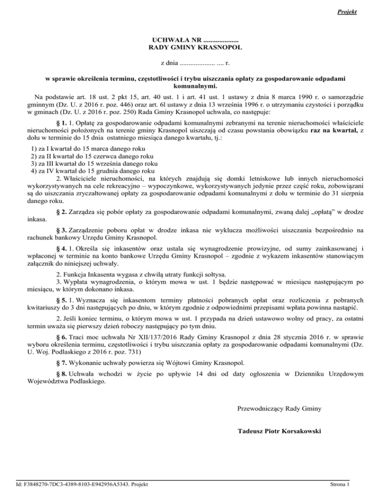 Projekt UCHWAŁA NR .................... RADY GMINY KRASNOPOL z dnia .................... .... r. w sprawie określenia terminu, częstotliwości i trybu uiszczania opłaty za gospodarowanie odpadami komunalnymi. Na podstawie art. 18 ust. 2 pkt 15, art. 40 ust. 1 i art. 41 ust. 1 ustawy z dnia 8 marca 1990 r. o samorządzie gminnym (Dz. U. z 2016 r. poz. 446) oraz art. 6l ustawy z dnia 13 września 1996 r. o utrzymaniu czystości i porządku w gminach (Dz. U. z 2016 r. poz. 250) Rada Gminy Krasnopol uchwala, co następuje: § 1. 1. Opłatę za gospodarowanie odpadami komunalnymi zebranymi na terenie nieruchomości właściciele nieruchomości położonych na terenie gminy Krasnopol uiszczają od czasu powstania obowiązku raz na kwartał, z dołu w terminie do 15 dnia ostatniego miesiąca danego kwartału, tj.: 1) za I kwartał do 15 marca danego roku 2) za II kwartał do 15 czerwca danego roku 3) za III kwartał do 15 września danego roku 4) za IV kwartał do 15 grudnia danego roku 2. Właściciele nieruchomości, na których znajdują się domki letniskowe lub innych nieruchomości wykorzystywanych na cele rekreacyjno – wypoczynkowe, wykorzystywanych jedynie przez część roku, zobowiązani są do uiszczania zryczałtowanej opłaty za gospodarowanie odpadami komunalnymi z dołu w terminie do 31 sierpnia danego roku. § 2. Zarządza się pobór opłaty za gospodarowanie odpadami komunalnymi, zwaną dalej „opłatą” w drodze inkasa. § 3. Zarządzenie poboru opłat w drodze inkasa nie wyklucza możliwości uiszczania bezpośrednio na rachunek bankowy Urzędu Gminy Krasnopol. § 4. 1. Określa się inkasentów oraz ustala się wynagrodzenie prowizyjne, od sumy zainkasowanej i wpłaconej w terminie na konto bankowe Urzędu Gminy Krasnopol – zgodnie z wykazem inkasentów stanowiącym załącznik do niniejszej uchwały. 2. Funkcja Inkasenta wygasa z chwilą utraty funkcji sołtysa. 3. Wypłata wynagrodzenia, o którym mowa w ust. 1 będzie następować w miesiącu następującym po miesiącu, w którym dokonano inkasa. § 5. 1. Wyznacza się inkasentom terminy płatności pobranych opłat oraz rozliczenia z pobranych kwitariuszy do 3 dni następujących po dniu, w którym zgodnie z odpowiednimi przepisami wpłata powinna nastąpić. 2. Jeśli koniec terminu, o którym mowa w ust. 1 przypada na dzień ustawowo wolny od pracy, za ostatni termin uważa się pierwszy dzień roboczy następujący po tym dniu. § 6. Traci moc uchwała Nr XII/137/2016 Rady Gminy Krasnopol z dnia 28 stycznia 2016 r. w sprawie wyboru określenia terminu, częstotliwości i trybu uiszczania opłaty za gospodarowanie odpadami komunalnymi (Dz. U. Woj. Podlaskiego z 2016 r. poz. 731) § 7. Wykonanie uchwały powierza się Wójtowi Gminy Krasnopol. § 8. Uchwała wchodzi w życie po upływie 14 dni od daty ogłoszenia w Dzienniku Urzędowym Województwa Podlaskiego. Przewodniczący Rady Gminy Tadeusz Piotr Korsakowski Id: F3848270-7DC3-4389-8103-E942956A5343. Projekt Strona 1 Załącznik do uchwały Wykaz Inkasentów Gminy Krasnopol Lp. Nazwisko i imię sołtysa (inkasenta) Nazwa sołectwa Stawka procentowa 1. Malinowska Małgorzata Aleksandrowo 7 2. Zaborowska Elżbieta Boksze Nowe 7 3. Jurkun Bolesław Buda Ruska 7 4. Michniewicz Krzysztof Czarna Buchta 7 5. Cichanowicz Halina Czerwony Krzyż 12 6. Karłowicz Agnieszka Gremzdel 12 7. Sitko Zenon Gremzdy Polskie 7 8. Popławski Henryk Głuszyn 7 9. Alboszta Jan Jegliniec 7 10. Karłowicz Elwira Jeglówek 10 11. Iwanow Agafia Jeziorki 7 12. Sinkiewicz Jarosław Krucieniszki 10 13. Izbicka Zenobia Królówek 12 14. Czakis Marek Krasnopol I 5 15. Wiszniewski Mieczysław Krasnopol II 5 16. Kamińska Wioletta Krasne 7 17. Godlewski Dariusz Linówek 7 18. Żynda Grażyna Łopuchowo 7 19. Klimko Stanisław Michnowce 10 20. Gajdziński Romuald Murowany Most 10 21. Lachowicz Robert Mikołajewo 7 22. Świacki Edward Maćkowa Ruda 7 23. Ślużyński Antoni Orlinek 7 24. Bartosiewicz Tadeusz Piotrowa Dąbrowa 7 25. Ferens Ireneusz Pawłówka 7 26. Myszczyński Jacek Romanowce 7 27. Boćwiński Piotr Rudawka 10 28. Pietrzyk Karol Rosochaty Róg 7 29. Bizio Katarzyna Maria Remieńkiń 7 30. Krajewska Renata Ryżówka 7 31. Romański Wiesław Skustele 10 32. Dargiewicz Marek Smolany Dąb 10 33. Saładonis Krzysztof Stabieńszczyzna 7 34. Poulakowska Ewa Wysoka Góra 10 35. Wodecki Ryszard Żłobin 7 36. Ćwikliński Zdzisław Żubronajcie 10 37. Fidrych Andrzej Żubrówka 7 Id: F3848270-7DC3-4389-8103-E942956A5343. Projekt Strona 1 UZASADNIENIE do uchwały w sprawie określenia terminu, częstotliwości i trybu uiszczania opłaty za gospodarowanie odpadami komunalnymi Podjęcie nowej, wyżej wymienionej uchwały podyktowane jest wezwaniem przez Kolegium Regionalnej Izby Obrachunkowej w Białymstoku do usunięcia naruszenia prawa w Uchwale Nr XII/137/2016 Rady Gminy Krasnopol z dnia 28 stycznia 2016 r. w sprawie terminu, częstotliwości i trybu uiszczania opłaty za gospodarowanie odpadami komunalnymi polegającego na uczestniczeniu w głosowaniu nad Uchwałą dwóch Radnych, którzy jednocześnie pełnią funkcję sołtysów, wyznaczonych przedmiotową uchwałą za inkasentów opłaty za gospodarowanie odpadami komunalnymi, którym przysługuje z tego tytułu wynagrodzenie prowizyjne. Zgodnie z art. 25a ustawy z dnia 8 marca 1990 r. o samorządzie gminnym, radny nie może brać udziału w głosowaniu w radzie, jeżeli dotyczy ono jego interesu prawnego. Radny, którego interesu prawnego dotyczy głosowanie, podlega wyłączeniu od udziału w tym głosowaniu. W związku z powyższym zasadne jest podjęcie uchwały w sprawie określenia terminu, częstotliwości i trybu uiszczania opłaty za gospodarowanie odpadami komunalnymi. Id: F3848270-7DC3-4389-8103-E942956A5343. Projekt Strona 1