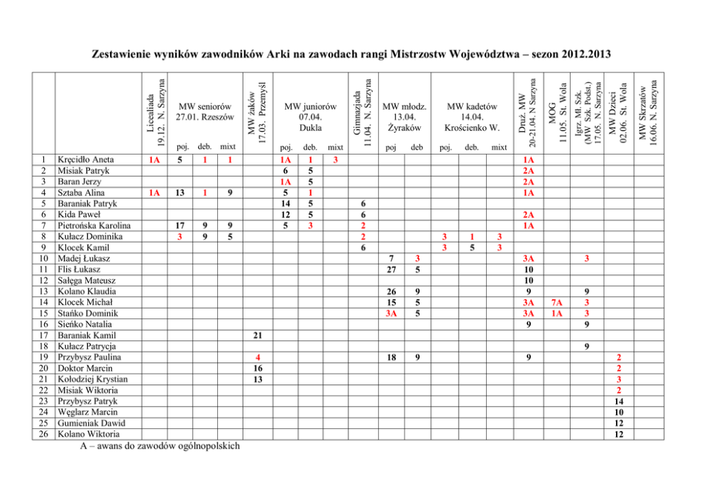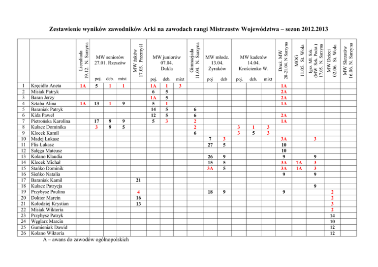 1 2 3 4 5 6 7 8 9 10 11 12 13 14 15 16 17 18 19 20 21 22 23 24 25 26 Kręcidło Aneta Misiak Patryk Baran Jerzy Sztaba Alina Baraniak Patryk Kida Paweł Pietrońska Karolina Kułacz Dominika Klocek Kamil Madej Łukasz Flis Łukasz Sałęga Mateusz Kolano Klaudia Klocek Michał Stańko Dominik Sieńko Natalia Baraniak Kamil Kułacz Patrycja Przybysz Paulina Doktor Marcin Kołodziej Krystian Misiak Wiktoria Przybysz Patryk Węglarz Marcin Gumieniak Dawid Kolano Wiktoria 1 9 17 3 9 9 9 5 A – awans do zawodów ogólnopolskich 1 5 5 1 5 5 3 3 deb poj. deb. mixt 1A 2A 2A 1A 6 6 2 2 6 2A 1A 3 3 7 27 3 5 26 15 3A 9 5 5 18 9 1 5 3 3 3A 10 10 9 3A 3A 9 3 7A 1A 9 3 3 9 21 9 4 16 13 9 2 2 3 2 14 10 12 12 MW Skrzatów 16.06. N. Sarzyna 13 1A 6 1A 5 14 12 5 poj MW Dzieci 02.06. St. Wola 1A mixt Igrz. Mł. Szk. (MW Szk. Podst.) 17.05. N. Sarzyna 1 deb. MOG 11.05. St. Wola 1 poj. MW kadetów 14.04. Krościenko W. Druż. MW 5 deb. mixt MW młodz. 13.04. Żyraków 20-21.04. N Sarzyna 1A poj. MW juniorów 07.04. Dukla Gimnazjada 11.04. N. Sarzyna MW seniorów 27.01. Rzeszów MW żaków 17.03. Przemyśl Licealiada 19.12. N. Sarzyna Zestawienie wyników zawodników Arki na zawodach rangi Mistrzostw Województwa – sezon 2012.2013