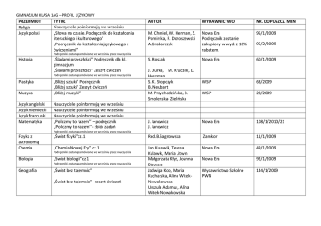 GIMNAZJUM KLASA 1AG – PROFIL JĘZYKOWY PRZEDMIOT Religia Język polski TYTUŁ Nauczyciele poinformują we wrześniu „Słowa na czasie. Podręcznik do kształcenia literackiego i kulturowego” „Podręcznik do kształcenia językowego z ćwiczeniami” AUTOR WYDAWNICTWO NR. DOPUSZCZ. MEN M. Chmiel, W. Herman, Z. Pomirska, P. Doroszewski A.Grabarczyk Nowa Era Podręcznik zostanie zakupiony w wyd. z 10% rabatem. 95/1/2009 S. Roszak Nowa Era 60/1/2009 WSiP 68/2009 WSiP 28/2009 J. Janowicz J. Janowicz Nowa Era 108/1/2010/21 „Świat fizyki”cz.1 Red.B.Sagnowska Zamkor 11/1/2009 „Chemia Nowej Ery” cz.1 Jan Kulawik, Teresa Kulawik, Maria Litwin Małgorzata Kłyś, Joanna Stawarz Jadwiga Kop, Maria Kucharska, Alina WitekNowakowska Urszula Adamus, Alina Witek-Nowakowska Nowa Era 49/1/2009 Nowa Era 92/1/2009 Wydawnictwo Szkolne PWN 144/1/2009 95/2/2009 Podręczniki zostaną zamówione we wrześniu przez nauczyciela Historia „Śladami przeszłości” Podręcznik dla kl. I gimnazjum „Śladami przeszłości” Zeszyt ćwiczeń Podręczniki zostaną zamówione we wrześniu przez nauczyciela Plastyka Muzyka Język angielski Język niemiecki Język francuski Matematyka „Bliżej sztuki” Podręcznik „Bliżej sztuki” Zeszyt ćwiczeń „Bliżej muzyki” Nauczyciele poinformują we wrześniu Nauczyciele poinformują we wrześniu Nauczyciele poinformują we wrześniu „Policzmy to razem’’ – podręcznik ,,Policzmy to razem’’- zbiór zadań J. Durka, M. Kruczek, D. Hoszman S. K. Stopczyk B. Neubart M. Przychodzińska, B. Smolenska- Zielińska Podręczniki zostaną zamówione we wrześniu przez nauczyciela Fizyka z astronomią Chemia Podręczniki zostaną zamówione we wrześniu przez nauczyciela Biologia „Świat biologii”cz.1 Podręczniki zostaną zamówione we wrześniu przez nauczyciela Geografia „Świat bez tajemnic” „Świat bez tajemnic” -zeszyt ćwiczeń GIMNAZJUM KLASA 1BG - PROFIL BIOLOGICZNO-CHEMICZNY PRZEDMIOT Religia Język polski TYTUŁ Nauczyciele poinformują we wrześniu „Słowa na czasie. Podręcznik do kształcenia literackiego i kulturowego” „Podręcznik do kształcenia językowego z ćwiczeniami” AUTOR WYDAWNICTWO NR. DOPUSZCZ. MEN M. Chmiel, W. Herman, Z. Pomirska, P. Doroszewski Nowa Era Podręcznik zostanie zakupiony w wyd. z 10% rabatem. 95/1/2009 S. Roszak J. Durka, M. Kruczek, D. Hoszman S. K. Stopczyk B. Neubart M. Przychodzińska, B. Smoleńska- Zielińska Nowa Era 60/1/2009 WSiP 68/2009 J. Janowicz Nowa Era 108/1/2010/21 J. Janowicz Red.B.Sagnowska Zamkor 11/1/2009 Nowa Era 49/1/2009 Nowa Era 92/1/2009 Wydawnictwo Szkolne PWN 144/1/2009 A. Grabarczyk 95/2/2009 Podręczniki zostaną zamówione we wrześniu przez nauczyciela Historia „Śladami przeszłości”1 Zeszyt ćwiczeń Podręczniki zostaną zamówione we wrześniu przez nauczyciela Plastyka Muzyka Język angielski Matematyka „Bliżej sztuki” Podręcznik „Bliżej sztuki” Zeszyt ćwiczeń „Bliżej muzyki” Nauczyciele poinformują we wrześniu „Policzmy to razem’’ – podręcznik ,,Policzmy to razem’’- zbiór zadań Podręczniki zostaną zamówione we wrześniu przez nauczyciela Fizyka z astronomią Chemia „Świat fizyki”cz.1 „Chemia Nowej Ery” cz.1 Podręczniki zostaną zamówione we wrześniu przez nauczyciela Biologia „Świat biologii”cz.1 Podręczniki zostaną zamówione we wrześniu przez nauczyciela Geografia „Świat bez tajemnic” „Świat bez tajemnic” -zeszyt ćwiczeń Język niemiecki Nauczyciele poinformują we wrześniu GIMNAZJUM KLASA 1CG - PROFIL INFORMATYCZNY Jan Kulawik, Teresa Kulawik, Maria Litwin Małgorzata Kłyś, Joanna Stawarz Jadwiga Kop, Maria Kucharska, Alina WitekNowakowska Urszula Adamus, Alina Witek-Nowakowska 28/2009 PRZEDMIOT Religia Język polski TYTUŁ Nauczyciele poinformują we wrześniu „Słowa na czasie. Podręcznik do kształcenia literackiego i kulturowego” „Podręcznik do kształcenia językowego z ćwiczeniami” AUTOR WYDAWNICTWO NR. DOPUSZCZ. MEN M. Chmiel, W. Herman, Z. Pomirska, P. Doroszewski B.Grabarczyk Nowa Era Podręcznik zostanie zakupiony w wyd. z 10% rabatem. 95/1/2009 S. Roszak J. Durka, M. Kruczek, D. Hoszman S. K. Stopczyk B. Neubart M. Przychodzińska, B. Smolenska- Zielińska Nowa Era 60/1/2009 WSiP 68/2009 WSiP 28/2009 J. Janowicz Nowa Era 108/1/2010/21 J. Janowicz Red.B.Sagnowska Zamkor 11/1/2009 Nowa Era 49/1/2009 Nowa Era 92/1/2009 Wydawnictwo Szkolne PWN 144/1/2009 95/2/2009 Podręczniki zostaną zamówione we wrześniu przez nauczyciela Historia „Śladami przeszłości”1 Zeszyt ćwiczeń Podręczniki zostaną zamówione we wrześniu przez nauczyciela Plastyka Muzyka Język angielski Matematyka „Bliżej sztuki” Podręcznik „Bliżej sztuki” Zeszyt ćwiczeń „Bliżej muzyki” Nauczyciele poinformują we wrześniu „Policzmy to razem’’ – podręcznik ,,Policzmy to razem’’- zbiór zadań Podręczniki zostaną zamówione we wrześniu przez nauczyciela Fizyka z astronomią Chemia „Świat fizyki”cz.1 „Chemia Nowej Ery” cz.1 Podręczniki zostaną zamówione we wrześniu przez nauczyciela Biologia „Świat biologii”cz.1 Podręczniki zostaną zamówione we wrześniu przez nauczyciela Geografia „Świat bez tajemnic” „Świat bez tajemnic” -zeszyt ćwiczeń Język niemiecki Nauczyciele poinformują we wrześniu Jan Kulawik, Teresa Kulawik, Maria Litwin Małgorzata Kłyś, Joanna Stawarz Jadwiga Kop, Maria Kucharska, Alina WitekNowakowska Urszula Adamus, Alina Witek-Nowakowska