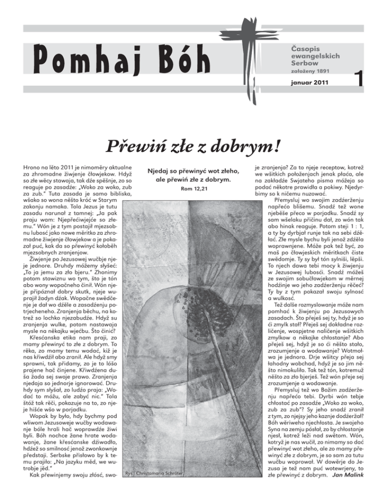 Časopis ewangelskich Serbow załoženy 1891 januar 2011 1 Přewiń złe z dobrym! Hrono na lěto 2011 je nimoměry aktualne Njedaj so přewinyć wot złeho, za zhromadne žiwjenje čłowjekow. Hdyž ale přewiń złe z dobrym. so złe wěcy stawaja, tak dźe spěšnje, zo so reaguje po zasadźe: „Woko za woko, zub Rom 12,21 za zub.“ Tuta zasada je samo bibliska, wšako so wona něšto króć w Starym zakonju namaka. Tola Jezus je tutu zasadu narunał z tamnej: „Ja pak praju wam: Njepřećiwjejće so złemu.“ Wón je z tym postajił mjezsobnu lubosć jako nowe měritko za zhromadne žiwjenje čłowjekow a je pokazał puć, kak da so přewinyć kołoběh mjezsobnych zranjenjow. Žiwjenje po Jezusowej wučbje njeje jednore. Druhdy móžemy słyšeć: „To ja jemu za zło bjeru.“ Zhonimy potom stawiznu wo tym, što je tón abo wony wopačneho činił. Wón njeje připóznał dobry skutk, njeje wuprajił žadyn dźak. Wopačne swědčenje je dał wo dźěle a zasadźenju potrjecheneho. Zranjenja běchu, na kotrež so lochko njezabudźe. Hdyž su zranjenja wulke, potom nastawaja mysle na někajku wjećbu. Što činić? Křesćanska etika nam praji, zo mamy přewinyć to złe z dobrym. To rěka, zo mamy temu wodać, kiž je nas křiwdźił abo zranił. Ale hdyž smy sprawni, tak přidamy, zo je to lóšo prajene hač činjene. Křiwdźena duša žada sej swoje prawo. Zranjenja njedaja so jednorje ignorować. Druhdy sym słyšał, zo ludźo praja: „Wodać to móžu, ale zabyć nic.“ Tola štóž tak rěči, pokazuje na to, zo njeje hišće wšo w porjadku. Wopak by było, hdy bychmy pod wliwom Jezusoweje wučby wodawanje bóle hrali hač woprawdźe žiwi byli. Bóh nochce žane hrate wodawanje, žane křesćanske dźiwadło, hdźež so smilnosć jenož zwonkownje předstaji. Serbske přisłowo by k temu prajiło: „Na jazyku měd, we wutrobje jěd.“ Kak přewinjemy swoju złósć, swo- Rys.: Christamaria Schröter je zranjenja? Za to njeje receptow, kotrež we wšitkich połoženjach jenak płaća, ale na zakładźe Swjateho pisma móžeja so podać někotre prawidła a pokiwy. Njedyrbimy so k ničemu nuzować. Přemysluj wo swojim zadźerženju napřećo blišemu. Snadź tež wone njeběše přeco w porjadku. Snadź sy sam wšelaku přičinu dał, zo wón tak abo hinak reaguje. Potom steji 1 : 1, a ty by dyrbjał runje tak na sebi dźěłać. Złe mysle bychu byli jenož zdźěla woprawnjene. Móže pak tež być, zo maš po čłowjeskich měritkach čiste swědomje. Ty sy był tón sylniši, lěpši. To njech dawa tebi mocy k žiwjenju w Jezusowej lubosći. Snadź móžeš ze swojim sobučłowjekom w měrnej hodźinje wo jeho zadźerženju rěčeć? Ty by z tym pokazał swoju sylnosć a wulkosć. Tež dalše rozmyslowanje móže nam pomhać k žiwjenju po Jezusowych zasadach. Što přeješ sej ty, hdyž je so ći zmylk stał? Přeješ sej dokładne rozličenje, wospjetne naličenje wšitkich zmylkow a někajke chłostanje? Abo přeješ sej, hdyž je so ći něšto stało, zrozumjenje a wodawanje? Wotmołwa je jednora. Drje wšitcy přeja sej łahodny wobchad, hdyž je so jim něšto nimokuliło. Tak tež tón, kotremuž něšto za zło bjerješ. Tež wón přeje sej zrozumjenje a wodawanje. Přemysluj tež wo Božim zadźerženju napřećo tebi. Dyrbi wón tebje chłostać po zasadźe „Woko za woko, zub za zub“? Sy jeho snadź zranił z tym, zo njejsy jeho kaznje dodźeržał? Bóh wěriweho njechłosta. Je swojeho Syna na zemju pósłał, zo by chłostanje njesł, kotrež leži nad swětom. Wón, kotryž je nas wučił, zo nimamy so dać přewinyć wot złeho, ale zo mamy přewinyć złe z dobrym, je so sam za tutu wučbu woprował. W dowěrje do Jezusa je tež nam puć wotewrjeny, to złe přewinyć z dobrym. Jan Malink januar 2011 Lube dźěći! Přeju wam žohnowane a strowe nowe lěto. Hesło na lěto 2011 steji w Lisće Pawoła na Romskich na 12. stawje. Je so tu w hódančku schowało. Pytajće słowa a markěrujće je. Zestajće ze słowow potom hesło. Wjele wjesela přeje Gabriela Gruhlowa (Wuhódanje w přichodnym čisle) C Z Ł E H O Č Z M P D B G A T D I Ł U Ř N L S Z I P J E Ó E J M O N W O T W G W Dožiwjenje w južnych Čechach Na druhej njedźeli našeho kupjeloweho přebywanja w nowembru 2010 w kupjeli „Aurora“ w Třebonju w južnych Čechach běchmy so na tafli we hłownej chódbje na wozjewjenje Husoweje cyrkwje dohladali. Na nim přeprošachu pacientow kupjelow na njedźelnu Božu słužbu. Byrnjež hižo pózdnja nazyma była, bě wjedro chětro přijomne. Słónco sćeleše swoje pruhi na zemju a powohrěwa nas ducy k Husowej cyrkwi. Wosrjedź małeho parka ju namakachmy. W 9 hodź. započa so Boža słužba. Zastupiwši do cyrkwje, přisydnychmy so kemšerjam. Jedyn z nas wobknježeše serbšćinu, wza sej wupołožene spěwarske, spěwaše kěrluše z čěskimi wěriwymi a zrozumi tež něštožkuli wot prědowanja. My bjez znajomosćow serbskeje rěče njemóžachmy sej wobsah wuswětlić. Přiwšěm pak Boža słužba hłuboko na nas skutkowaše. Po kemšach chcychmy so do kupjelow wróćić, tola farar k nam přistupi, nas powita a přeprosy nas na zetkanje z kemšerjemi, na rozmołwu při šalce kofeja abo čaja. Wón pokaza nam starožitne wudaće biblije w němskej rěči. Rozmołwjachmy so z kemšerjomaj, kotrajž němsce rěčeštaj. Powědaštaj nam wo wosadnym žiwjenju. Přeprosyštaj nas na dalšu njedźelu, na prěni adwent. Tola njeběše nam móžno přeprošenje přiwzać, dokelž skónči so na tutej njedźeli naše přebywanje w kupjelach. Přilubichmy, zo za lěto znowa sem přijědźemy a potom zawěsće na dwěmaj njedźelomaj Božu słužbu wopytamy. Dołho spominachmy na přećelne zetkanje a zeznaće našich ewangelskich sobubratrow. Wopominachmy tež reformatora Jana Husa. Na dompuću, hdyž přez Tábor jědźechmy, wjele wo nim zhonichmy. Jan Hus narodźi so najskerje w lěće 1372. W Betlehemskej kapałce w Pra