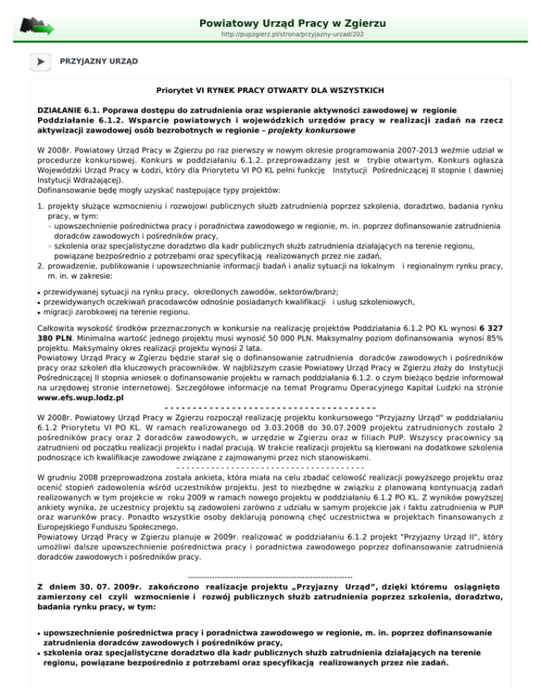 Powiatowy Urząd Pracy w Zgierzu http://pupzgierz.pl/strona/przyjazny-urzad/202 PRZYJAZNY URZĄD Priorytet VI RYNEK PRACY OTWARTY DLA WSZYSTKICH DZIAŁANIE 6.1. Poprawa dostępu do zatrudnienia oraz wspieranie aktywności zawodowej w regionie Poddziałanie 6.1.2. Wsparcie powiatowych i wojewódzkich urzędów pracy w realizacji zadań na rzecz aktywizacji zawodowej osób bezrobotnych w regionie – projekty konkursowe W 2008r. Powiatowy Urząd Pracy w Zgierzu po raz pierwszy w nowym okresie programowania 2007-2013 weźmie udział w procedurze konkursowej. Konkurs w poddziałaniu 6.1.2. przeprowadzany jest w trybie otwartym. Konkurs ogłasza Wojewódzki Urząd Pracy w Łodzi, który dla Priorytetu VI PO KL pełni funkcję Instytucji Pośredniczącej II stopnie ( dawniej Instytucji Wdrażającej). Dofinansowanie będę mogły uzyskać następujące typy projektów: 1. projekty służące wzmocnieniu i rozwojowi publicznych służb zatrudnienia poprzez szkolenia, doradztwo, badania rynku pracy, w tym: upowszechnienie pośrednictwa pracy i poradnictwa zawodowego w regionie, m. in. poprzez dofinansowanie zatrudnienia doradców zawodowych i pośredników pracy, szkolenia oraz specjalistyczne doradztwo dla kadr publicznych służb zatrudnienia działających na terenie regionu, powiązane bezpośrednio z potrzebami oraz specyfikacją realizowanych przez nie zadań, 2. prowadzenie, publikowanie i upowszechnianie informacji badań i analiz sytuacji na lokalnym i regionalnym rynku pracy, m. in. w zakresie: ❍ ❍ ● ● ● przewidywanej sytuacji na rynku pracy, określonych zawodów, sektorów/branż; przewidywanych oczekiwań pracodawców odnośnie posiadanych kwalifikacji i usług szkoleniowych, migracji zarobkowej na terenie regionu. Całkowita wysokość środków przeznaczonych w konkursie na realizację projektów Poddziałania 6.1.2 PO KL wynosi 6 327 380 PLN. Minimalna wartość jednego projektu musi wynosić 50 000 PLN. Maksymalny poziom dofinansowania wynosi 85% projektu. Maksymalny okres realizacji projektu wynosi 2 lata. Powiatowy Urząd Pracy w Zgierzu będzie starał się o dofinansowanie zatrudnienia doradców zawodowych i pośredników pracy oraz szkoleń dla kluczowych pracowników. W najbliższym czasie Powiatowy Urząd Pracy w Zgierzu złoży do Instytucji Pośredniczącej II stopnia wniosek o dofinansowanie projektu w ramach poddziałania 6.1.2. o czym bieżąco będzie informował na urzędowej stronie internetowej. Szczegółowe informacje na temat Programu Operacyjnego Kapitał Ludzki na stronie www.efs.wup.lodz.pl -------------------------------------W 2008r. Powiatowy Urząd Pracy w Zgierzu rozpoczął realizację projektu konkursowego "Przyjazny Urząd" w poddziałaniu 6.1.2 Priorytetu VI PO KL. W ramach realizowanego od 3.03.2008 do 30.07.2009 projektu zatrudnionych zostało 2 pośredników pracy oraz 2 doradców zawodowych, w urzędzie w Zgierzu oraz w filiach PUP. Wszyscy pracownicy są zatrudnieni od początku realizacji projektu i nadal pracują. W trakcie realizacji projektu są kierowani na dodatkowe szkolenia podnoszące ich kwalifikacje zawodowe związane z zajmowanymi przez nich stanowiskami. -------------------------------------W grudniu 2008 przeprowadzona została ankieta, która miała na celu zbadać celowość realizacji powyższego projektu oraz ocenić stopień zadowolenia wśród uczestników projektu. Jest to niezbędne w związku z planowaną kontynuacją zadań realizowanych w tym projekcie w roku 2009 w ramach nowego projektu w poddziałaniu 6.1.2 PO KL. Z wyników powyższej ankiety wynika, że uczestnicy projektu są zadowoleni zarówno z udziału w samym projekcie jak i faktu zatrudnienia w PUP oraz warunków pracy. Ponadto wszystkie osoby deklarują ponowną chęć uczestnictwa w projektach finansowanych z Europejskiego Funduszu Społecznego. Powiatowy Urząd Pracy w Zgierzu planuje w 2009r. realizować w poddziałaniu 6.1.2 projekt "Przyjazny Urząd II", który umożliwi dalsze upowszechnienie pośrednictwa pracy i poradnictwa zawodowego poprzez dofinansowanie zatrudnienia doradców zawodowych i pośredników pracy. -------------------------------------------------------------Z dniem 30. 07. 2009r. zakończono realizacje projektu „Przyjazny Urząd”, dzięki któremu osiągnięto zamierzony cel czyli wzmocnienie i rozwój publicznych służb zatrudnienia poprzez szkolenia, doradztwo, badania rynku pracy, w tym: ● ● upowszechnienie pośrednictwa pracy i poradnictwa zawodowego w regionie, m. in. poprzez dofinansowanie zatrudnienia doradców zawodowych i pośredników pracy, szkolenia oraz specjalistyczne doradztwo dla kadr publicznych służb zatrudnienia działających na terenie regionu, powiązane bezpośrednio z potrzebami oraz specyfikacją realizowanych przez nie zadań. W ramach projektu w PUP w Zgierzu i w Filiach zatrudnionych zostało 4 pracowników (2 doradców zawodowych i 2 pośredników pracy). Efekty tego projektu stały się podstawą do realizacji w 2009r. projektu „Przyjazny Urząd II”. --------------------------------------------------------------