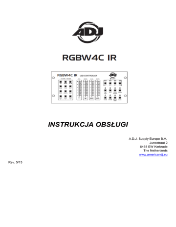 INSTRUKCJA OBSŁUGI A.D.J. Supply Europe B.V. Junostraat 2 6468 EW Kerkrade The Netherlands www.americandj.eu Rev. 5/15 ©2013 ADJ Products, LLC wszystkie prawa zastrzeżone. Informacje, specyfikacje, rysunki, zdjęcia oraz instrukcje zawarte w niniejszej instrukcji mogą ulec zmianie bez wcześniejszego powiadomienia. Produkty marki ADJ, logo LLC oraz nazwy i numery identyfikujące produkty opisane w niniejszym dokumencie stanowią znak handlowy ADJ Products, LLC. Zgłoszona ochrona praw autorskich obejmuje wszelkie formy i wszelkie kwestie dotyczące materiałów i informacji podlegających ochronie prawem autorskim, dozwolone obecnie przez obowiązujące ustawy bądź rozstrzygnięcia sądowe. Nazwy produktów użyte w niniejszym dokumencie mogą stanowić znaki towarowe bądź zarejestrowane znaki towarowe produkujących je spółek i zostają niniejszym prawnie uznane. Wszelkie marki oraz nazwy produktów nie pochodzące od ADJ Products, LLC, stanowią znaki towarowe lub zarejestrowane znaki towarowe odpowiednich, produkujących je spółek. ADJ Products, LLC oraz wszystkie powiązane z nią spółki wyłączają niniejszym wszelką swoją odpowiedzialność za szkody we własności, sprzęcie, budynkach lub szkody elektryczne, za obrażenia poniesione przez jakiekolwiek osoby, jak też za bezpośrednie lub pośrednie straty ekonomiczne związane z lub zależne od użycia jakichkolwiek informacji zawartych w niniejszym dokumencie, oraz/lub wynikłe z niewłaściwego, niebezpiecznego, niepełnego lub niestarannego montażu, instalacji, konfiguracji osprzętu oraz działania opisanych tutaj produktów. A.D.J. Supply Europe B.V. - www.americandj.eu - RGBW 4C IR Podręcznik Użytkownika Strona 2 Spis treści INFORMACJE OGÓLNE ............................................................................................................................................................ 4 INSTRUKCJE OGÓLNE .............................................................................................................................................................. 4 CECHY:..................................................................................................................................................................................... 4 USTAWIENIA DMX .................................................................................................................................................................. 4 PRZEŁĄCZNIKI I FUNKCJE ........................................................................................................................................................ 6 PRZEŁĄCZNIKI I FUNKCJE - TYLNY PANEL ................................................................................................................................ 7 DZIAŁANIE ............................................................................................................................................................................... 8 TABELA CHASE ........................................................................................................................................................................ 9 STEROWNIK ADJ LED RC2 ..................................................................................................................................................... 10 SPECYFIKACJE ........................................................................................................................................................................ 12 ROHS - Ważny wkład w ochronę środowiska ....................................................................................................................... 13 WEEE – Utylizacja odpadów elektrycznych i elektronicznych .............................................................................................. 14 UWAGI .................................................................................................................................................................................. 15 A.D.J. Supply Europe B.V. - www.americandj.eu - RGBW 4C IR Podręcznik Użytkownika Strona 3 INOZIONE INFORMACJE OGÓLNE Wypakowanie: Dziękujemy za zakup efektu RGBW 4C IR firmy ADJ Products, LLC. Każdy egzemplarz RGBW 4C IR został gruntownie przetestowany, co jest gwarancją jego prawidłowego funkcjonowania. Należy dokładnie sprawdzić czy opakowanie nie posiada uszkodzeń powstałych w czasie transportu. W razie stwierdzenia uszkodzenia opakowania, dokładnie sprawdź, czy nie nastąpiło uszkodzenie sprzętu oraz upewnij się, że wszystkie części konieczne do obsługi urządzenia przybyły w stanie nienaruszonym. W razie stwierdzenia uszkodzeń lub braku części, należy skontaktować się z wsparciem klienta poprzez nasz bezpłatny numer. Prosimy o taki kontakt przed podjęciem decyzji o zwrocie urządzenia do sprzedawcy. Wstęp: RGBW 4C IR to 32 kanałowy sterownik RGB, RGBW lub RGBA LED. Dzięki czterem przyciskom efektów sterownikiem możemy kontrolować aż do 8 urządzeń lub grup urządzeń. Panel sterowania zawiera: 9 przycisków Koloru Statecznego/Efektu Chase, które posiadają wgrane programy kolorów i programy chase, 3 przyciski preset do programowania kolorów, 4 wielofunkcyjne suwaki do kontrolowania intensywności RGBW, ale także prędkości programu, czasu przenikania i master dimer. Jest również 8 przycisków do wyboru trybu pracy, w tym Fade RGB, Auto Run, Makra Kolorów, Chase, Reakcja na Dźwięk, Strobowanie, Manualne RGBW oraz tryby Wygaszania Blackout. RGBW 4C IR jest jednym z najprostszych i najbardziej wszechstronnych sterowników oświetlenia obecnych obecnie na rynku. Stanowi idealne rozwiązanie dla DJów, klubów, barów czy pubów i każdego, kto chce w łatwy sposób sterować oświetleniem Par, Bar, Flood czy Panelami. Obsługa klienta: W razie jakichkolwiek problemów, prosimy o kontakt z zaufanym punktem sprzedaży American Audio. Istnieje również mo
