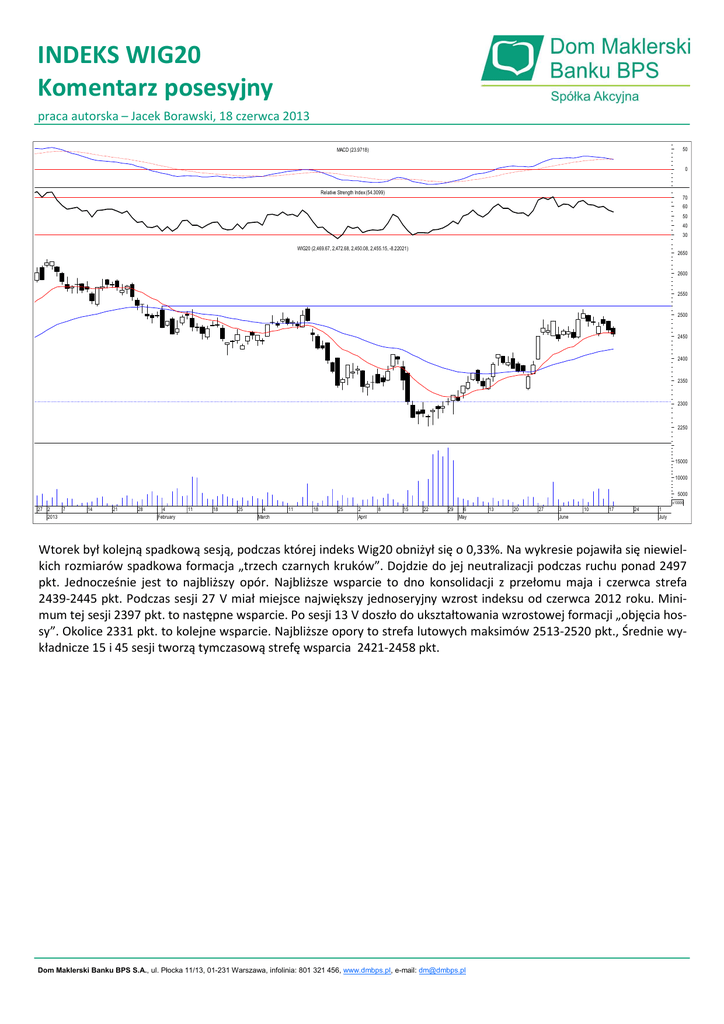 INDEKS WIG20 Komentarz posesyjny praca autorska – Jacek Borawski, 18 czerwca 2013 50 MACD (23.9718) 0 Relative Strength Index (54.3099) 70 60 50 40 30 WIG20 (2,469.67, 2,472.68, 2,450.08, 2,455.15, -8.22021) 2650 2600 2550 2500 2450 2400 2350 2300 2250 15000 10000 5000 x10000 27 2 7 2013 14 21 28 4 February 11 18 25 4 March 11 18 25 2 April 8 15 22 29 6 May 13 20 27 3 June 10 17 24 1 July Wtorek był kolejną spadkową sesją, podczas której indeks Wig20 obniżył się o 0,33%. Na wykresie pojawiła się niewielkich rozmiarów spadkowa formacja „trzech czarnych kruków”. Dojdzie do jej neutralizacji podczas ruchu ponad 2497 pkt. Jednocześnie jest to najbliższy opór. Najbliższe wsparcie to dno konsolidacji z przełomu maja i czerwca strefa 2439-2445 pkt. Podczas sesji 27 V miał miejsce największy jednoseryjny wzrost indeksu od czerwca 2012 roku. Minimum tej sesji 2397 pkt. to następne wsparcie. Po sesji 13 V doszło do ukształtowania wzrostowej formacji „objęcia hossy”. Okolice 2331 pkt. to kolejne wsparcie. Najbliższe opory to strefa lutowych maksimów 2513-2520 pkt., Średnie wykładnicze 15 i 45 sesji tworzą tymczasową strefę wsparcia 2421-2458 pkt. Dom Maklerski Banku BPS S.A., ul. Płocka 11/13, 01-231 Warszawa, infolinia: 801 321 456, www.dmbps.pl, e-mail: [email protected] INDEKS WIG20 Komentarz posesyjny praca autorska – Jacek Borawski, 18 czerwca 2013 Dom Maklerski Banku BPS SA ul. Płocka 11 /13 01-231 Warszawa, tel.: +48 22 53 95 555, fax.: +48 22 53 95 556 www.dmbps.pl [email protected] Biuro Analiz i Doradztwa Inwestycyjnego: Departament Operacji: Łukasz Kopeć - przemysł elektromaszynowy, górnictwo, Dyrektor Biura Analiz i Doradztwa Inwestycyjnego [email protected] tel.: (22) 53 95 527 Piotr Majka, MPW Dyrektor Departamentu Operacji [email protected] Tel.: (22) 53 95 540 Bogdan Dzimira, MPW, Doradca Inwestycyjny [email protected] Tel.: (22) 53 95 523 Marcin Stebakow, MPW – handel, przemysł spożywczy [email protected] tel.: (22) 53 95 548 Kamil Artyszuk – obligacje [email protected] tel.: (22) 53 95 535 Damian Szparaga – MPW [email protected] tel.: (22) 53 95 516 Analitycy techniczni: Jacek Borawski Biuro Sprzedaży: Mirosław Sobczak Dyrektor Biura Sprzedaży [email protected] Jan Woźniak, MPW [email protected] tel.: (22) 53 95 536 Artur Kobos, MPW [email protected] Tel.: (22) 53 95 511 Bartosz Szaniawski [email protected] tel.: (22) 53 95 525 Lech Kucharski [email protected] tel.: (22) 53 95 522 Krzysztof Solus [email protected] tel.: (22) 53 95 559 tel.: (22) 53 95 553 Beata Zbrzezna, MPW [email protected] tel.: (22) 53 95 544 Wyjaśnienia dotyczące stosowanej terminologii fachowej i wskaźników: MACD (Moving Average Convergence / Divergence) – wskaźnik badający zbieżność i rozbieżność średnich ruchomych; jest różnicą wartości długoterminowej i krótkoterminowej średniej wykładniczej; wykorzystywany do badania sygnałów kupna i sprzedaży akcji RSI (Relative Strength Index) – wskaźnik siły względnej; oscylator określający siłę trendu STS (Stochastic Oscillator) – oscylator stochastyczny; wskaźnik momentum używany do porównania cen zamknięcia do zakresu cen w danym okresie Opracowanie wyraża wiedzę oraz poglądy jego autorów według stanu na dzień sporządzenia niniejszego opracowania. Materiał został sporządzony z zachowaniem należytej staranności i rzetelności przy zachowaniu zasad metodologicznej poprawności na podstawie ogólnodostępnych informacji, w dniu publikacji opracowania, pozyskanych ze źródeł wiarygodnych dla Domu Maklerskiego Banku BPS S.A. Dom Maklerski Banku BPS S.A. nie gwarantuje ich kompletności i dokładności. Organem sprawującym nadzór nad działalnością Domu Maklerskiego Banku BPS S.A. jest Komisja Nadzoru Finansowego z siedzibą w Warszawie, przy Placu Powstańców Warszawy 1. Informacje zawarte w niniejszym raporcie nie stanowią rekomendacji w rozumieniu Rozporządzenia Ministra Finansów z 19 października 2005 roku w sprawie informacji stanowiących rekomendacje dotyczące instrumentów finansowych, ich emitentów lub wystawców (Dz. U. z 19 października 2005 r. Nr 206, poz. 1715). DM Banku BPS SA nie ponosi odpowiedzialności za decyzje inwestycyjne podjęte na podstawie niniejszego opracowania ani za szkody poniesione w wyniku tych decyzji inwestycyjnych. Powielanie bądź publikowanie w jakiejkolwiek formie niniejszego opracowania, lub jego części, oraz zwartych w nim zaleceń, oraz wykorzystywanie materiału do własnych opracowań celem publikacji, bez pisemnej zgody DM Banku BPS S.A. jest zabronione. Niniejsze opracowanie stanowi publikację handlową i jest prawnie chronione zgodnie z Ustawą z 4 lutego 1994 r. o prawie autorskim i prawach pokrewnych (Dz. U. 1994 nr 24 poz. 83 z późn. zm.). Jest prawdopodobne, iż DM Banku BPS S.A. świadczył, świadczy lub będzie świadczył usługi na rzecz przedsiębiorców i innych podmiotów wymienionych w niniejszym opracowaniu. DM Banku BPS S.A., jego akcjonariusze i pracownicy mogą posiadać długie lub krótkie pozycje w akcjach emitentów lub innych instrumentach finansowych powiązanych z akcjami emitentów wymienionych w opracowaniu. DM Banku BPS S.A. pełni funkcję animatora emitenta dla następujących spółek: Alterco, B3System, EMC Instytut Medyczny, Gant. Dom Maklerski Banku BPS S.A., ul. Płocka 11/13, 01-231 Warszawa, infolinia: 801 321 456, www.dmbps.pl, e-mail: [email protected]