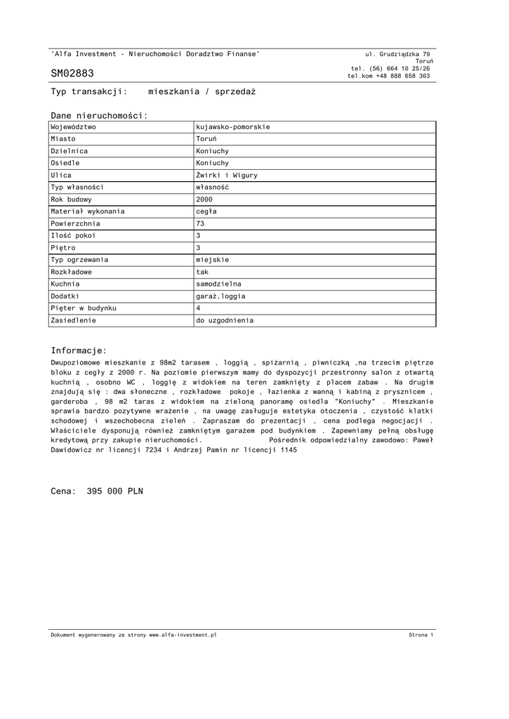 'Alfa Investment - Nieruchomości Doradztwo Finanse' SM02883 Typ transakcji: ul. Grudziądzka 79 Toruń tel. (56) 664 10 25/26 tel.kom +48 888 658 303 mieszkania / sprzedaż Dane nieruchomości: Województwo kujawsko-pomorskie Miasto Toruń Dzielnica Koniuchy Osiedle Koniuchy Ulica Żwirki i Wigury Typ własności własność Rok budowy 2000 Materiał wykonania cegła Powierzchnia 73 Ilość pokoi 3 Piętro 3 Typ ogrzewania miejskie Rozkładowe tak Kuchnia samodzielna Dodatki garaż,loggia Pięter w budynku 4 Zasiedlenie do uzgodnienia Informacje: Dwupoziomowe mieszkanie z 98m2 tarasem , loggią , spiżarnią , piwniczką ,na trzecim piętrze bloku z cegły z 2000 r. Na poziomie pierwszym mamy do dyspozycji przestronny salon z otwartą kuchnią , osobno WC , loggię z widokiem na teren zamknięty z placem zabaw . Na drugim znajdują się : dwa słoneczne , rozkładowe pokoje , łazienka z wanną i kabiną z prysznicem , garderoba , 98 m2 taras z widokiem na zieloną panoramę osiedla "Koniuchy" . Mieszkanie sprawia bardzo pozytywne wrażenie , na uwagę zasługuje estetyka otoczenia , czystość klatki schodowej i wszechobecna zieleń . Zapraszam do prezentacji , cena podlega negocjacji . Właściciele dysponują również zamkniętym garażem pod budynkiem . Zapewniamy pełną obsługę kredytową przy zakupie nieruchomości. Pośrednik odpowiedzialny zawodowo: Paweł Dawidowicz nr licencji 7234 i Andrzej Pamin nr licencji 1145 Cena: 395 000 PLN Dokument wygenerowany ze strony www.alfa-investment.pl Strona 1