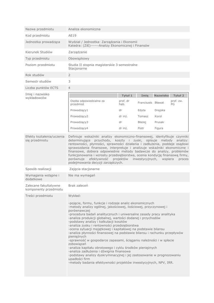 Nazwa przedmiotu Analiza ekonomiczna Kod przedmiotu AE19 Jednostka prowadząca Wydział / Jednostka: Zarządzania i Ekonomii Katedra: (ZiE)------Analizy Ekonomicznej i Finansów Kierunek Studiów Zarządzanie Typ przedmiotu Obowiązkowy Poziom przedmiotu Studia II stopnia magisterskie 3 semestralne Stacjonarne Rok studiów 2 Semestr studiów 3 Liczba punktów ECTS 4 Imię i nazwisko wykładowców Efekty kształenia/uczenia się przedmiotu Sposób realizacji Tytuł 1 Imię Nazwisko Osoba odpowiedzialna za przedmiot prof. dr hab. Franciszek Bławat Prowadzący1 dr Edyta Drajska Prowadzący2 dr inż. Tomasz Korol Prowadzący3 dr Błażej Prusak Prowadzący4 dr inż. Piotr Figura Tytuł 2 prof. zw. PG Definiuje wskaźniki analizy ekonomiczno-finansowej, identyfikuje czynniki determinujące przychody, koszty i zyski, opisuje metody analizy: rentowności, płynności, sprawności działania i zadłużenia, poddaje osądowi sprawozdania finansowe, interpretuje i analizuje wskaźniki ekonomiczne i finansowe, dobiera odpowiednie metody badawcze do analizy, problemów funkcjonowania i wzrostu przedsiębiorstwa, ocenia kondycję finansową firmy, porównuje efektywność projektów inwestycyjnych, wspiera proces podejmowania decyzji zarządczych. Zajęcia stacjonarne Wymagania wstępne i dodatkowe Nie ma wymagań Zalecane fakultatywne komponenty przedmiotu Brak zaleceń Treści przedmiotu Wykład: -pojęcie, formy, funkcje i rodzaje analiz ekonomicznych -metody analizy ogólnej, jakościowej, ilościowej, przyczynowej i porównawczej -procedura badań analitycznych i uniwersalne zasady pracy analityka -analiza produkcji globalnej, wartości dodanej i przychodów -podstawy analizy i kalkulacji kosztów -analiza zysku i rentowności przedsiębiorstwa -ocena sytuacji majątkowej i kapitałowej na podstawie bilansu -analiza płynności finansowej na podstawie bilansu i rachunku przepływów pieniężnych -sprawność w gospodarce zapasami, ściąganiu należności i w spłacie zobowiązań -analiza kapitału obrotowego i cyklu środków pieniężnych -analiza zadłużenia i dźwignia finansowa -podstawy analizy dyskryminacyjnej i jej zastosowanie w prognozowaniu upadłości firm -metody badania efektywności projektów inwestycyjnych, NPV, IRR. Ćwiczenia: -omówienie pojęcia i metod analizy ekonomicznej -obliczanie wskaźników dynamiki i stóp wzrostu dla wielkości ekonomicznych z zastosowanie różnych baz -analiza porównawcza na podstawie wzorcowych układów nierówności wskaźników ekonomicznych -analiza produkcji, wartości dodanej i przychodów ze sprzedaży -obliczanie ilościowego wpływu czynników na wzrost przychodów i kosztów -kalkulacja kosztu jednostkowego -analiza zysku i rentowności przedsiębiorstwa -ocena sytuacji majątkowej i kapitałowej na podstawie bilansu -obliczanie i interpretacja wskaźników płynności finansowej -ocena sprawności w gospodarce zapasami, w ściąganiu należności i w spłacie zobowiązań -analiza kapitału obrotowego i cyklu środków pieniężnych -analiza zadłużenia i dźwigni finansowej -ocena kondycji finansowej firmy przy pomocy wybranych metod analizy dyskryminacyjnej -obliczanie i interpretacja wskaźników: NPV, NPVR, IRR na podstawie projektów inwestycyjnych. Zalecana lista lektur Literatura podstawowa: Bławat F.: Analiza ekonomiczna, Wydawnictwo Politechniki Gdańskiej, Gdańsk 2001. Jerzemowska M. (red.): Analiza ekonomiczna w przedsiębiorstwie, PWE, Warszawa 2006. Sierpińska M., Jachna T.: Ocena przedsiębiorstwa według standardów światowych, PWN, Warszawa 2006. Literatura uzupełniajaca: Bławat F.: Podstawy analizy ekonomicznej - teoria, przykłady, pytania, zadania, Wydawnictwo Politechniki Gdańskiej 2010. Metody nauczania Wyk. 30.00 Metody i kryteria oceniania. Ćw. 30.00 Kryteria oceniania składowe Lab. 0.00 Pr. 0.00 Próg zaliczeniowy Sem. 0.00 Procent składowej oceny końcowej Egzamin pisemny 55.00% 50.00% Kolokwia w czasie semestru 55.00% 50.00% Język wykładowy Polski Praktyki zawodowe w ramach przedmiotu. Nie dotyczy Suma 60