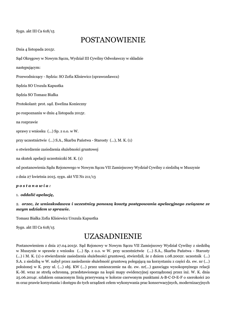 Sygn. akt III Ca 618/15 POSTANOWIENIE Dnia 4 listopada 2015r. Sąd Okręgowy w Nowym Sączu, Wydział III Cywilny Odwoławczy w składzie następującym: Przewodniczący - Sędzia: SO Zofia Klisiewicz (sprawozdawca) Sędzia SO Urszula Kapustka Sędzia SO Tomasz Białka Protokolant: prot. sąd. Ewelina Konieczny po rozpoznaniu w dniu 4 listopada 2015r. na rozprawie sprawy z wniosku (...) Sp. z o.o. w W. przy uczestnictwie (...) S.A., Skarbu Państwa - Starosty (...), M. K. (1) o stwierdzenie zasiedzenia służebności gruntowej na skutek apelacji uczestniczki M. K. (1) od postanowienia Sądu Rejonowego w Nowym Sączu VII Zamiejscowy Wydział Cywilny z siedzibą w Muszynie z dnia 27 kwietnia 2015. sygn. akt VII Ns 211/13 postanawia: 1. oddalić apelację, 2. orzec, że wnioskodawca i uczestnicy ponoszą koszty postępowania apelacyjnego związane ze swym udziałem w sprawie. Tomasz Białka Zofia Klisiewicz Urszula Kapustka Sygn. akt III Ca 618/15 UZASADNIENIE Postanowieniem z dnia 27.04.2015r. Sąd Rejonowy w Nowym Sączu VII Zamiejscowy Wydział Cywilny z siedzibą w Muszynie w sprawie z wniosku (...) Sp. z o.o. w W. przy uczestnictwie (...) S.A., Skarbu Państwa - Starosty (...) i M. K. (1) o stwierdzenie zasiedzenia służebności gruntowej, stwierdził, że z dniem 1.08.2002r. uczestnik (...) S.A. z siedzibą w W. nabył przez zasiedzenie służebność gruntową polegającą na korzystaniu z części dz. ew. nr (...) położonej w K. przy ul. (...) obj. KW (...) przez umieszczenie na dz. ew. nr(...) gazociągu wysokoprężnego relacji K.-M. wraz ze strefą ochronną, przedstawionego na kopii mapy ewidencyjnej sporządzonej przez inż. W. K. dnia 25.06.2014r. szlakiem oznaczonym linią przerywaną w kolorze czerwonym punktami A-B-C-D-E-F o szerokości 20 m oraz prawie korzystania i dostępu do tych urządzeń celem wykonywania prac konserwacyjnych, modernizacyjnych lub naprawczych oraz dokonywania kontroli gazociągu (pkt II) i orzekł, że wnioskodawca i uczestnicy ponoszą koszty postępowania związane ze swym udziałem w sprawie (pkt II). Powyższe rozstrzygnięcie zostało wydane na podstawie następujących ustaleń; W Kw nr (...) wpisana jest dz. ewid. nr(...) o pow. 0,4894 ha położona w K. stanowiąca własność M. K. (1), zaś podstawą wpisu jest umowa sprzedaży warunkowej z dnia 09.11.2006r. oraz umowa przeniesienia własności z dnia 20.12.2006r. Z treści w/w umów oraz dołączonego do aktów notarialnych wypisu miejscowego planu zagospodarowania przestrzennego miasta K. z dnia 18.10.2006r. wynika, że przedmiotowa działka w dacie jej zakupu przez uczestniczkę była niezabudowana i częściowo położona w terenach gazociągu wysokoprężnego wraz ze strefą ochronną. W Kw nr (...) wpisana jest dz. ewid. nr (...) położona w K. o pow. 0,0935 ha, stanowiąca własność Skarbu Państwa, w użytkowaniu wieczystym (...) z o.o. w W.. Przez dz. ewid. nr (...) przebiega wybudowany w latach 1971 - 1972 gazociąg wysokiego ciśnienia K. - M. jako część większej inwestycji. Inwestorem tej budowy było Przedsiębiorstwo Państwowe (...) Okręgowe Zakłady Gazownictwa z siedzibą w T.. Projekt gazociągu został opracowany przez biuro (...) we W.. Podstawą jego budowy było uzgodnienie Prezydium Powiatowej Rady Narodowej w N. z dnia 17.10.1969r., wydane na podstawie obowiązujących wówczas przepisów ustawy z dnia 31.01.1961r. Prawo budowlane. W czasie powstawania gazociągu nie zwracano się do właścicieli działki o wyrażenie zgody na prowadzenie prac budowlanych - informacje o działkach, przez które miał przebiegać gazociąg wywieszano natomiast w Urzędach Gmin i Miast, zaś właściciele nieruchomości na etapie projektowania mogli zgłaszać swoje uwagi. Z tytułu budowy gazociągu właściciele działek nie otrzymali żadnego odszkodowania. Lokalizacja gazociągu była uzgadniana z przedstawicielami (...), Okręgowego Zarządu Lasów Państwowych, Wojewódzkiego Sztabu Wojskowego, Prezydium Miejskiej Rady Narodowej w M., Nadzoru Telekomunikacyjnego w K., Zakładu (...) Zarządu Dróg Publicznych, którzy nie wyrazili sprzeciwu. Lokalizacja gazociągu została ostatecznie ustalona przez Prezydium Wojewódzkiej Rady Narodowej w K. – Wojewódzką Komisję Planowania (...) wydaniem w dniu 14.01.1970r. zaświadczenia o lokalizacji ogólnej nr(...). Po upływie okresu wywieszenia wykazów zawierających informacje o działkach, przez które miał przebiegać gazociąg, urząd administracji terenowej wydawał decyzje o lokalizacji szczegółowej i ta decyzja była równoznaczna z pozwoleniem na budowę. Po jego wybudowaniu, gazociąg został trwałe oznakowany słupkami znacznikowymi betonowymi umieszczonymi w ziemi na wysokości około 70 80 cm nad powierzchnią ziemi, których końcówki pomalowano kolorem czerwonym. Wybudowany gazociąg został zagazowany i oddany do eksploatacji w drugiej połowie 1972r. i przejęty na majątek Przedsiębiorstwa Państwowego Zakładów (...) w T., Zakładu (...) w J. na podstawie dowodu OT (...) w dniu 31.07.1972r. Od tego czasu urządzenie to podlegało stałym i systematycznym okresowym kontrolom średnio co trzy miesiące. Kontrole przeprowadzano na podstawie polecenia wykonania kontroli zgodnie z harmonogramem opracowanym przez kierownika rozdzielni gazu w K. i polegały na tym, że uprawniony pracownik przechodził trasę gazociągu w celu sprawdzenia, czy nie występują jakieś nieszczelności, ewentualnie samowole budowlane. Kontrole były przeprowadzane przy pomocy urządzeń wykrywających nieszczelność, oraz poprzez ogląd działki. Przedmiotowa działka jest ogrodzona z trzech stron ogrodzeniem siatkowym z siatki leśnej, posadowionej na słupkach. Od strony ulicy (...) działka ta graniczy z pasem drogowym, jednakże pomiędzy pasem drogowym, a działką uczestniczki nie ma żadnego ogrodzenia, natomiast w pasie drogowym na gruncie istnieje na całej szerokości działki uczestniczki, ogrodzenie wykonane cz