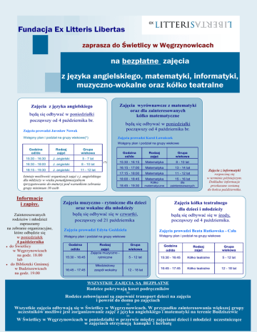 Fundacja Ex Litteris Libertas zaprasza do Świetlicy w Węgrzynowicach na bezpłatne zajęcia z języka angielskiego, matematyki, informatyki, muzyczno-wokalne oraz kółko teatralne Zajęcia wyrównawcze z matematyki oraz dla zainteresowanych kółko matematyczne Zajęcia z języka angielskiego będą się odbywać w poniedziałki począwszy od 4 października br. będą się odbywać w poniedziałki począwszy od 4 października br. Zajęcia prowadzi Jarosław Nowak Wstępny plan i podział na grupy wiekowe(*) Zajęcia prowadzi Karol Ławniczek Wstępny plan i podział na grupy wiekowe Godzina od/do Rodzaj zajęć Grupa wiekowa 15:30 - 16:30 J. angielski 5 - 7 lat 16:30 - 18:00 J. angielski 8 - 10 lat 18:15 - 19:30 J. angielski 11 - 12 lat (*) Istnieje możliwość organizacji zajęć z j. angielskiego dla młdzieży w wieku ponadgimnazjalnym (przygotowanie do matury) pod warunkiem zebrania grupy minimum 10 osób Informacje i zapisy. Zainteresowanych rodziców i młodzież zapraszamy na zebranie organizacyjne, które odbędzie się w poniedziałek 4 października do Świetlicy w Węgrzynowicach na godz. 18.00 lub do Biblioteki Gminnej w Budziszewicach na godz. 19.00 Godzina Rodzaj Grupa od/do zajęć wiekowa Wstępny plan i podział na grupy wiekowe ( * ) 15:30 - 16:15 Matematyka 8 - 10 lat 16:15 - 17:00 Matematyka 13 - 14 lat 17:15 - 18:00 Matematyka 11 - 12 lat 18:00 - 18:45 Matematyka 15 - 16 lat 18:45 - 19:30 Kółko matematyczne dla zainteresowanych Zajęcia muzyczno - rytmiczne dla dzieci oraz wokalne dla młodzieży będą się odbywać się w czwartki, począwszy od 21 października Zajęcia z informatyki rozpoczną się w terminie późniejszym. Dokładne informacje przekazane zostaną do końca października. Zajęcia kółka teatralnego dla dzieci i młodzieży będą się odbywać się w środy, począwszy od 4 października. Zajęcia prowadzi Edyta Goździela Zajęcia prowadzi Beata Rutkowska - Cała Wstępny plan i podział na grupy wiekowe Wstępny plan i podział na grupy wiekowe Godzina od/do 15:30 - 16:45 Rodzaj zajęć Zajęcia muzyczno rytmiczne 16:45 - 17:45 Młodzieżowy zespół wokalny Grupa wiekowa Godzina od/do Rodzaj zajęć Grupa wiekowa 5 - 12 lat 15:30 - 16:45 Kółko teatralne 5 - 12 lat 12 - 18 lat 16:45 - 17:45 Kółko teatralne 12 - 18 lat WSZYSTKIE ZAJĘCIA SĄ BEZPŁATNE Rodzice pokrywają koszt podręczników ∞ Rodzice zobowiązani są zapewnić transport dzieci na zajęcia i powrót do domu po zajęciach ∞ Wszystkie zajęcia odbywają się w Świetlicy w Węgrzynowicach. W przypadku zainteresowania większej grupy uczestników możliwe jest zorganizowanie zajęć z języka angielskiego i matematyki na terenie Budziszewic ∞ W Świetlicy w Węgrzynowicach w poniedziałki w przerwie między zajęciami dzieci i młodzież uczestniczące w zajęciach otrzymują kanapki i herbatę