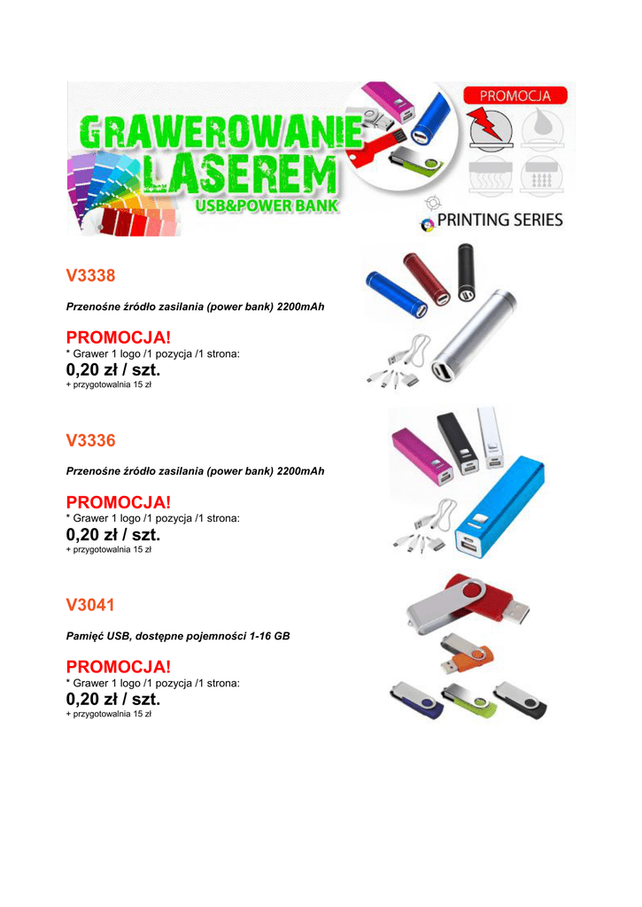 V3338 Przenośne źródło zasilania (power bank) 2200mAh PROMOCJA! * Grawer 1 logo /1 pozycja /1 strona: 0,20 zł / szt. + przygotowalnia 15 zł V3336 Przenośne źródło zasilania (power bank) 2200mAh PROMOCJA! * Grawer 1 logo /1 pozycja /1 strona: 0,20 zł / szt. + przygotowalnia 15 zł V3041 Pamięć USB, dostępne pojemności 1-16 GB PROMOCJA! * Grawer 1 logo /1 pozycja /1 strona: 0,20 zł / szt. + przygotowalnia 15 zł V3077 Pamięć USB w etui z PU, dostępne pojemności 1-16 GB PROMOCJA! * Grawer 1 logo /1 pozycja /1 strona: 0,20 zł / szt. + przygotowalnia 15 zł V3096 Pamięć USB z brelokiem do kluczy, dostępne pojemności 1-16 GB PROMOCJA! * Grawer 1 logo /1 pozycja /1 strona: 0,20 zł / szt. + przygotowalnia 15 zł V3175 Pamięć USB "klucz", dostępne pojemności 1-16 GB PROMOCJA! * Grawer 1 logo /1 pozycja /1 strona: 0,20 zł / szt. + przygotowalnia 15 zł V3176 Pamięć USB w etui z PU, dostępne pojemności 1-16 GB PROMOCJA! * Grawer 1 logo /1 pozycja /1 strona: 0,20 zł / szt. + przygotowalnia 15 zł Ceny transakcyjne netto. Promocja na usługi znakowania w/w produktów ważna do 01.09.2014.Podane ceny nie zawierają kosztów ponownego zapakowania w opakowanie indywidualne.