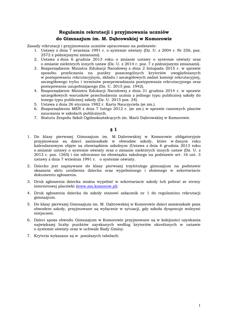 Regulamin rekrutacji i przyjmowania uczniów do Gimnazjum im. M. Dąbrowskiej w Komorowie Zasady rekrutacji i przyjmowania uczniów opracowano na podstawie: 1. Ustawy z dnia 7 września 1991 r. o systemie oświaty (Dz. U. z 2004 r. Nr 256, poz. 2572 z późniejszymi zmianami). 2. Ustawa z dnia 6 grudnia 2013 roku o zmianie ustawy o systemie oświaty oraz o zmianie niektórych innych ustaw (Dz. U. z 2014 r. poz. 7 z późniejszymi zmianami). 3. Rozporządzenie Ministra Edukacji Narodowej z dnia 2 listopada 2015 r. w sprawie sposobu przeliczania na punkty poszczególnych kryteriów uwzględnianych w postępowaniu rekrutacyjnym, składu i szczegółowych zadań komisji rekrutacyjnej, szczegółowego trybu i terminów przeprowadzania postępowania rekrutacyjnego oraz postępowania uzupełniającego (Dz. U. 2015 poz. 1942). 4. Rozporządzenie Ministra Edukacji Narodowej z dnia 31 grudnia 2014 r. w sprawie szczegółowych warunków przechodzenia ucznia z jednego typu publicznej szkoły do innego typu publicznej szkoły (Dz. U. 2015 poz. 24). 5. Ustawa z dnia 26 stycznia 1982 r. Karta Nauczyciela (ze zm.). 6. Rozporządzenia MEN z dnia 7 lutego 2012 r. (ze zm.) w sprawie ramowych planów nauczania w szkołach publicznych. 7. Statutu Zespołu Szkół Ogólnokształcących im. Marii Dąbrowskiej w Komorowie. § 1 1. Do klasy pierwszej Gimnazjum im. M. Dąbrowskiej w Komorowie obligatoryjnie przyjmowane są dzieci zamieszkałe w obwodzie szkoły, które w danym roku kalendarzowym objęte są obowiązkiem szkolnym (Ustawa z dnia 6 grudnia 2013 roku o zmianie ustawy o systemie oświaty oraz o zmianie niektórych innych ustaw (Dz. U. z 2013 r. poz. 1265) i nie odroczono im obowiązku szkolnego na podstawie art. 16 ust. 3 ustawy z dnia 7 września 1991 r. o systemie oświaty. 2. Dziecko jest zapisywane do klasy pierwszej trzyletniego gimnazjum na podstawie okazania aktu urodzenia dziecka oraz wypełnionego i złożonego w sekretariacie dokumentu zgłoszenia. 3. Druk zgłoszenia dziecka można wypełnić w sekretariacie szkoły lub pobrać ze strony internetowej placówki (www.zso.komorow.pl). 4. Druk zgłoszenia dziecka do szkoły stanowi załącznik nr 1 do regulaminu rekrutacji gimnazjum. 5. Do klasy pierwszej Gimnazjum im. M. Dąbrowskiej w Komorowie dzieci zamieszkałe poza obwodem szkoły, przyjmowane są wyłącznie w sytuacji, gdy szkoła dysponuje wolnymi miejscami. 6. Dzieci spoza obwodu Gimnazjum w Komorowie przyjmowane są w kolejności uzyskania największej liczby punktów uzyskanych według kryteriów określonych w ustawie o systemie oświaty oraz w uchwale Rady Gminy. 7. Kryteria wykazane są w poniższych tabelach: 1 Kryteria określone w ustawie o systemie oświaty: L.p . Kryterium ustawowe Dokument potwierdzający spełnianie kryterium 1. Wielodzietność rodziny kandydata Oświadczenie1 o wielodzietności rodziny kandydata 2. 3. 4 5. Niepełnosprawność kandydata Niepełnosprawność jednego z rodziców kandydata Niepełnosprawność obojga rodziców kandydata Niepełnosprawność rodzeństwa kandydata Wielodzietność rodziny oznacza rodzinę wychowującą troje i więcej dzieci (art.20b pkt 1 ustawy o systemie oświaty) Orzeczenie o potrzebie kształcenia specjalnego wydane ze względu na niepełnosprawność, orzeczenie o niepełnosprawności lub o stopniu niepełnosprawności Oryginał, notarialnie poświadczona kopia albo urzędowo poświadczony zgodnie z art. 76a § 1 Kodeksu postępowania administracyjnego odpis lub wyciąg z dokumentu lub kopia poświadczona za zgodność z oryginałem przez rodzica kandydata Orzeczenie o niepełnosprawności lub o stopniu niepełnosprawności lub orzeczenie równoważne w rozumieniu przepisów ustawy z dnia 27 sierpnia 1997 r. o rehabilitacji zawodowej i społecznej oraz zatrudnianiu osób niepełnosprawnych (Dz. U. z 2011 r. Nr 127, poz. 721, z późn. zm.) Liczba punktów 30 30 Oryginał, notarialnie poświadczona kopia albo urzędowo poświadczony zgodnie z art. 76a § 1 Kodeksu postępowania administracyjnego odpis lub wyciąg z dokumentu lub kopia poświadczona za zgodność z oryginałem przez rodzica kandydata Orzeczenia o niepełnosprawności lub o stopniu niepełnosprawności lub orzeczenia równoważne w rozumieniu przepisów ustawy z dnia 27 sierpnia 1997 r. o rehabilitacji zawodowej i społecznej oraz zatrudnianiu osób niepełnosprawnych (Dz. U. z 2011 r. Nr 127, poz. 721, z późn. zm.) 30 Oryginał, notarialnie poświadczona kopia albo urzędowo poświadczony zgodnie z art. 76a § 1 Kodeksu postępowania administracyjnego odpis lub wyciąg z dokumentu lub kopia poświadczona za zgodność z oryginałem przez rodzica kandydata Orzeczenie o niepełnosprawności lub o stopniu niepełnosprawności lub orzeczenie równoważne w rozumieniu przepisów ustawy z dnia 27 sierpnia 1997 r. o rehabilitacji zawodowej i społecznej oraz zatrudnianiu osób niepełnosprawnych (Dz. U. z 2011 r. Nr 127, poz. 721, z późn. zm.) 30 Oryginał, notarialnie poświadczona kopia albo urzędowo poświadczony zgodnie z art. 76a § 1 Kodeksu postępowania administracyjnego odpis lub wyciąg z dokumentu lub kopia poświadczona za zgodność z oryginałem przez rodzica 30 Zgodnie z Art. 20 t ust.6 ustawy o systemie oświaty, oświadczenia, składa się pod rygorem odpowiedzialności karnej za składanie fałszywych zeznań. Składający oświadczenie jest obowiązany do zawarcia w nim klauzuli następującej treści: „Jestem świadomy odpowiedzialności karnej za złożenie fałszywego oświadczenia.„Klauzula ta zastępuje pouczenie organu o odpowiedzialności karnej za składanie fałszywych zeznań. 1 2 6. 7. Samotne wychowywanie kandydata w rodzinie 2 Objęcie kandydata pieczą zastępczą Prawomocny wyrok sądu rodzinnego orzekający rozwód lub separację lub akt zgonu oraz oświadczenie 3 o samotnym wychowywaniu dziecka oraz niewychowywaniu żadnego dziecka wspólnie z jego rodzicem Oryginał, notarialnie poświadczona kopia albo urzędowo po