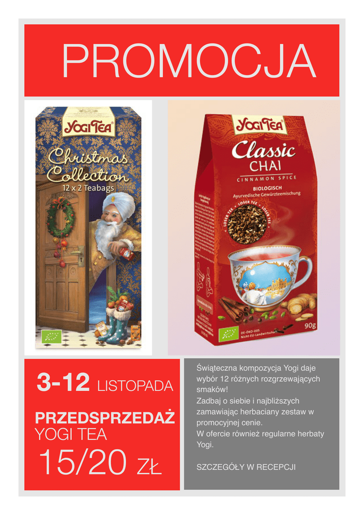 PROMOCJA 3-12 LISTOPADA PRZEDSPRZEDAŻ YOGI TEA 15/20 ZŁ Świąteczna kompozycja Yogi daje wybór 12 różnych rozgrzewających smaków! Zadbaj o siebie i najbliższych zamawiając herbaciany zestaw w promocyjnej cenie. W ofercie również regularne herbaty Yogi. SZCZEGÓŁY W RECEPCJI