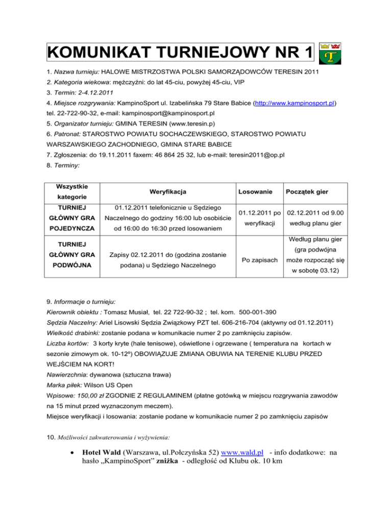 KOMUNIKAT TURNIEJOWY NR 1 1. Nazwa turnieju: HALOWE MISTRZOSTWA POLSKI SAMORZĄDOWCÓW TERESIN 2011 2. Kategoria wiekowa: mężczyźni: do lat 45-ciu, powyżej 45-ciu, VIP 3. Termin: 2-4.12.2011 4. Miejsce rozgrywania: KampinoSport ul. Izabelińska 79 Stare Babice (http://www.kampinosport.pl) tel. 22-722-90-32, e-mail: [email protected] 5. Organizator turnieju: GMINA TERESIN (www.teresin.p) 6. Patronat: STAROSTWO POWIATU SOCHACZEWSKIEGO, STAROSTWO POWIATU WARSZAWSKIEGO ZACHODNIEGO, GMINA STARE BABICE 7. Zgłoszenia: do 19.11.2011 faxem: 46 864 25 32, lub e-mail: [email protected] 8. Terminy: Wszystkie Weryfikacja kategorie TURNIEJ 01.12.2011 telefonicznie u Sędziego GŁÓWNY GRA Naczelnego do godziny 16:00 lub osobiście POJEDYNCZA od 16:00 do 16:30 przed losowaniem Losowanie Początek gier 01.12.2011 po 02.12.2011 od 9.00 weryfikacji według planu gier Według planu gier TURNIEJ GŁÓWNY GRA Zapisy 02.12.2011 do (godzina zostanie PODWÓJNA podana) u Sędziego Naczelnego (gra podwójna Po zapisach może rozpocząć się w sobotę 03.12) 9. Informacje o turnieju: Kierownik obiektu : Tomasz Musiał, tel. 22 722-90-32 ; tel. kom. 500-001-390 Sędzia Naczelny: Ariel Lisowski Sędzia Związkowy PZT tel. 606-216-704 (aktywny od 01.12.2011) Wielkość drabinki: zostanie podana w komunikacie numer 2 po zamknięciu zapisów. Liczba kortów: 3 korty kryte (hale tenisowe), oświetlone i ogrzewane ( temperatura na kortach w sezonie zimowym ok. 10-12º) OBOWIĄZUJE ZMIANA OBUWIA NA TERENIE KLUBU PRZED WEJŚCIEM NA KORT! Nawierzchnia: dywanowa (sztuczna trawa) Marka piłek: Wilson US Open Wpisowe: 150,00 zł ZGODNIE Z REGULAMINEM (płatne gotówką w miejscu rozgrywania zawodów na 15 minut przed wyznaczonym meczem). Miejsce weryfikacji i losowania: zostanie podane w komunikacie numer 2 po zamknięciu zapisów 10. Możliwości zakwaterowania i wyżywienia: Hotel Wald (Warszawa, ul.Połczyńska 52) www.wald.pl - info dodatkowe: na hasło „KampinoSport” zniżka - odległość od Klubu ok. 10 km Hotel Rest ( Mory, ul. Poznańska 33) www.resthotel.pl - info dodatkowe: na hasło: „Turniej KampinoSport” zniżka - odległość od Klubu ok 11 km Hotel Zielonki (ul. Warszawska 372 Zielonki 05-082 Stare Babice) www.hotelzielonki.pl - info dodatkowe: na hasło „Turniej KampinoSport” zniżki – odległość ok 3 km Hotel Lamberton (ul. Poznańska 492 Ołtarzew) www.lamberton.pl info dodatkowe: na hasło „KampinoSport” zniżka – odległość ok 12 km Są to hotele turniejowe, w których będą znajdowały się drabinki turniejowe, plany gier. Każdy uczestnik dokonuje rezerwacji samodzielnie. Wyżywienie: na obiekcie za dodatkową opłat: (ciepłe i zimne przekąski), napoje zimne i ciepłe. 11. Inne informacje: Oficjalne otwarcie turnieju w dniu 02.12. (piątek) o godzinie 12:00. 03.12 (sobota) organizatorzy zapraszają wszystkich uczestników turnieju na uroczystą kolację. Na terenie Klubu KampinoSport dostępne są szatnie z zapleczem sanitarnym. Do dyspozycji Uczestników Turnieju udostępniona zostanie nieodpłatnie grota solna (wstęp po wcześniejszym kontakcie z recepcją Klubu).