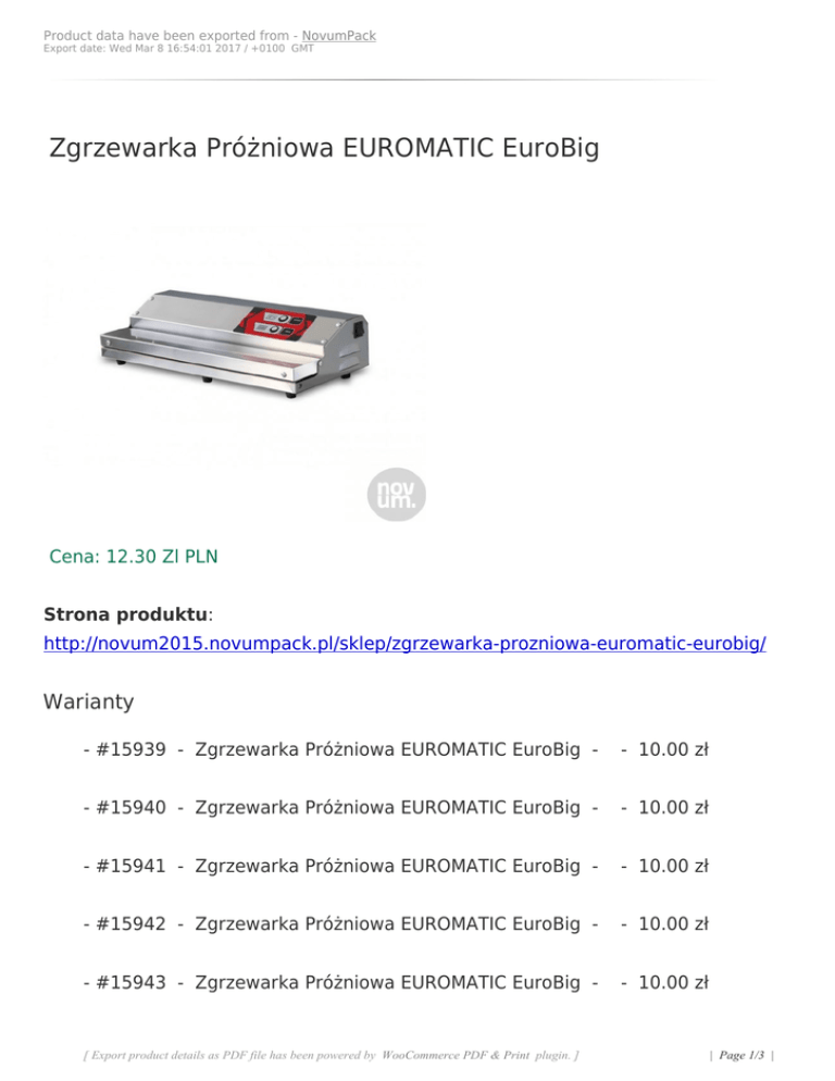 Product data have been exported from - NovumPack Export date: Wed Mar 8 16:54:01 2017 / +0100 GMT Zgrzewarka Próżniowa EUROMATIC EuroBig Cena: 12.30 Zl PLN Strona produktu: http://novum2015.novumpack.pl/sklep/zgrzewarka-prozniowa-euromatic-eurobig/ Warianty - #15939 - Zgrzewarka Próżniowa EUROMATIC EuroBig - - 10.00 zł - #15940 - Zgrzewarka Próżniowa EUROMATIC EuroBig - - 10.00 zł - #15941 - Zgrzewarka Próżniowa EUROMATIC EuroBig - - 10.00 zł - #15942 - Zgrzewarka Próżniowa EUROMATIC EuroBig - - 10.00 zł - #15943 - Zgrzewarka Próżniowa EUROMATIC EuroBig - - 10.00 zł [ Export product details as PDF file has been powered by WooCommerce PDF & Print plugin. ] | Page 1/3 | Product data have been exported from - NovumPack Export date: Wed Mar 8 16:54:01 2017 / +0100 GMT - #15944 - Zgrzewarka Próżniowa EUROMATIC EuroBig - - 10.00 zł Opis produktu Zgrzewarka Próżniowa EUROMATIC EuroBig to profesjonalna pakowarka próżniowa o długości zgrzewu 45 cm - urządzenie bardzo wszechstronne, łatwe i szybkie w użyciu. Z powodzeniem może pracować w domach, małych sklepach, restauracji czy cateringu. Zgrzewarka próżniowa EUROMATIC EuroBig jest przeznaczona do pakowania produktów spożywczych jak i technicznych. Świetnie sprawdza się również jej zastosowanie w zakładach przetwórstwa ryb, w zakładach mięsnych, drobiarskich, mleczarniach, piekarniach, przetwórstwie warzyw i owoców, a także przy pakowaniu części i podzespołów elektronicznych. Zgrzewarka próżniowa wykonana jest z wysokiej jakości stali nierdzewnej. Czynności obsługowe są bardzo proste i ograniczają się do włożenia do komory otwartej strony załadowanego woreczka, a następnie za pomocą jednego przycisku uruchomienia procesu odsysania powietrza. Gdy urządzenie odessie już całe powietrze, następuje zgrzew, a co za tym idzie uszczelnienie opakowania. Zaletami urządzenia są elastyczność , możliwość pakownia przeróżnych towarów. Krótka specyfikacja Model EUROBIG Obudowa Inox Wymiary zewnętrze [ Export product details as PDF file has been powered by WooCommerce PDF & Print plugin. ] | Page 2/3 | Product data have been exported from - NovumPack Export date: Wed Mar 8 16:54:01 2017 / +0100 GMT 470x260x130 Długość listwy grzewczej 450 mm Moc pompy Q=20 LT/MIN Waga 10 kg Moc 270 W Zasilanie 230 V/50 Hz [ Export product details as PDF file has been powered by WooCommerce PDF & Print plugin. ] | Page 3/3 |