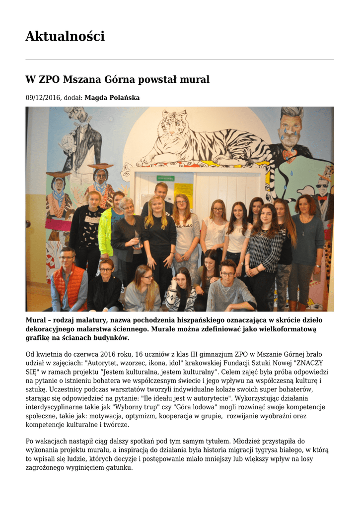 Aktualności W ZPO Mszana Górna powstał mural 09/12/2016, dodał: Magda Polańska Mural – rodzaj malatury, nazwa pochodzenia hiszpańskiego oznaczająca w skrócie dzieło dekoracyjnego malarstwa ściennego. Murale można zdefiniować jako wielkoformatową grafikę na ścianach budynków. Od kwietnia do czerwca 2016 roku, 16 uczniów z klas III gimnazjum ZPO w Mszanie Górnej brało udział w zajęciach: "Autorytet, wzorzec, ikona, idol" krakowskiej Fundacji Sztuki Nowej "ZNACZY SIĘ" w ramach projektu ”Jestem kulturalna, jestem kulturalny”. Celem zajęć była próba odpowiedzi na pytanie o istnieniu bohatera we współczesnym świecie i jego wpływu na współczesną kulturę i sztukę. Uczestnicy podczas warsztatów tworzyli indywidualne kolaże swoich super bohaterów, starając się odpowiedzieć na pytanie: "Ile ideału jest w autorytecie". Wykorzystując działania interdyscyplinarne takie jak "Wyborny trup" czy "Góra lodowa" mogli rozwinąć swoje kompetencje społeczne, takie jak: motywacja, optymizm, kooperacja w grupie, rozwijanie wyobraźni oraz kompetencje kulturalne i twórcze. Po wakacjach nastąpił ciąg dalszy spotkań pod tym samym tytułem. Młodzież przystąpiła do wykonania projektu muralu, a inspiracją do działania była historia migracji tygrysa białego, w którą to wpisali się ludzie, których decyzje i postępowanie miało mniejszy lub większy wpływ na losy zagrożonego wyginięciem gatunku. 25-26 listopada uczniowie uczestniczący w projekcie pod opieką oraz z pomocą artystów malarzy: Joanny Róg-Ociepka, Marty Koryckiej, Charliego - malarza z Hiszpanii oraz nauczycielki plastyki Anny Mrózek-Kotarskiej namalowali na ścianach zewnętrznych biblioteki szkolnej mural, imponujący nie tylko rozmiarem, ale przede wszystkim oryginalnością i mistrzowskim wykonaniem, w które wszyscy włożyli mnóstwo pracy, ale również kawał serca. Mural nie tylko ożywił szkolny korytarz, ale stał się prawdziwie bajkowym wejściem do biblioteki. 7 grudnia uroczyście otwarto muralu. W tym wydarzeniu wzięli udział wszyscy uczestnicy projektu, dyrekcja gimnazjum oraz goście honorowi: prezes Fundacji Sztuki Nowej „ZNACZY SIĘ”, Beata Czajkowska wraz z mężem oraz główny koordynator projektu, Joanna Róg-Ociepka. Pani Joanna zaznaczyła, że w nowym roku szkolnym nadal chciałaby współpracować z naszą szkołą i prowadzić warsztaty dla naszej młodzieży – informuje szkolny koordynator. Ważne dla nas były słowa pani Beaty Czajkowskiej, która podkreśliła fakt, że mural w naszej szkole jest jednym z najlepszych i najciekawszych jakie udało się namalować. Anna Mrózek-Kotarska