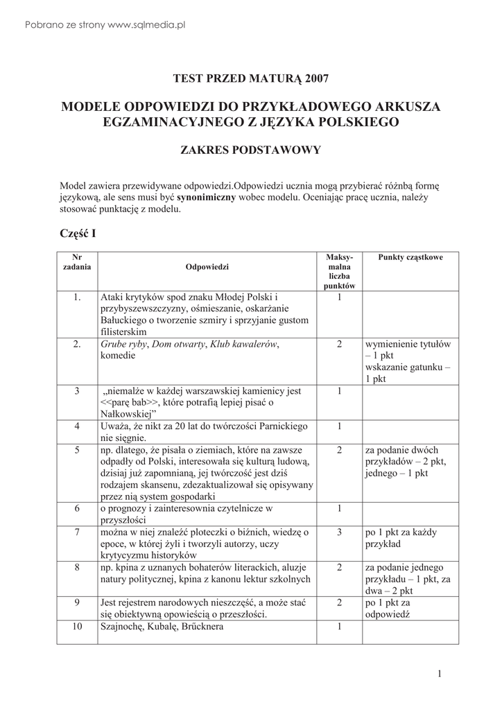Pobrano ze strony www.sqlmedia.pl TEST PRZED MATUR 2007 MODELE ODPOWIEDZI DO PRZYKŁADOWEGO ARKUSZA EGZAMINACYJNEGO Z J ZYKA POLSKIEGO ZAKRES PODSTAWOWY Model zawiera przewidywane odpowiedzi.Odpowiedzi ucznia mog przybiera ró nb form j zykow , ale sens musi by synonimiczny wobec modelu. Oceniaj c prac ucznia, nale y stosowa punktacj z modelu. Cz I Nr zadania 1. 2. 3 4 5 6 7 8 9 10 Odpowiedzi Maksymalna liczba punktów Ataki krytyków spod znaku Młodej Polski i przybyszewszczyzny, o mieszanie, oskar anie Bałuckiego o tworzenie szmiry i sprzyjanie gustom filisterskim Grube ryby, Dom otwarty, Klub kawalerów, komedie 1 „niemal e w ka dej warszawskiej kamienicy jest <<par bab>>, które potrafi lepiej pisa o Nałkowskiej” Uwa a, e nikt za 20 lat do twórczo ci Parnickiego nie si gnie. np. dlatego, e pisała o ziemiach, które na zawsze odpadły od Polski, interesowała si kultur ludow , dzisiaj ju zapomnian , jej twórczo jest dzi rodzajem skansenu, zdezaktualizował si opisywany przez ni system gospodarki o prognozy i zainteresownia czytelnicze w przyszło ci mo na w niej znale ploteczki o bi nich, wiedz o epoce, w której yli i tworzyli autorzy, uczy krytycyzmu historyków np. kpina z uznanych bohaterów literackich, aluzje natury politycznej, kpina z kanonu lektur szkolnych 1 Jest rejestrem narodowych nieszcz , a mo e sta si obiektywn opowie ci o przeszło ci. Szajnoch , Kubal , Br cknera 2 Punkty cz stkowe wymienienie tytułów – 1 pkt wskazanie gatunku – 1 pkt 1 2 za podanie dwóch przykładów – 2 pkt, jednego – 1 pkt 1 3 po 1 pkt za ka dy przykład 2 za podanie jednego przykładu – 1 pkt, za dwa – 2 pkt po 1 pkt za odpowied 2 1 1 Pobrano ze strony www.sqlmedia.pl 11 np. Teza: Dzieła ulegaj dezaktualizacji Argumenty: – twórczo ci Elizy Orzeszkowej b d interesowali si wył cznie etnolodzy – brak zainteresowania proz Parnickiego – dzi nikt nie fascynuje si Siłaczk i doktorem Judymem Wniosek: Nigdy nie mamy pewno ci, które dzieła b d wci czytane, mimo upływu czasu i stan si lektur potomnych 3 12 a 1 Cz po 1 pkt za ka d cz II I. ROZWINI CIE TEMATU (0–25 pkt) 1. Rozpoznanie wst pne (0–2) – gatunki: powie historyczna, epopeja narodowa – motyw przemiany duchowej bohatera osi konstrukcyjn obu utworów – epoki: pozytywizm, romantyzm 2. Elementy wiata przedstawionego (0–2) Potop wojna polsko-szwedzka (tzw. potop), rola Jasnej Góry (symbolika miejsca w yciu narodu i bohatera powie ci), dbało o autentyzm wydarze – mistycyzm sceny Pan Tadeusz wojny napoleo skie, przygotowanie do powstania na Litwie i wojny Napoleona z Rosj , realizm scen ukazuj cych ycie w Soplicowie – mistycyzm w scenie mierci Jacka Soplicy 3. Opis wewn trzych rozsterek bohatera Potopu, charakterystyka (0–4) – duchowe cierpienie, w tpliwo ci, niepewno , obawa o własne szcz cie i o losy ojczyzny, poczucie winy i przyczynienie si do nieszcz cia ojczyzny i Ole ki, wiadomo dopuszczenia si zdrady, boja bo a, ch odpokutowania, ufno pokładana w Naj wi tszej Pannie, rado ze spowiedzi i wyznania win, postanowienie odmiany ycia i pokuty pod wpływem kazania ojca Kordeckiego 4. ródła i skutki duchowej przemiany – porównanie obu bohaterów Potop (0–3) – miło do Ole ki, ch jej odzyskania, obudzenie si wiadomo ci narodowej, przekonanie o zdradzie Radziwiłłów, wpływ kazania ojca Kordeckiego, rola Jasnej Góry w przemianie bohatera, utwierdzenie si w woli poprawy – zmiana nazwiska, odkupienie win wobec szlachty lauda skiej, wobec króla i ojczyzny – zrehabilitowanie Kmicica podczas mszy w. listem od króla, nagrodzenie starostwem upickim 2 Pobrano ze strony www.sqlmedia.pl Pan Tadeusz (0–3) – nieszcz liwa miło do Ewy Horeszkówny powodem zapl tania si bohatera w zabójstwo i podejrzewanie go o zdrad ojczyzny, ch odkupienia win, – zmiana nazwiska, wst pienie do klasztoru, po wi cenie si dla ojczy nie, zmazanie win wobec Horeszków i kraju – po miertna rehabilitacja Jacka Soplicy w czasie mszy w, przyznanie odznaczenia Legii Honorowej 5. Funkcje motywu przemiany w tek cie Potop (0–2) – o konstrukcyjna powie ci – funkcja moralizatorska, wzór post powania, mo liwo zawrócenia z bł dnej drogi i odkupienia winy, – motyw „ku pokrzepieniu serc” – stworzenie heroicznej kreacji bohatera i jego drogi pozytywnej przemiany Pan Tadeusz (0–2) – o konstrukcyjna ł cz ca przeszło z tera niejszo ci – Jacek Soplica – symbol i nowy wzór patriotyzmu – ukazanie moralnej odnowy człowieka dzi ki miło ci do ojczyzny 6. Podsumowanie (0–5) Pełne podsumowanie – 5 pkt Dostrze enie podobie stw kreacji bohaterów, wskazanie na Pana Tadeusza jako ródło inspiracji Henryka Sienkiewicza, dostrze enie i skomentowanie podobie stw a w konstrukcji przemiany duchowej bohaterów, wskazanie na popularno motywu przemiany warchoła w patriot , moralistyczny wymiar przemiany, kształtowanie wzorca osobowego. Cz ciowe podumowanie – 2 pkt Dostrze enie podobie stw w kreacjach bohaterów, wskazanie najwa niejszych przyczyn przemian i funkcji przez nie spełnianych. Próba podsumowania – 1 pkt Dostrze enie podobie stw bohaterów. II. KOMPOZYCJA (0–5 pkt) Kompozycj wypracowania ocenia si wtedy, gdy przyznane zostały punkty za rozwini cie tematu – podporz dkowana zamysłowi funkcjonalnemu wobec tematu, spójna wewn trznie, przejrzysta i logiczna;pełna konsekwencja w układzie graficznym – 5 pkt – uprz dkowana wobec przyj tego kryterium, spójna graficzne wyodr bnienie głównych cz ci – 3 pkt – wskazuj ca na podj cie próby podporz dkowania tekstu,na ogół spójna – 1 pkt Uwaga: Je li powy sze kryteria nie zostały spełnione, nie przyznaje si punktów III. STYL (0–5 pkt) – jasny, ywy, swobodny, zgodny z zastosowan form wypowiedzi, urozmaicona leksyka – 5 pkt 3 Pobrano ze strony www.sqlmedia.pl – zgodny z zastosowan form wypowiedzi, na ogół jasny; wystarczaj ca leksyka – 3 pkt – na ogół komonikatywny, dopuszczalne schematy jezykowe – 1 pkt Uwa